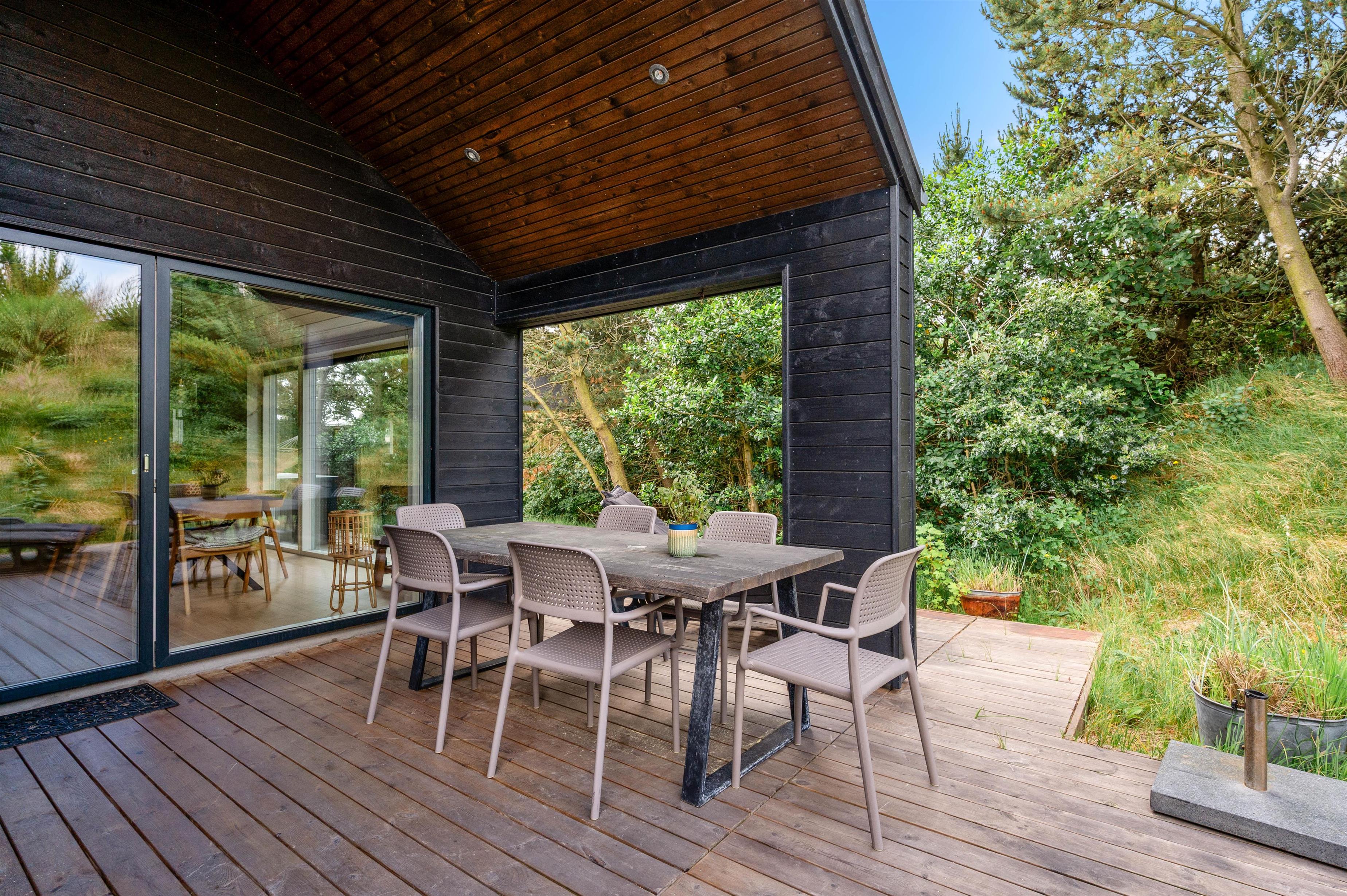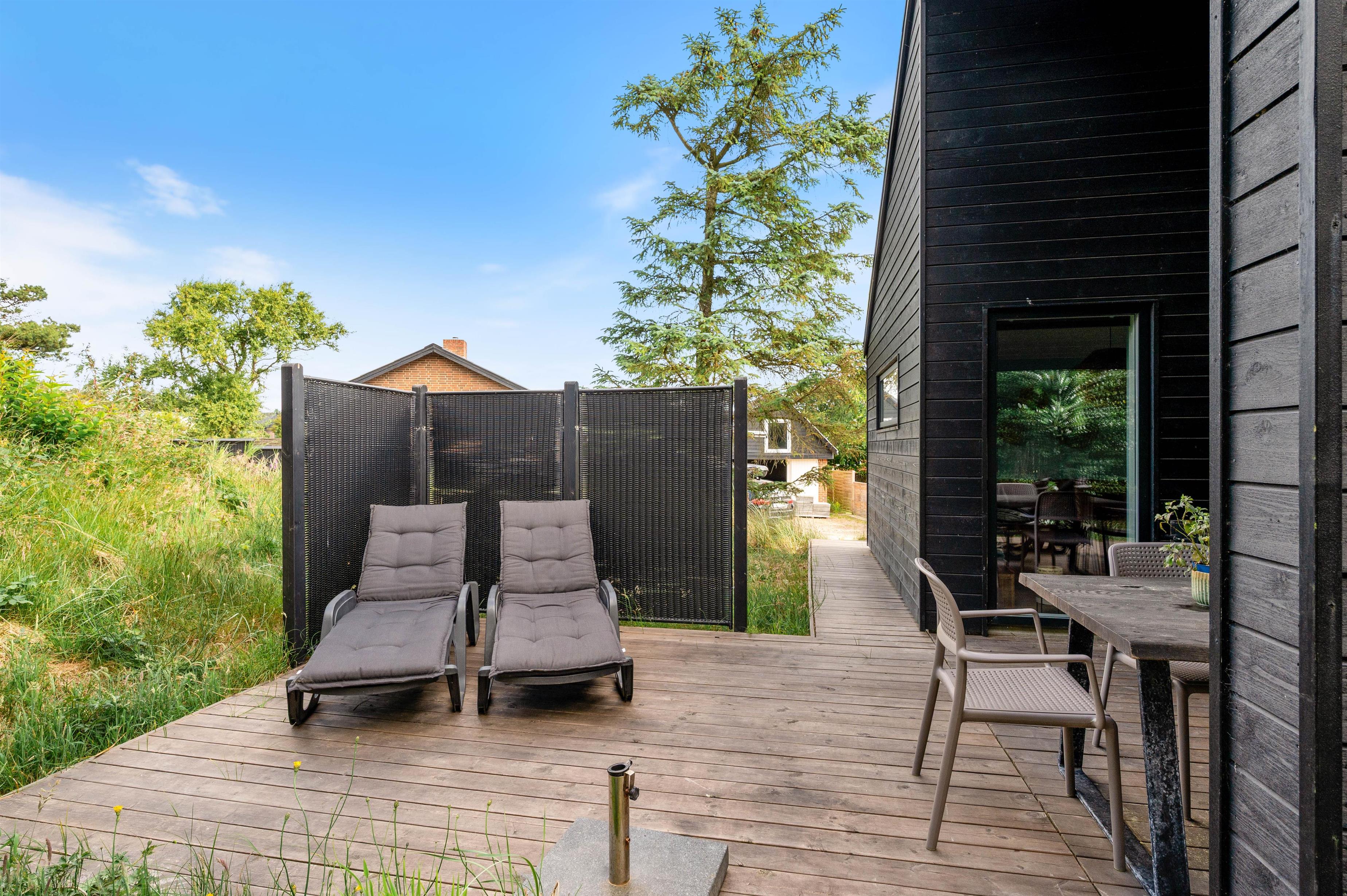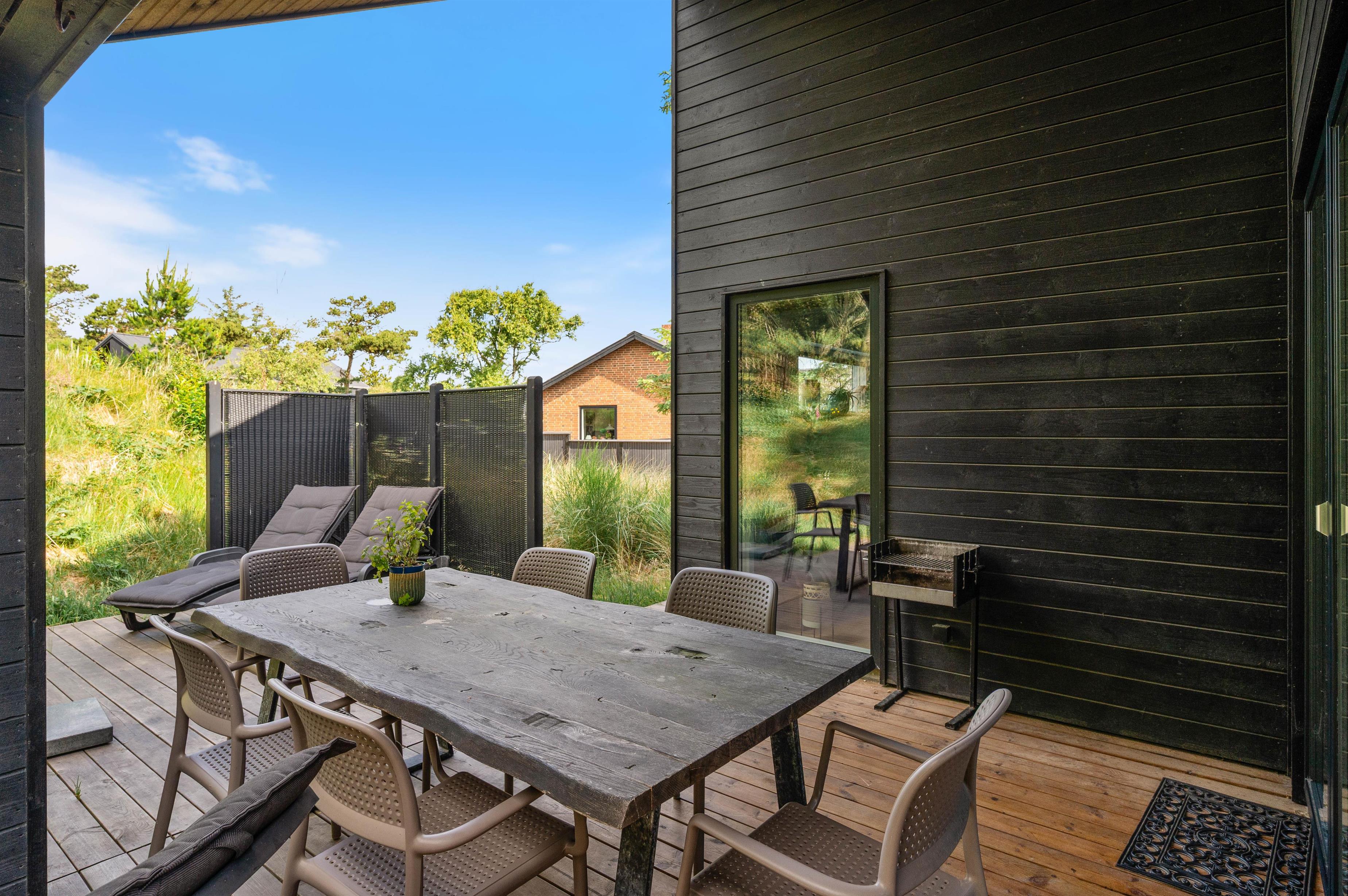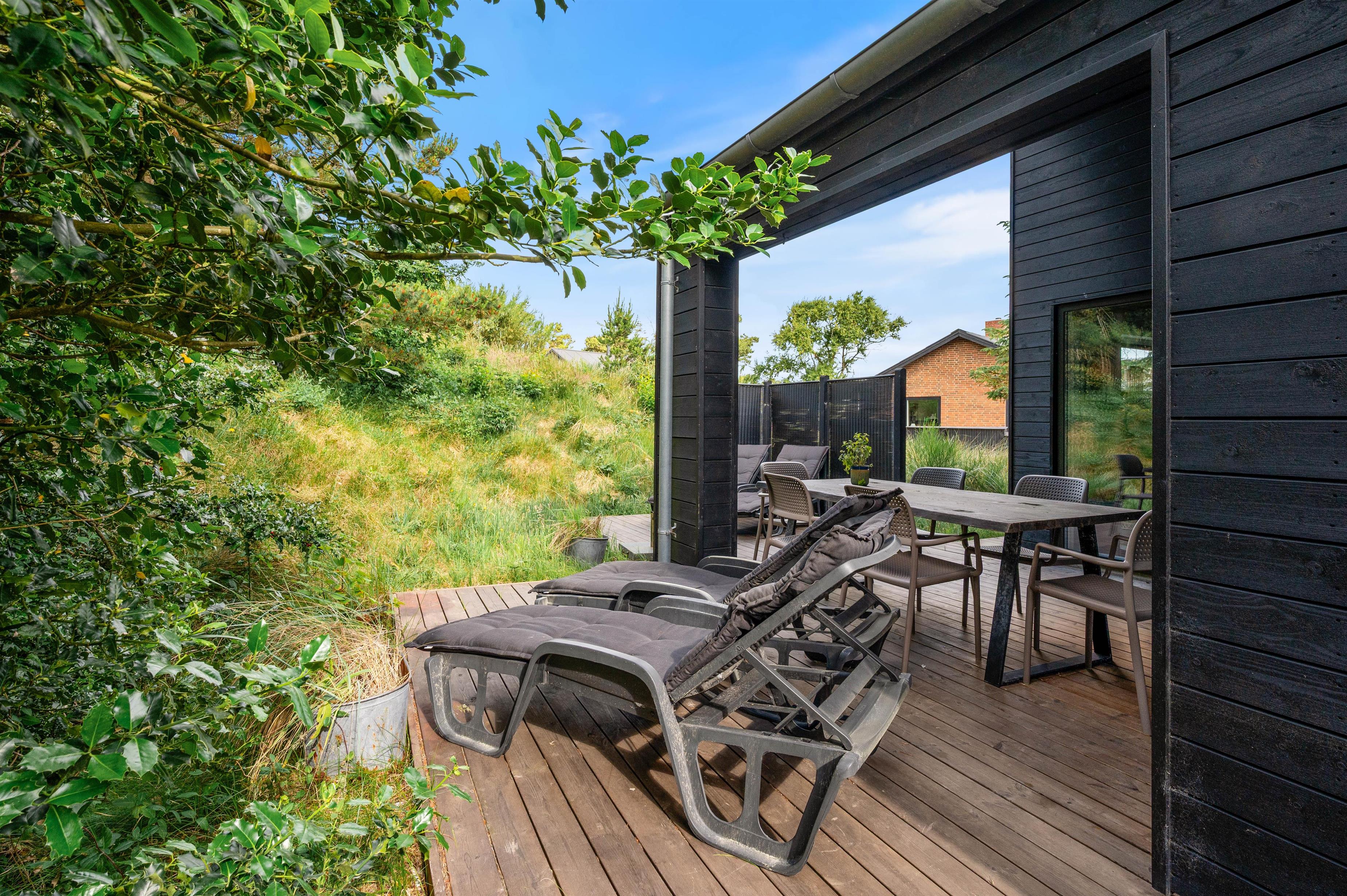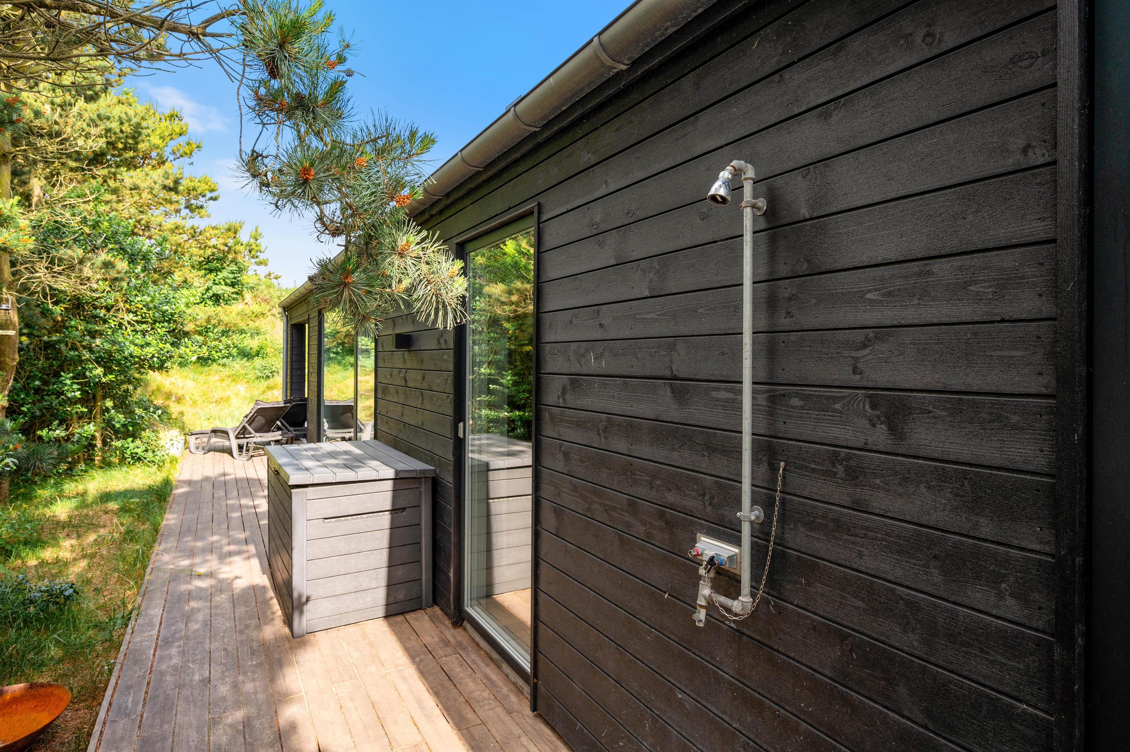 Mod sydvest finder I både en overdækket og en åben terrasse. En udebruser garanterer fra april til november en frisk afskylning efter en dukkert i det skønne Vesterhav.