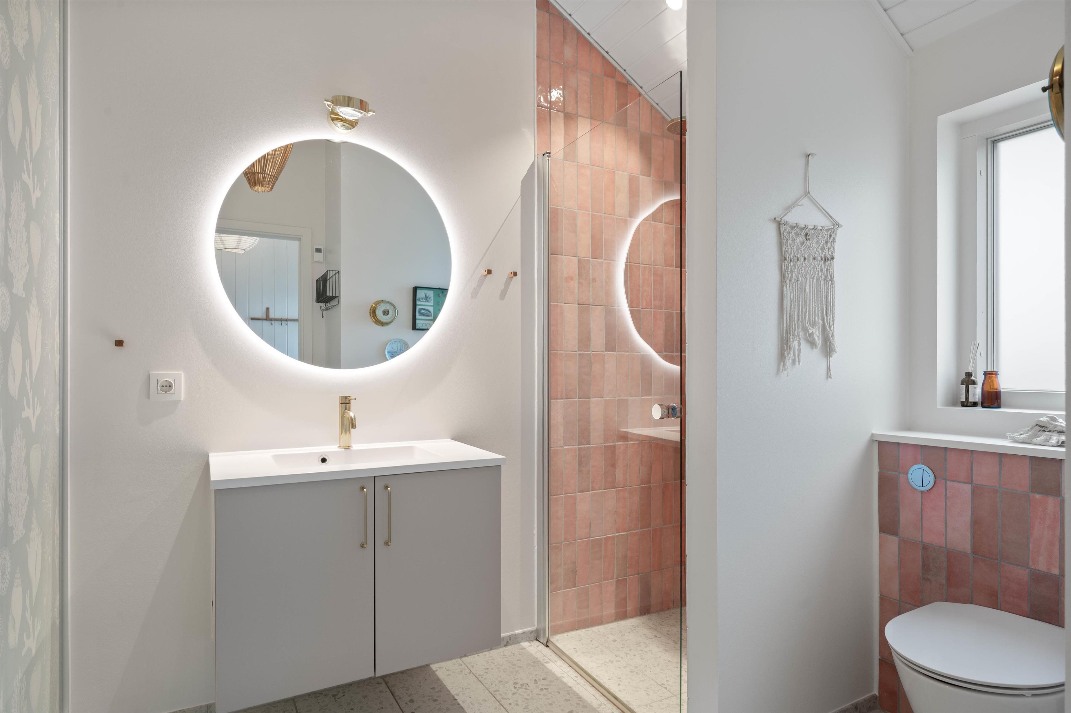 Badeværelset er flot og praktisk indrettet bl.a. med skydedøre, bag hvilke der gemmer sig opbevaringsplads, samt vaskemaskine og tørretumbler. Det vil nok især børnefamilier sætte stor pris på efter en lang dag ved stranden.