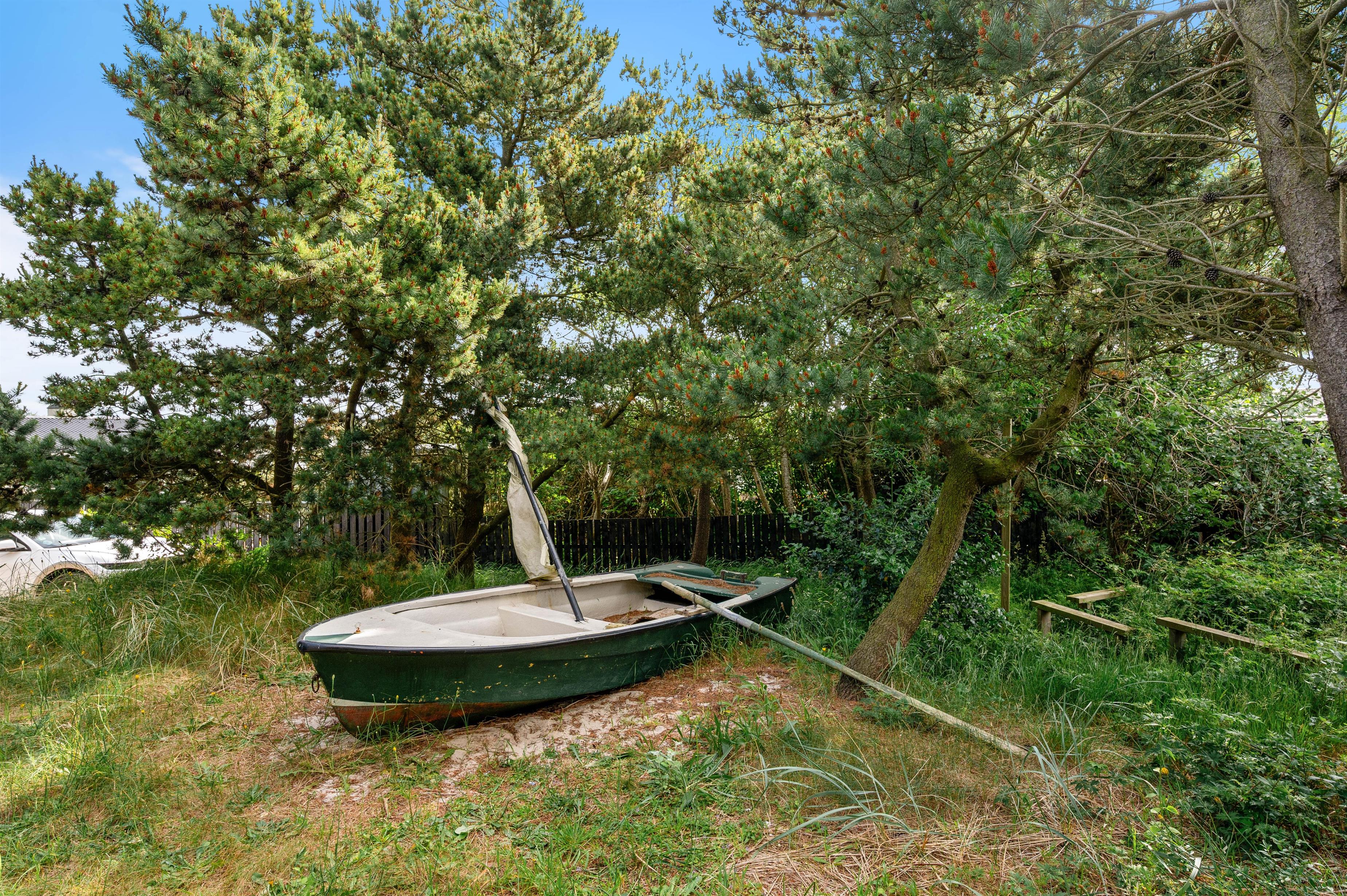 Rundt om denne skønne ”sommerdrøm” ved Vesterhavet er der flere gode hyggehjørner. Mod øst har Maja og Anders sat en lille jolle – perfekt til leg og klatring for de mindste – alt imens I voksne nyder en kop kaffe ved udgangen fra køkkenet.