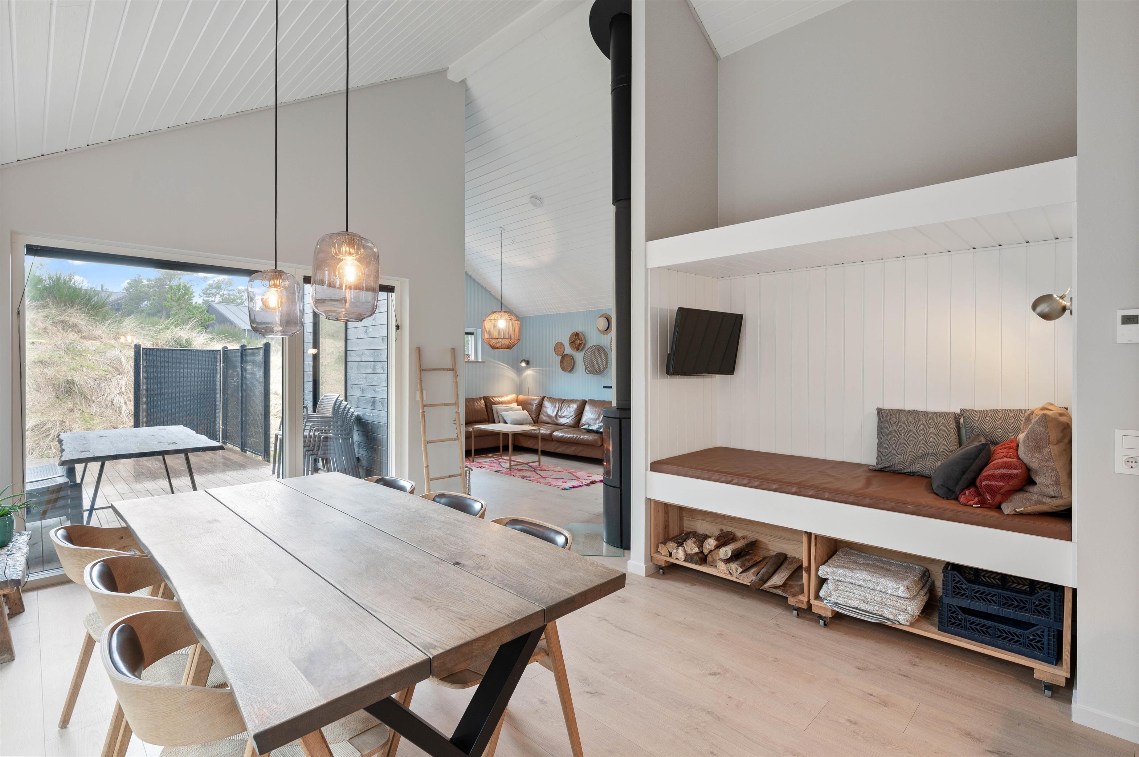 Samlingspunktet er det store hyggelige opholdsrum, hvor der ligesom i resten af sommerhuset, er åbnet op til kip. Her inviterer de store vinduespartier mod sydvest solen helt ind i huset for en lys og dejlig stemning.