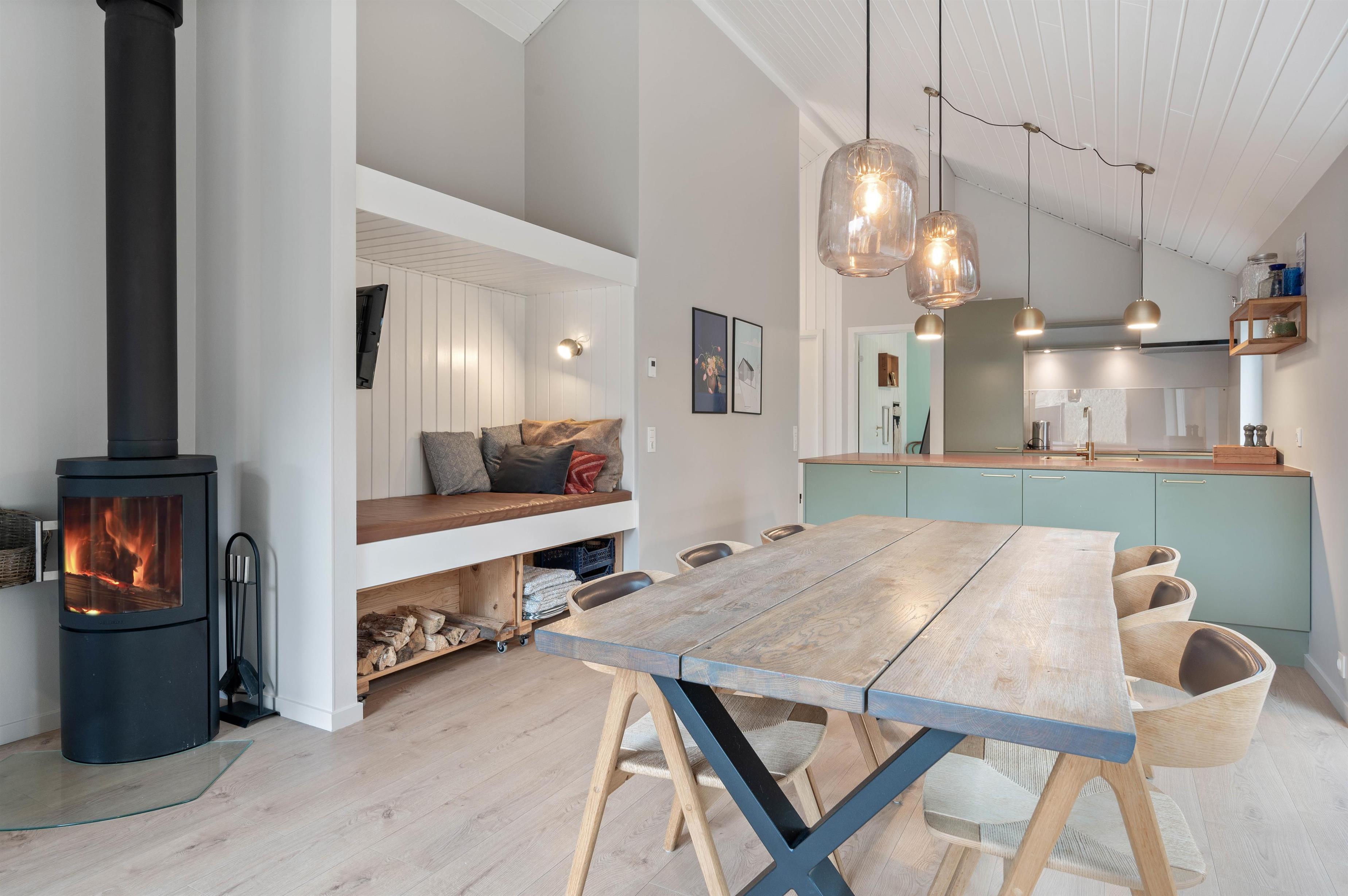 Stuehjørnet lægger op til hyggelige aftener med familiespil og gode snakke - med den knitrende ild i brændeovnen i baggrunden.