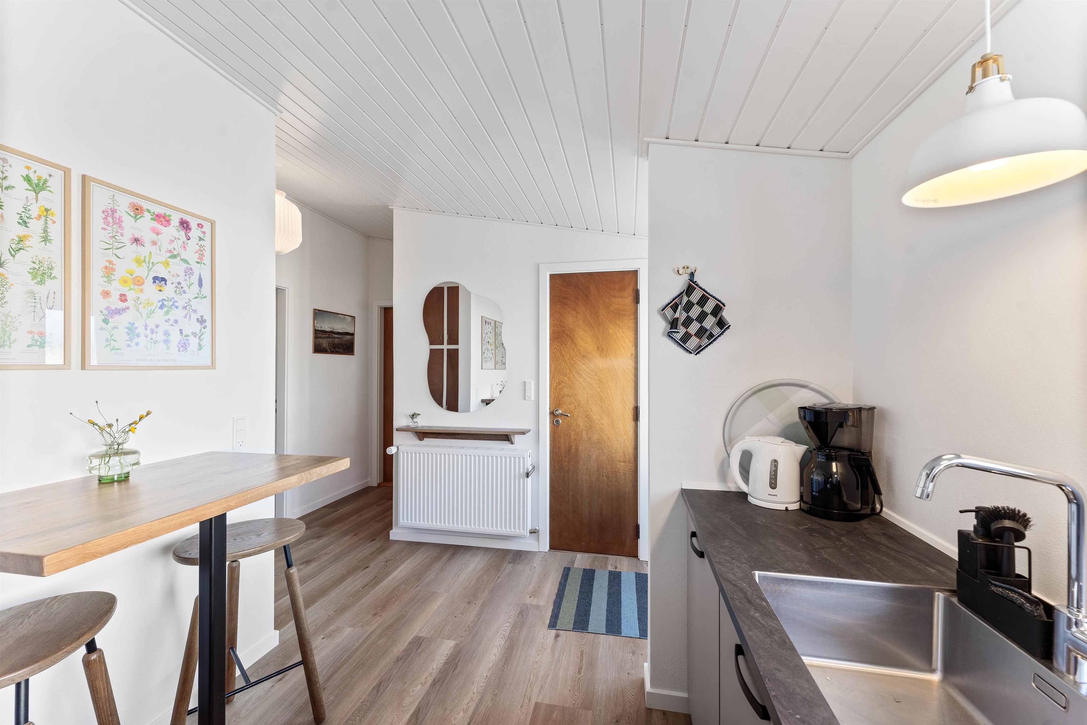 Sommerhuset er renoveret i 2020 og er rigtig godt indrettet til 6 personer. Ferieboligen indeholder et funktionelt køkken med god skabsplads. Ved det lille bord i køkkenet kan man holde kokken med selskab, mens der kokkereres, eller børnene kan hygge sig med spil, mens deres livret tilberedes.