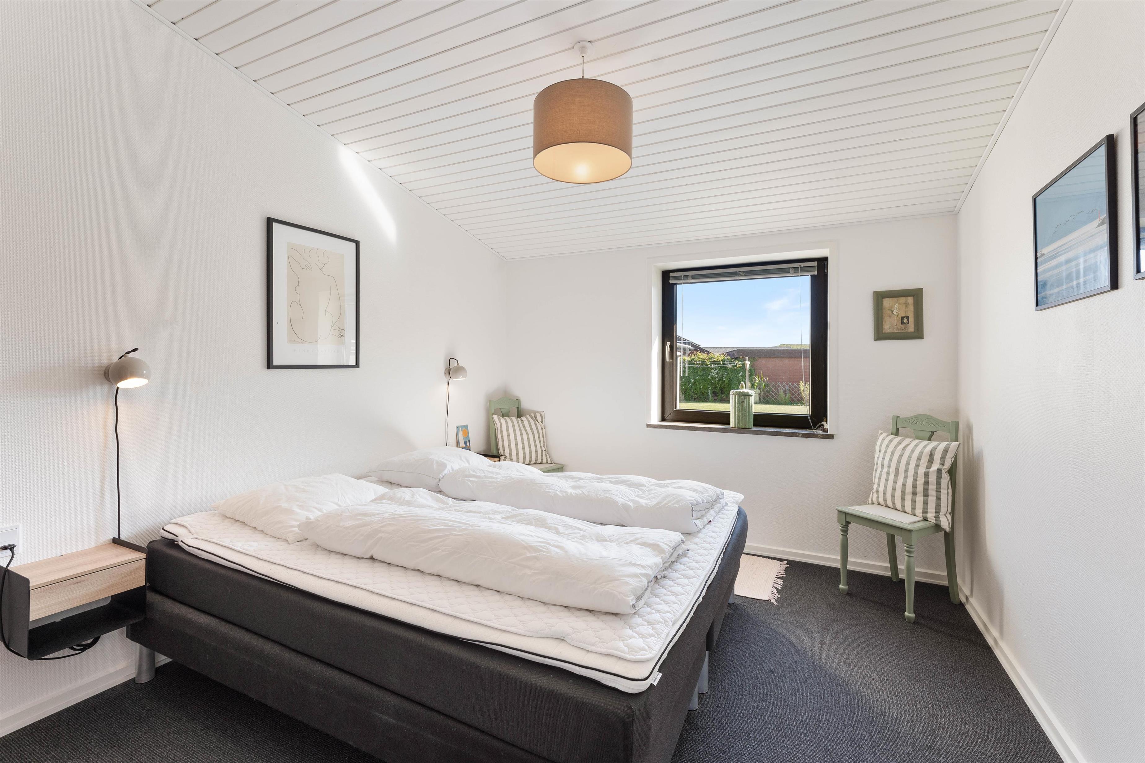 Feriehusets sovepladser fordeler sig på 3 soveværelser; 2 med dobbeltsenge på henholdsvis 180x200 & 140x200, og 1 med køjeseng. Begge badeværelser er med gulvvarme.