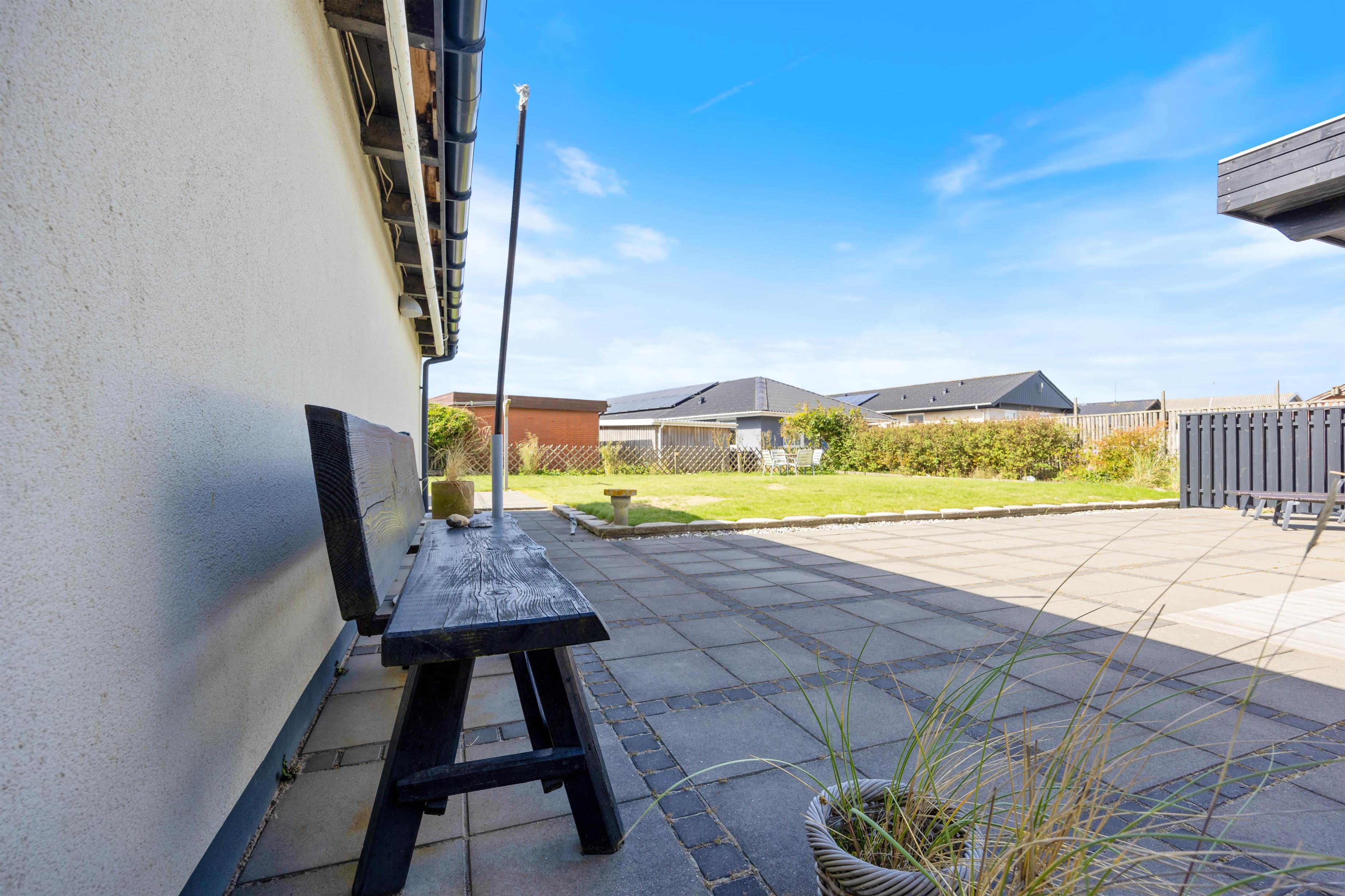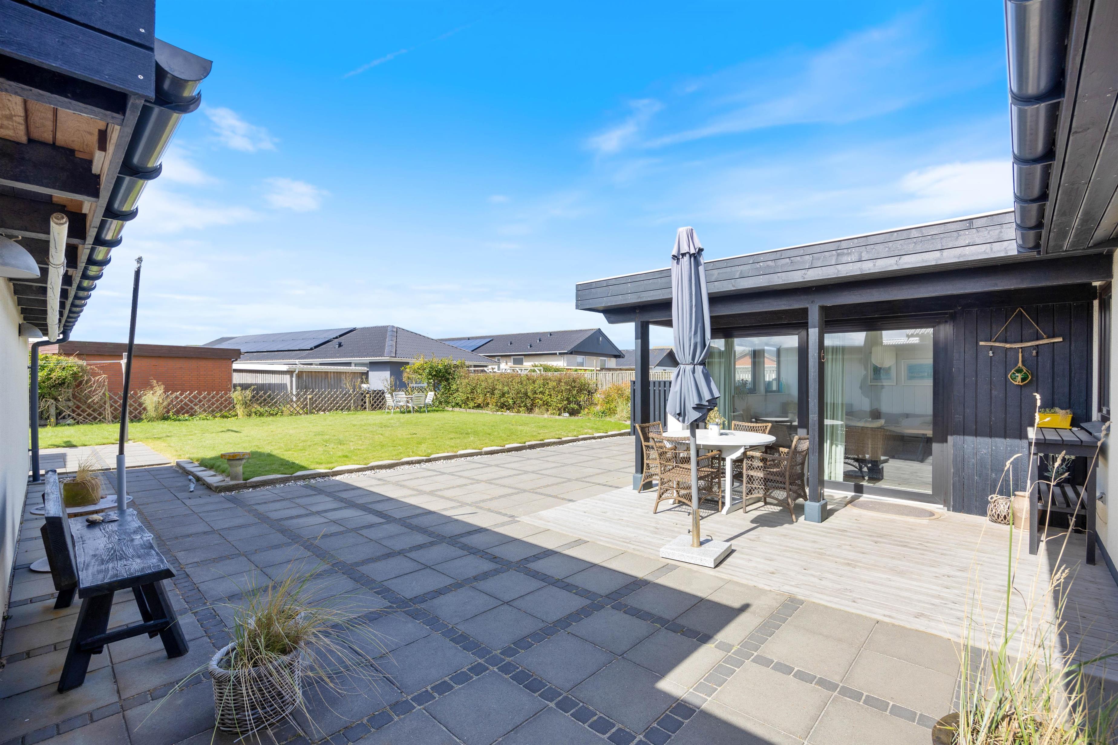 Fra udestuen er der udgang til en overdækket træterrasse og afskærmet fliseterrasse. Her kan I ugeneret slappe af, mens børnene boltrer sig på det store plæneareal.