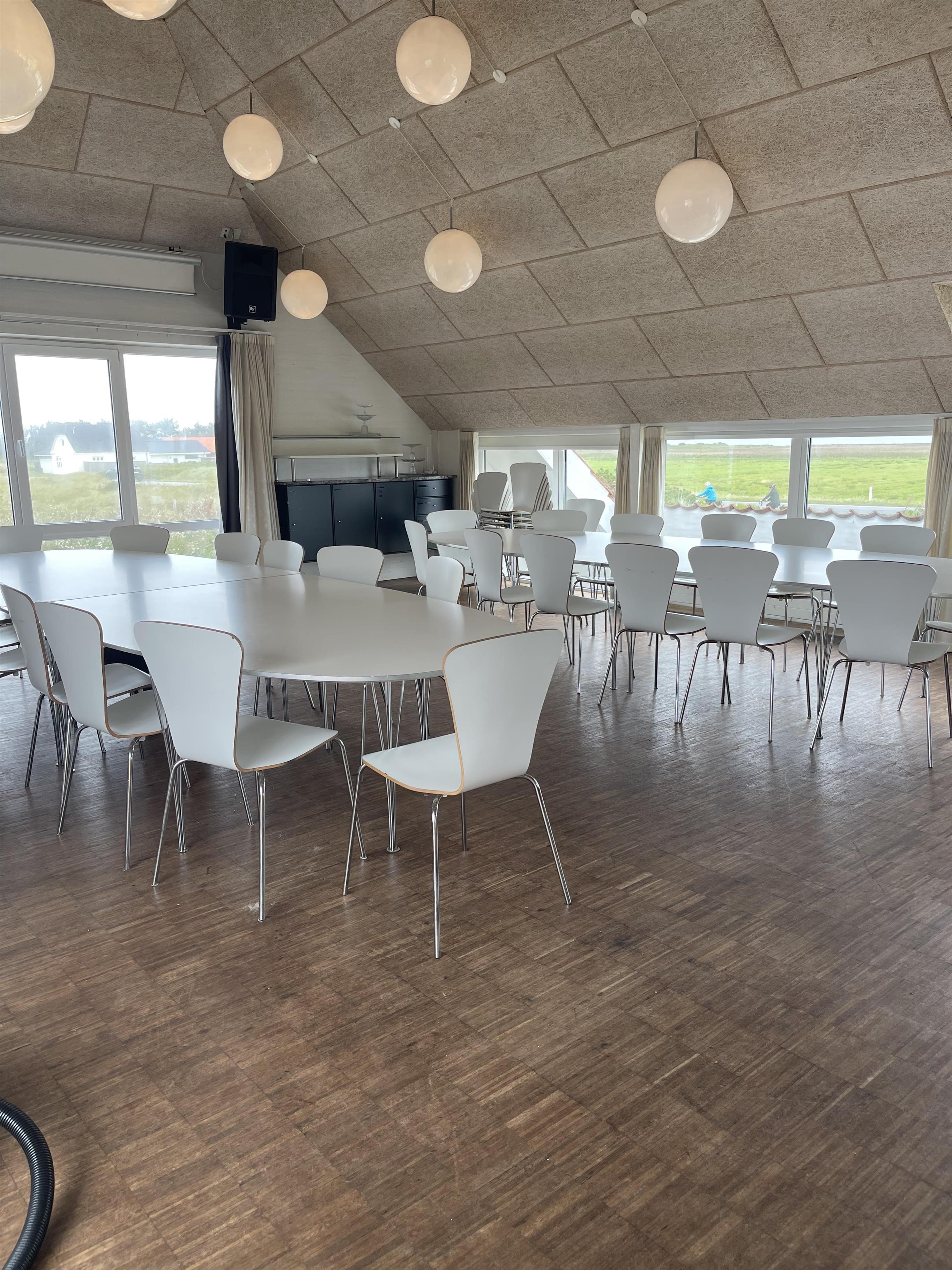 Faciliteterne gør det nemt at afholde større arrangementer. Her finder I en rummelig festsal og et opholdsrum med plads til alle 38 gæster samt panoramaudsigt over Ringkøbing Fjord. Det store industrikøkken giver optimale muligheder for at tilberede måltider til mange mennesker og er blandt andet udstyret med en fryser på over 300 liter.