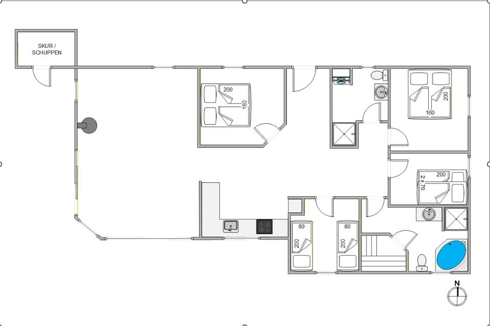 Sommerhuset er indrettet med fokus på funktionalitet og komfort. Her finder I et veludstyret køkken, gode soveværelser og de nødvendige faciliteter til både korte og længere ophold. Det gør det nemt at slappe af og nyde ferien uden praktiske bekymringer.