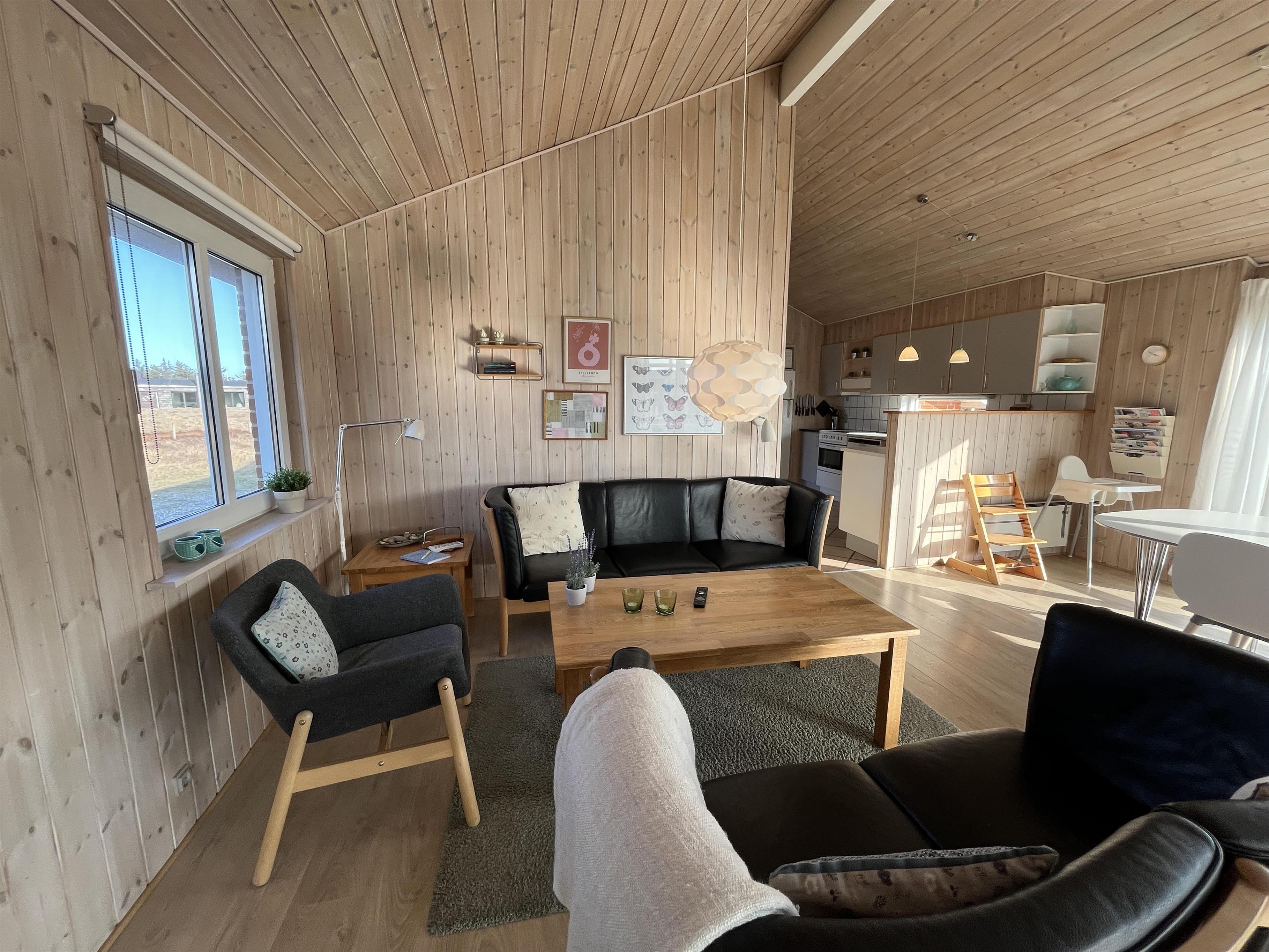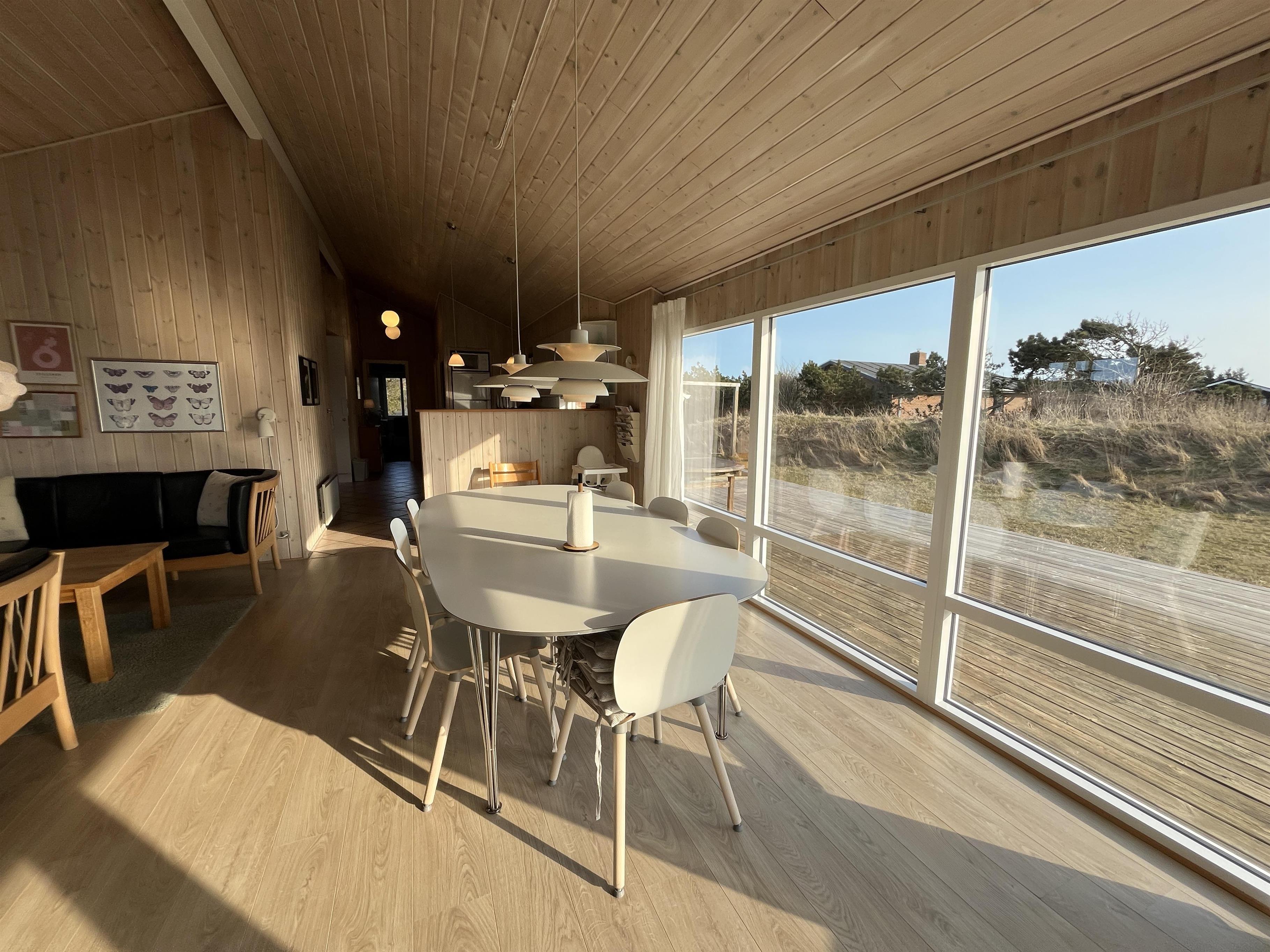 Huset byder på et lyst og venligt opholdsrum, hvor stue, spiseplads og køkken er samlet i ét. Her kan familien samles om madlavning, brætspil eller hygge foran brændeovnen på kølige dage. De store vinduer giver et skønt lysindfald og skaber en behagelig atmosfære.