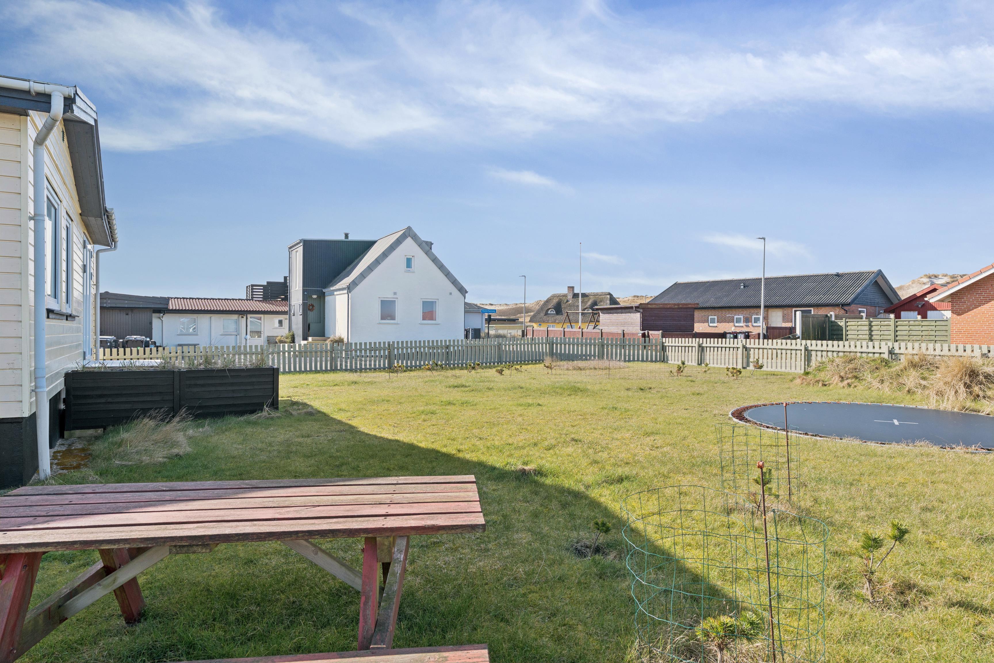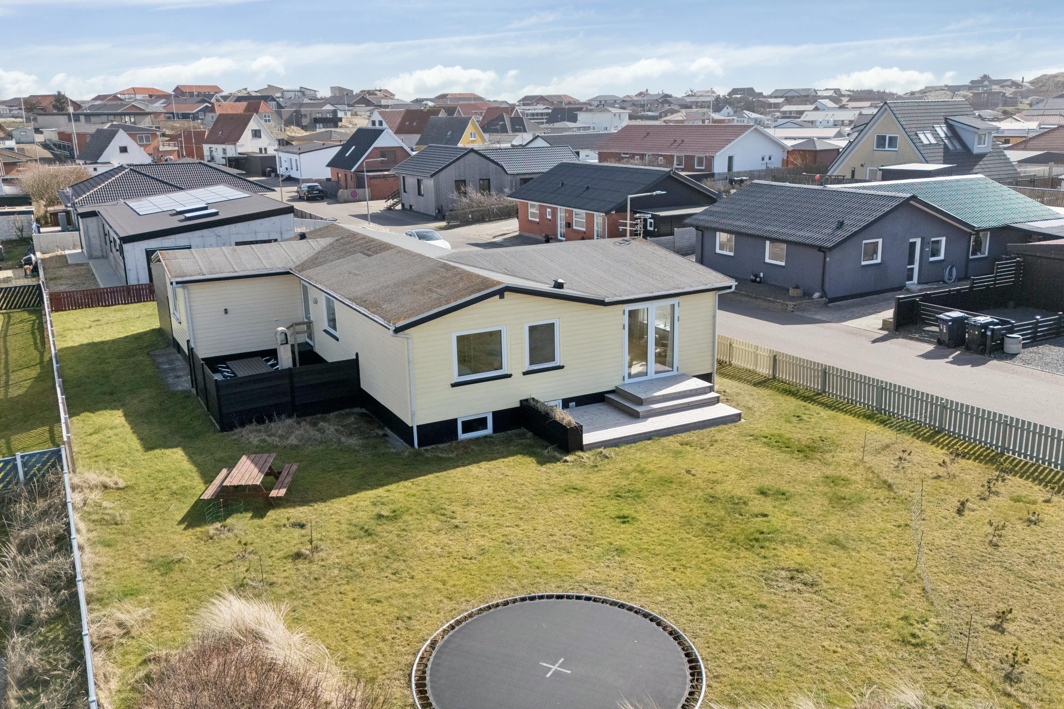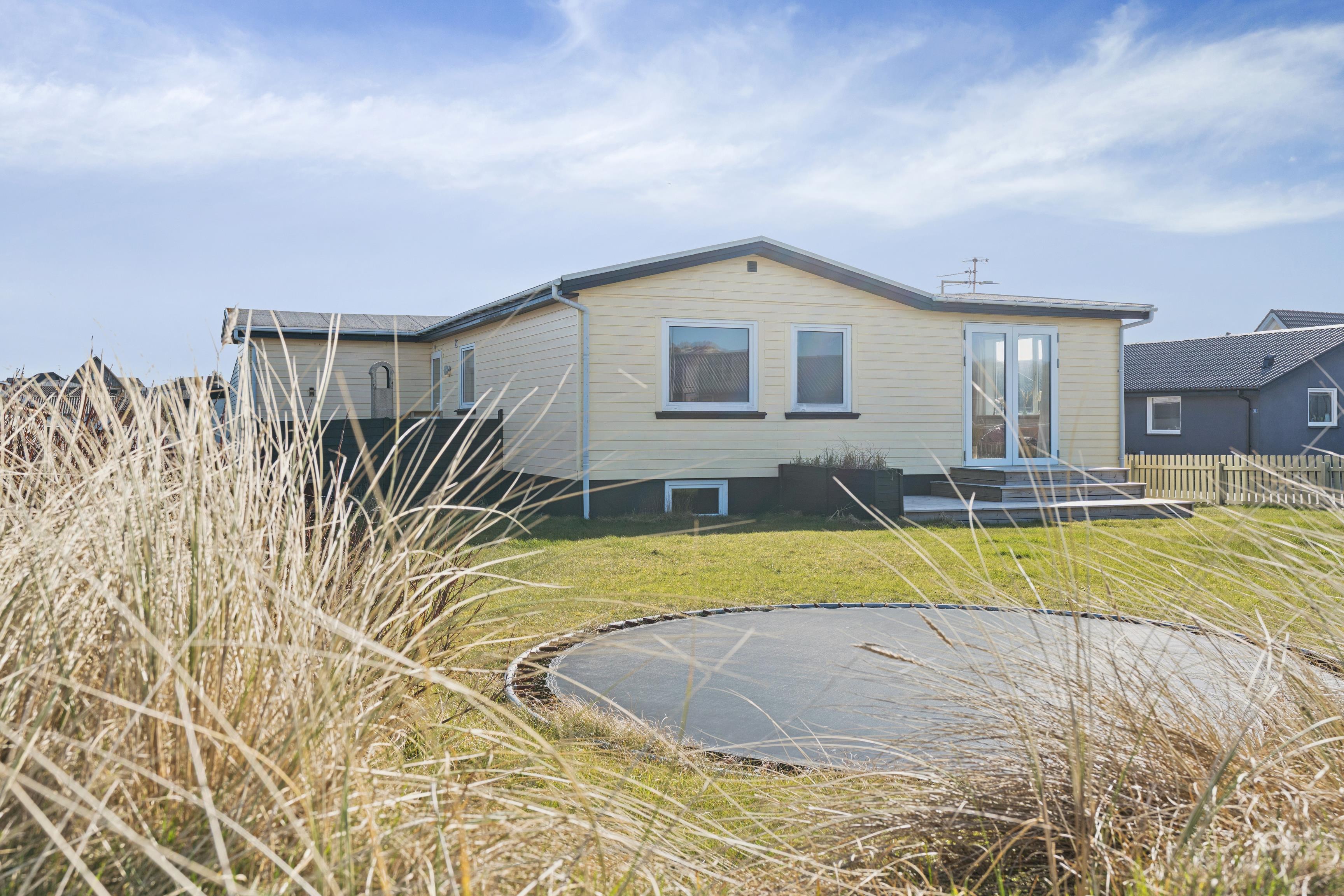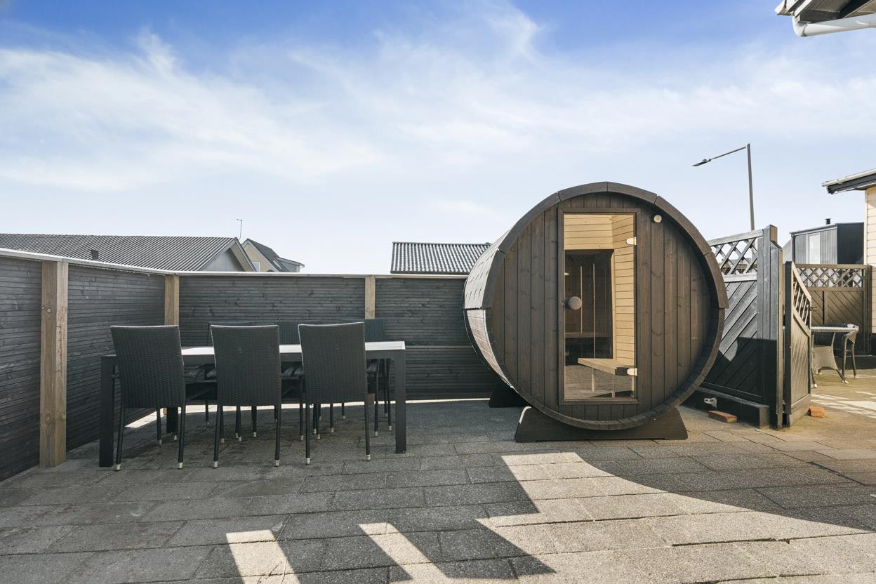 Udendørsarealerne er et stort plus. Den lukkede plænegrund giver trygge rammer for både børn og hund, og trampolinen bliver uden tvivl et hit blandt de yngste. Terrassen er delvist overdækket og indrettet med gode havemøbler, så I kan nyde sommeraftenerne i læ. Som ekstra luksus er der en udebruser, som kan bruges fra april til november, og Ude sauna – perfekt efter en tur i havet.