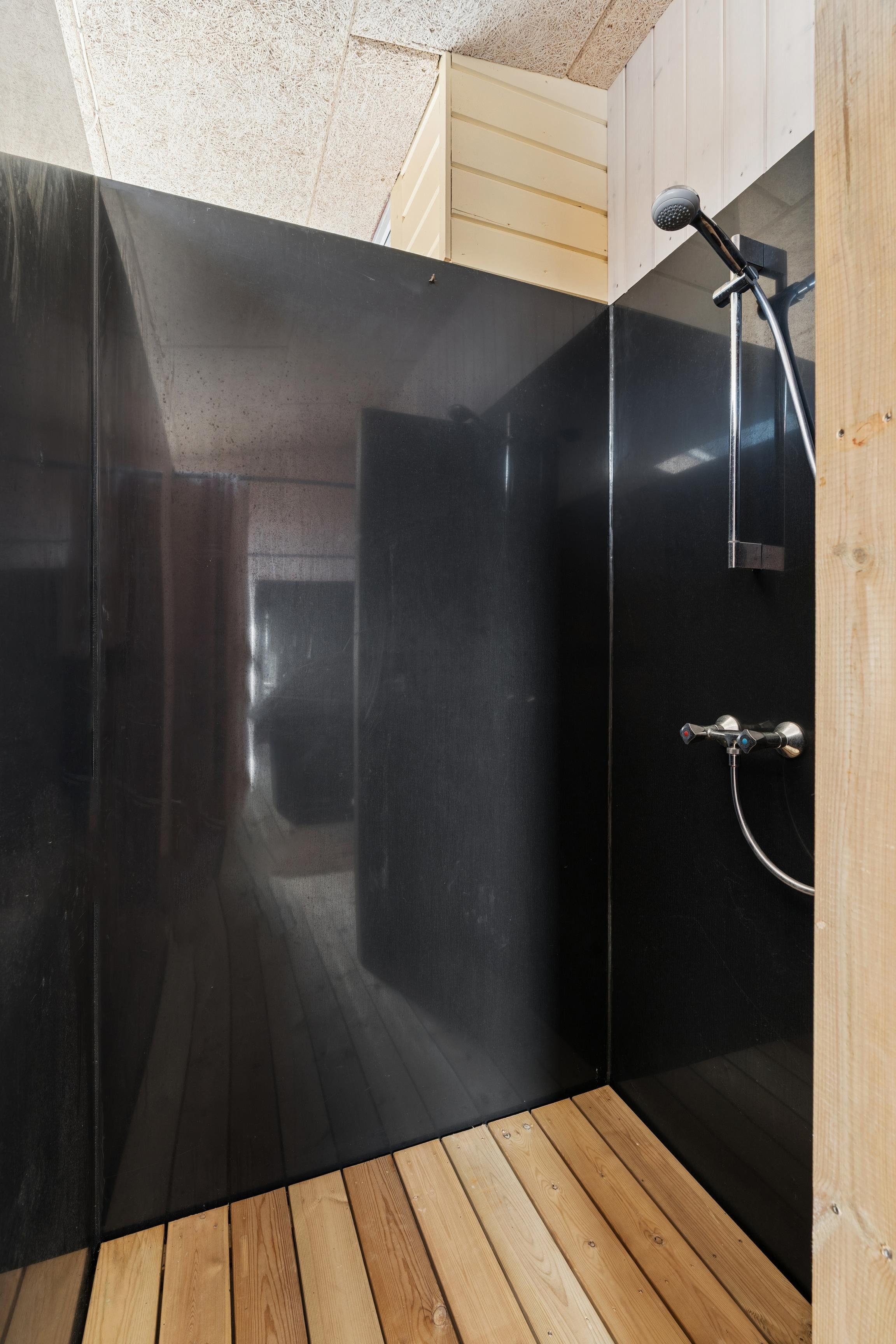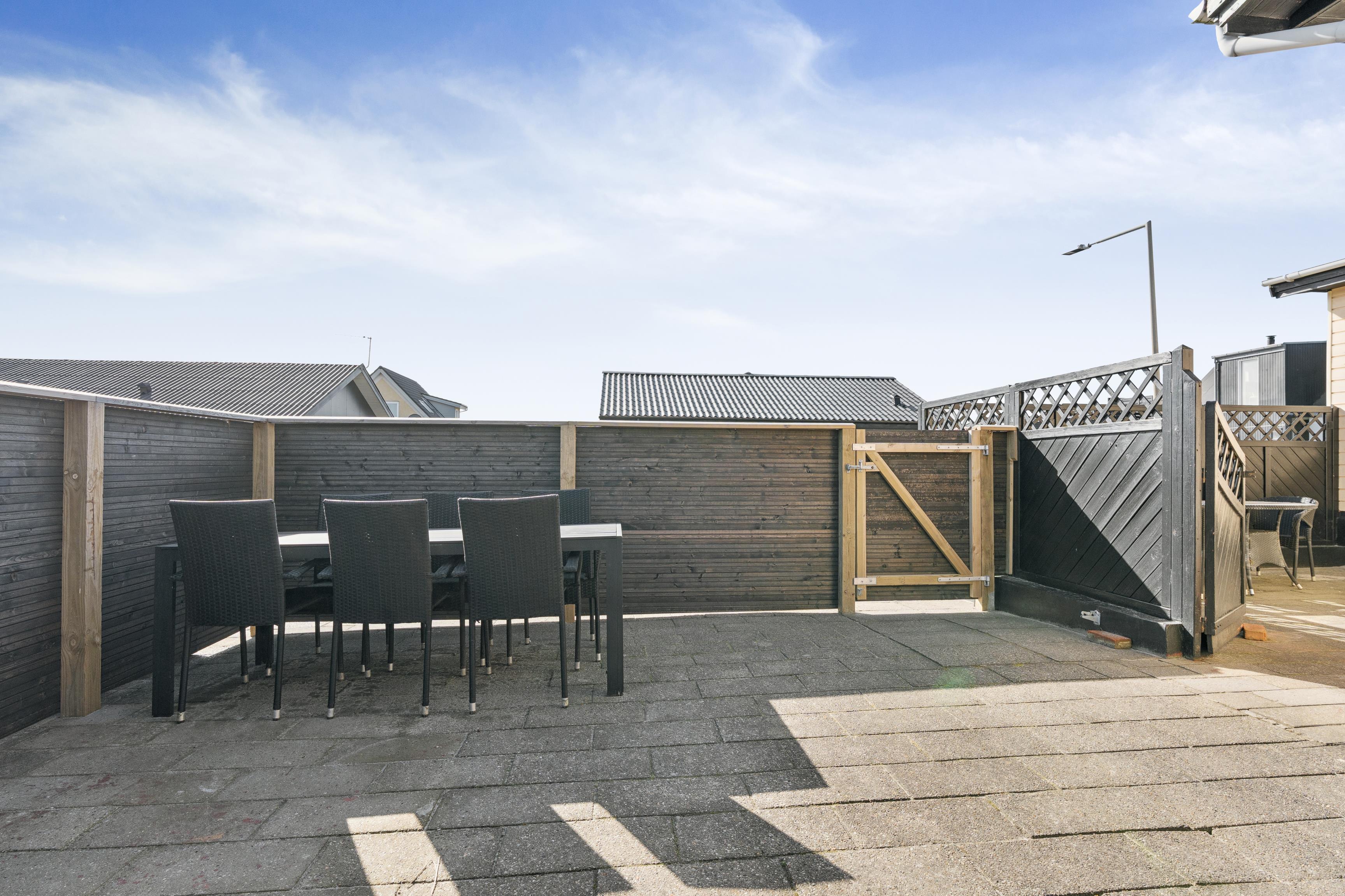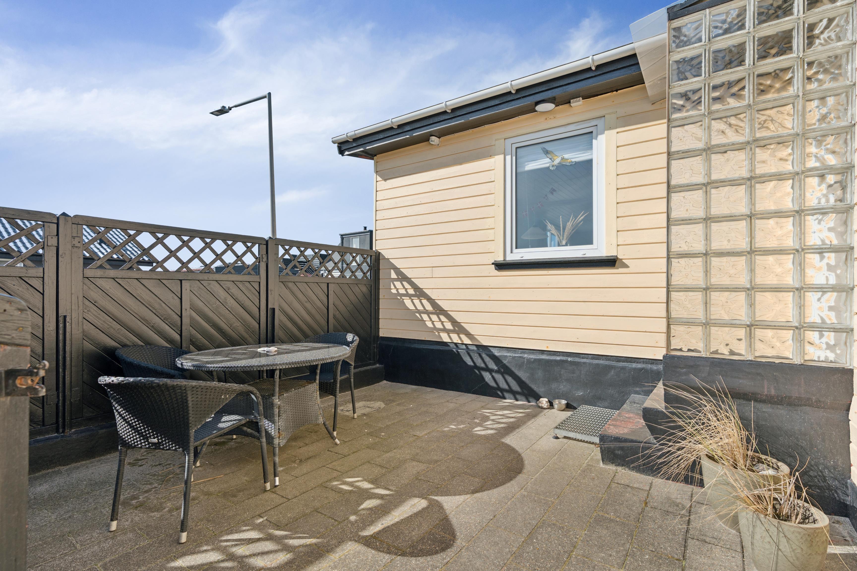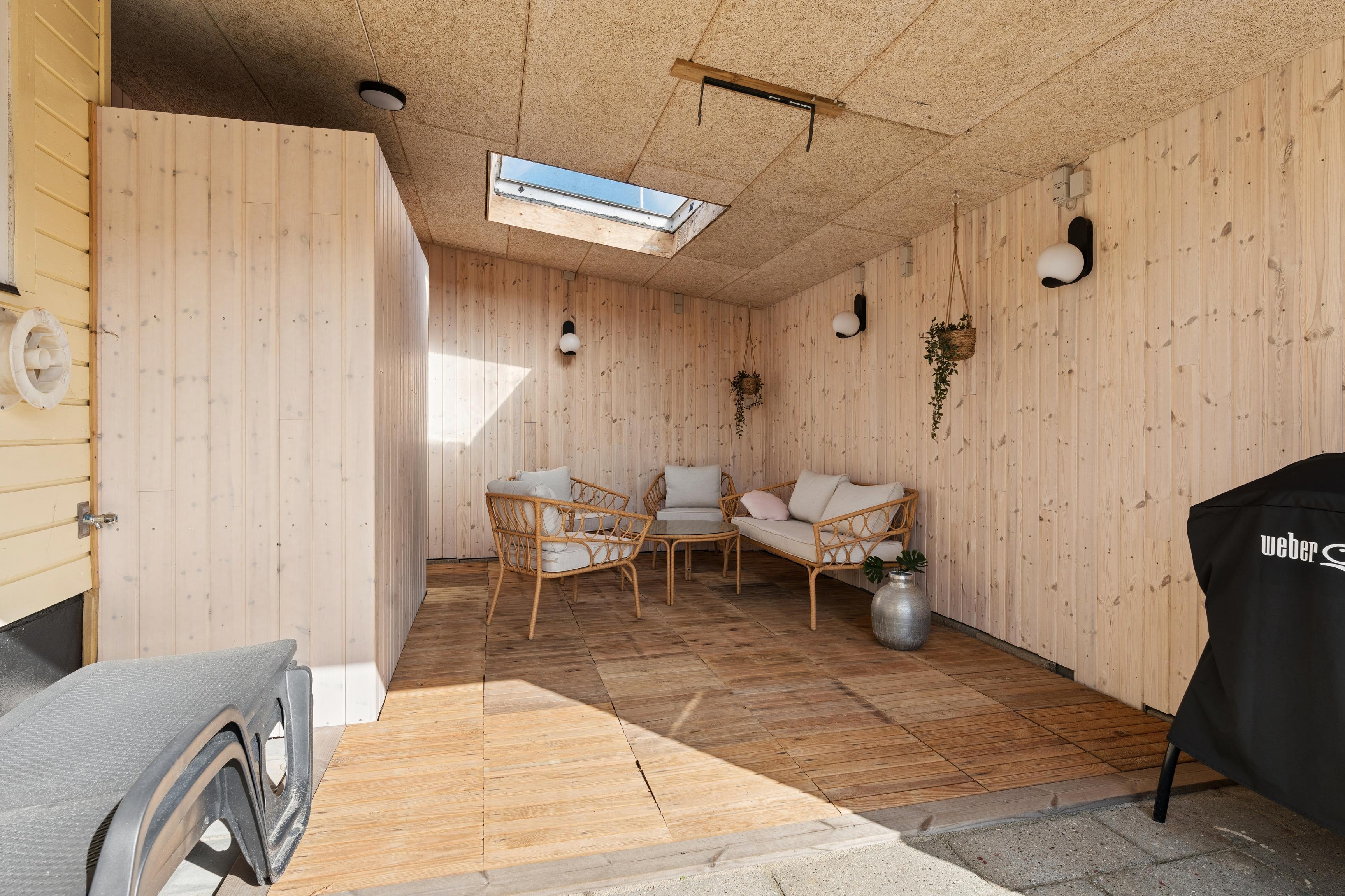 Udendørsarealerne er et stort plus. Den lukkede plænegrund giver trygge rammer for både børn og hund, og trampolinen bliver uden tvivl et hit blandt de yngste. Terrassen er delvist overdækket og indrettet med gode havemøbler, så I kan nyde sommeraftenerne i læ. Som ekstra luksus er der en udebruser, som kan bruges fra april til november, og Ude sauna – perfekt efter en tur i havet.