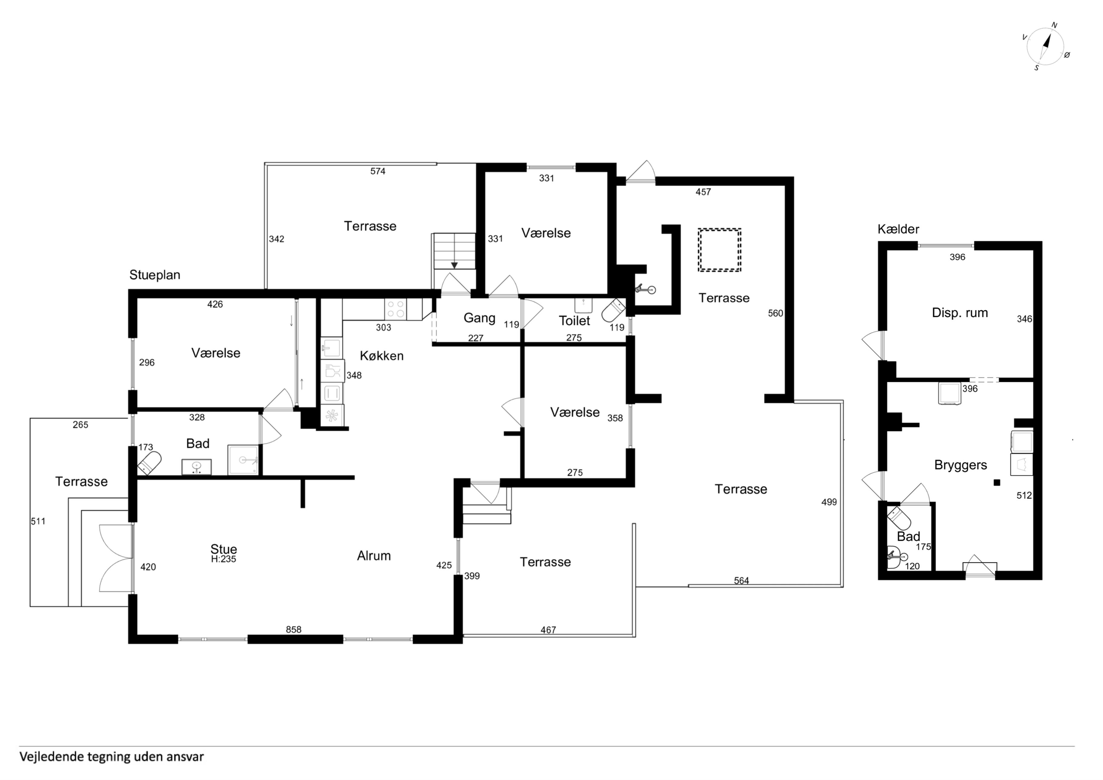 Tre soveværelser og to toiletter
