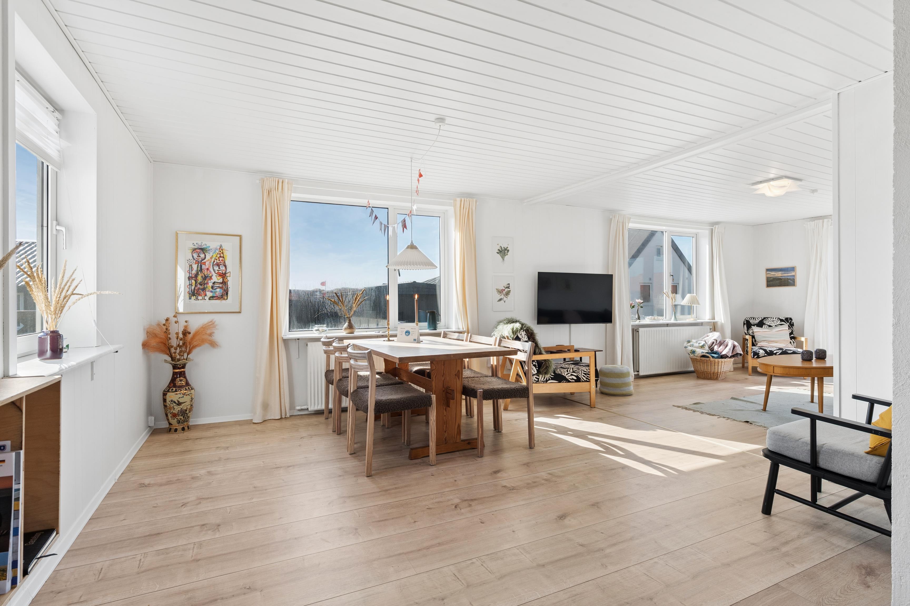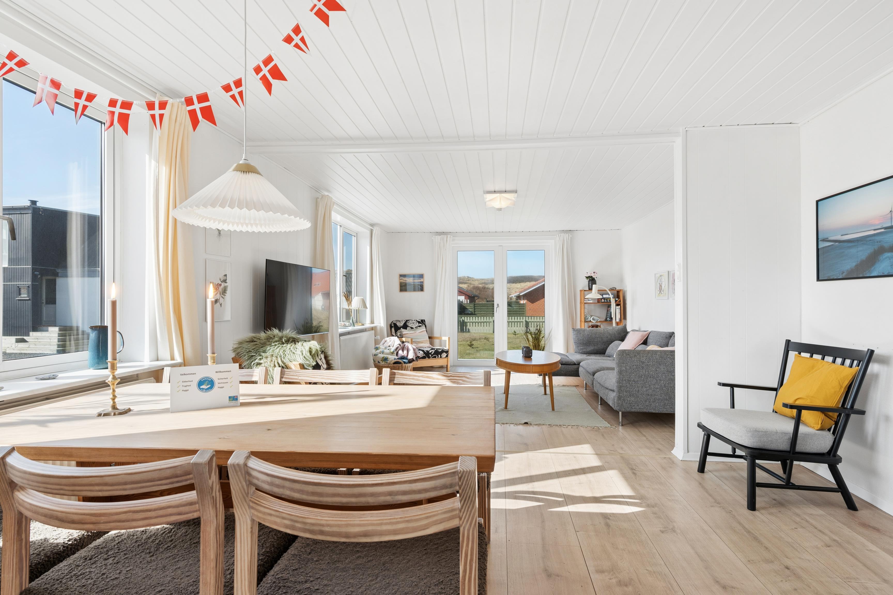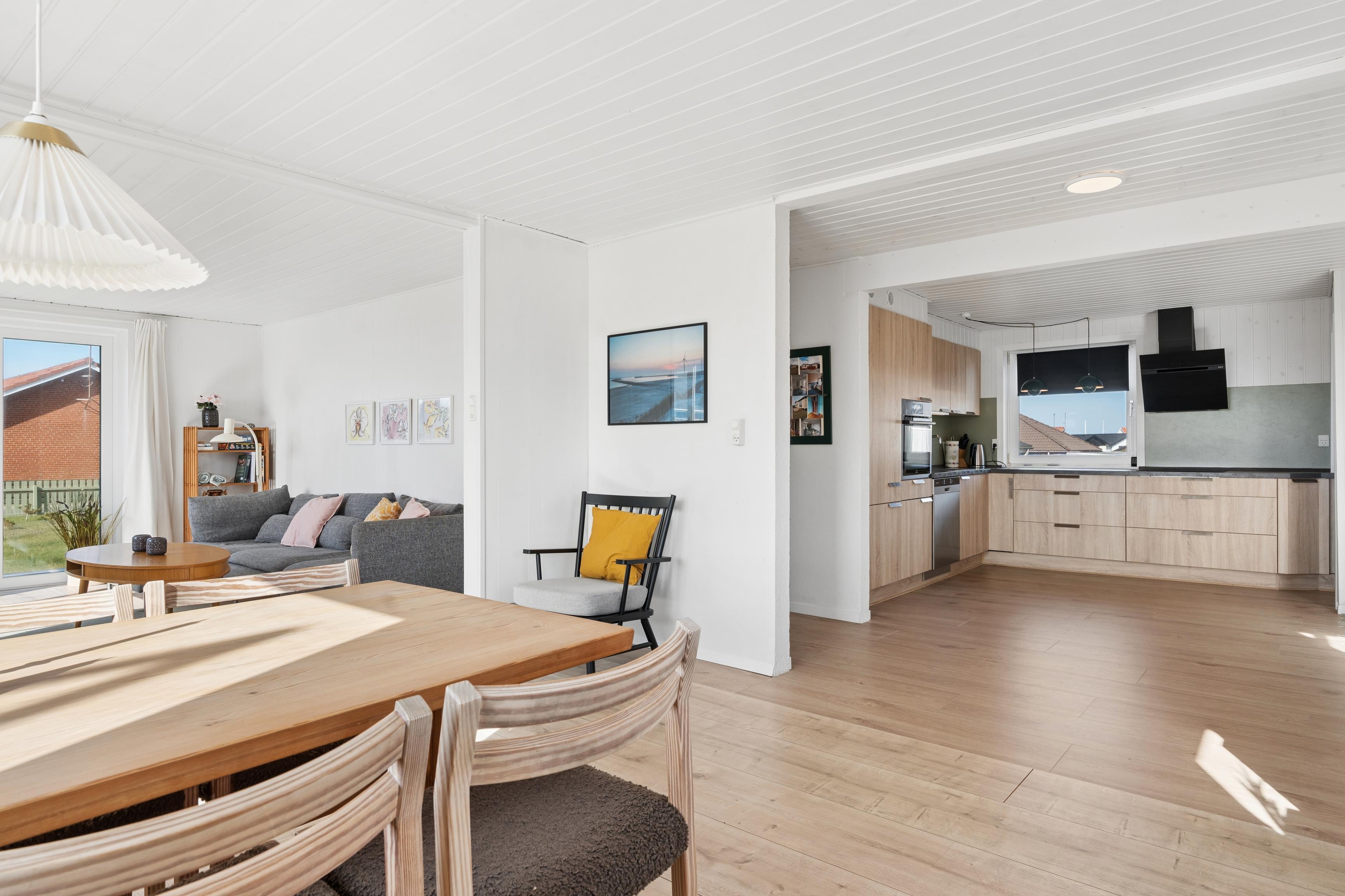 Sommerhusets hjerte er det lyse køkken-alrum, hvor stue, spiseplads og køkken ligger i åben forbindelse. Her kan I samles om madlavning, brætspil eller en god film efter en dag ved stranden. Køkkenet er veludstyret og har opvaskemaskine, så oprydningen bliver let.