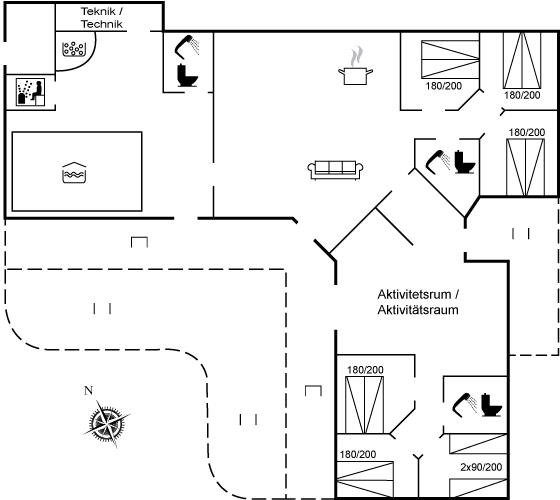 Der er i alt 6 soveværelser. Sovepladserne fordeler sig på: 10 sovepladser i dobbeltsenge. 2 sovepladser i enkeltsenge. 6 sovepladser på madrasser. 6 af disse sovepladser fordeler sig på 2 hemse. Derudover er der 1 stk. barneseng.