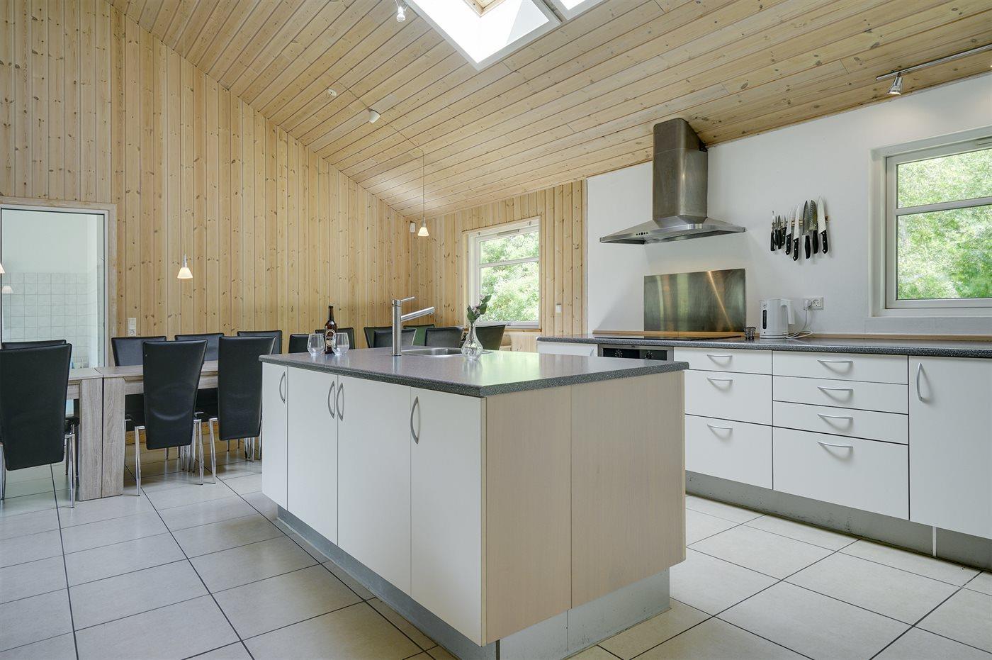 Køkkenet er udstyret med 1 køleskab. Der er 4 keramiske kogeplader, varmluftovn, mikrobølgeovn samt opvaskemaskine.