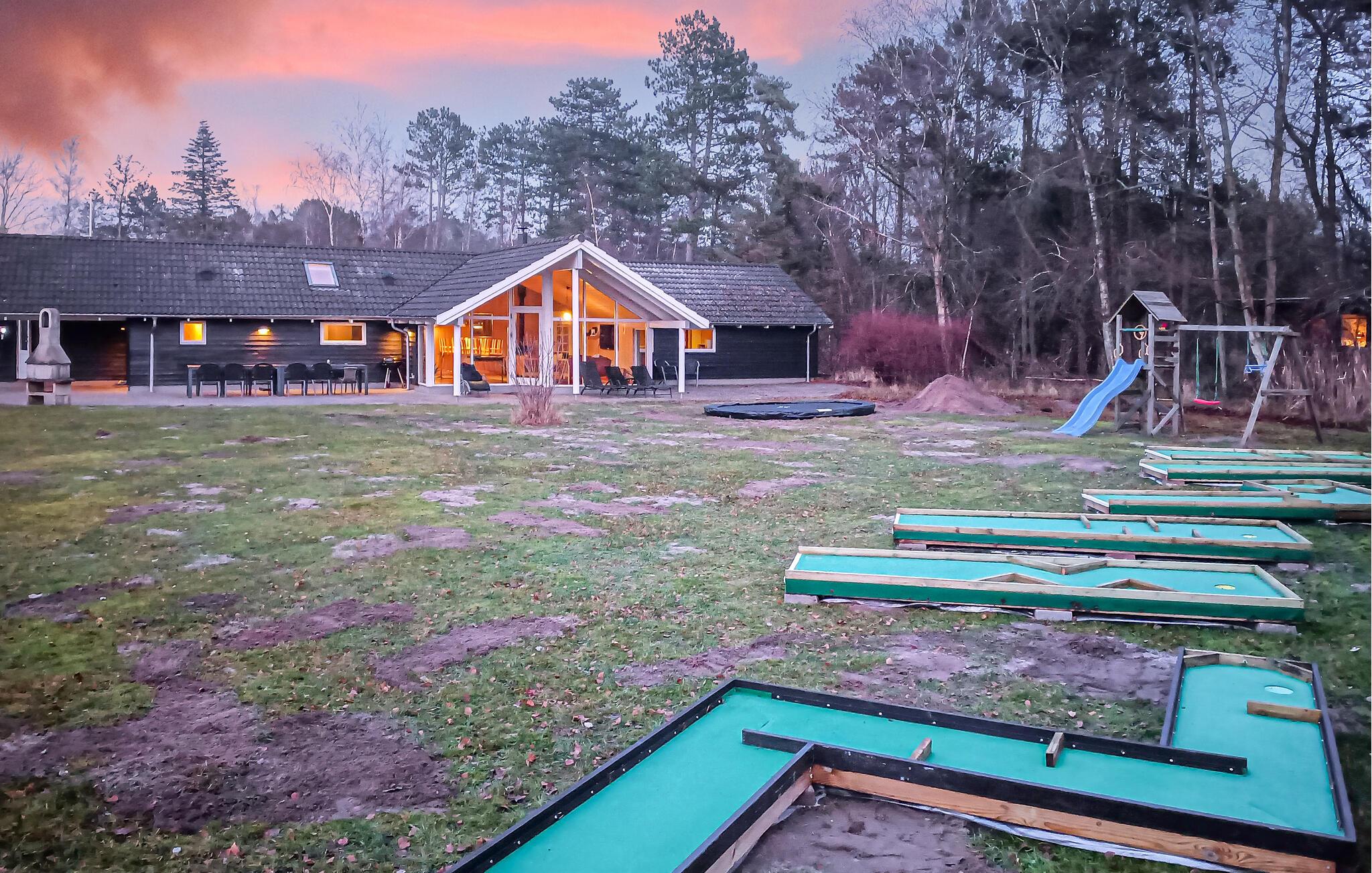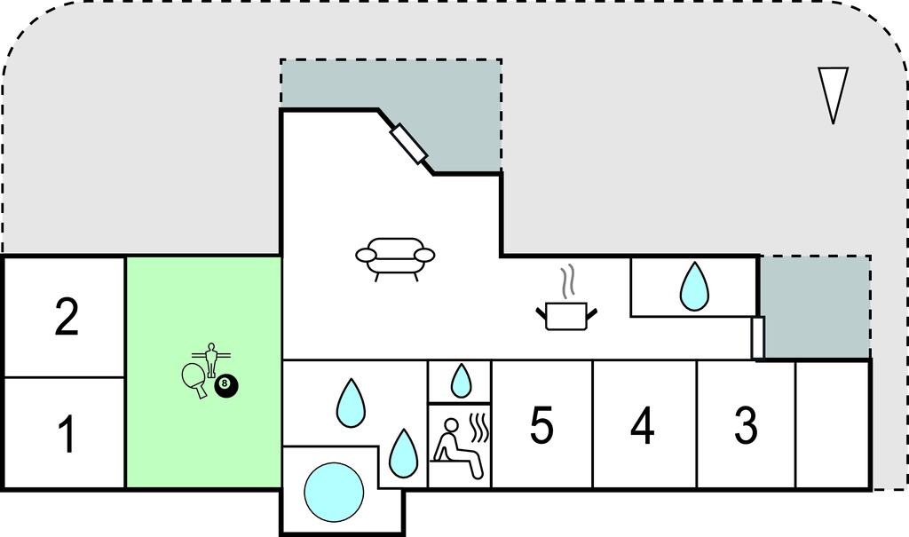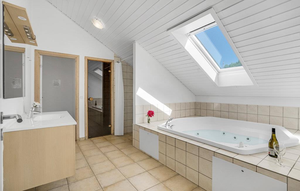 Husets rummelige køkken/alrum ligger sammen med opholdsstuen, så feriens skiftende kokke sagtens kan være med i samtalerne i stuen. Hyg jer i sofaerne eller rundt om spisebordet, hvor der er plads til, at alle kan sidde og spise sammen. Her findes desuden 5 soveværelser samt en hems med sovepladser til 2 personer. I aktivitetsrummet kan I spille bordtennis og dart, og måske har nogen lyst til skøn wellness i det store 6 personers spabad eller velgørende varme i saunaen. Det er muligt at leje linned.