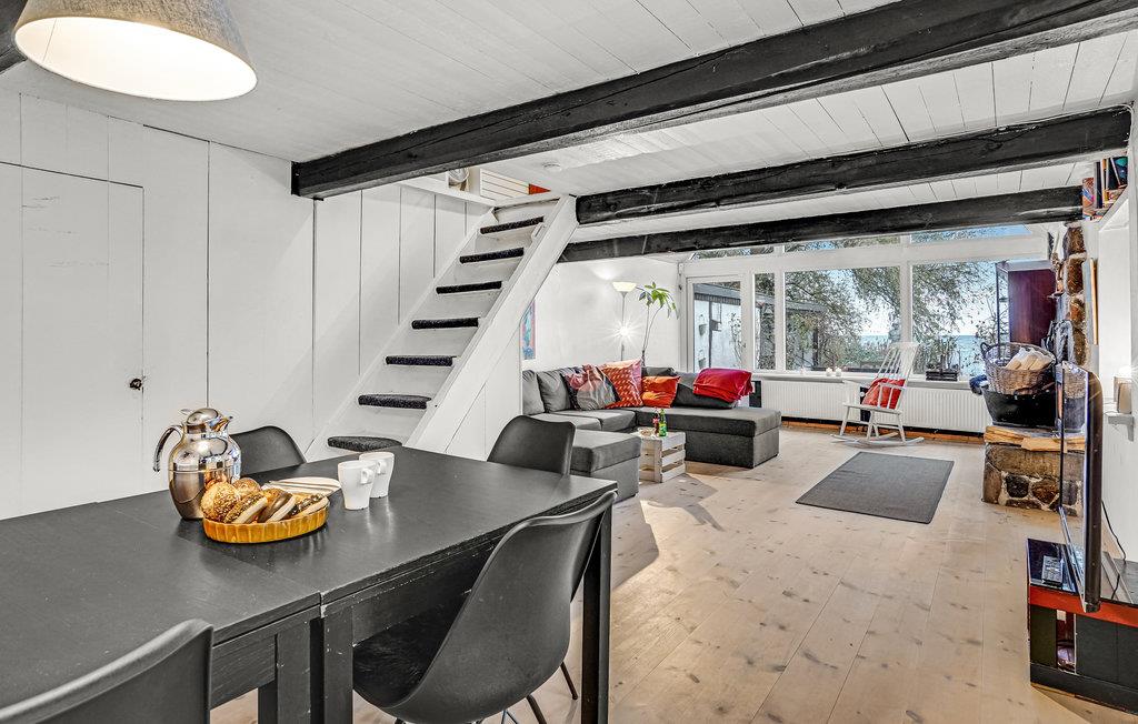 Husets hjerte er den store, lyse og smagfuldt indrettede stue med åbent til kip, hvilket skaber en rummelig og hyggelig atmosfære. Store vinduespartier slipper meget lys ind i stuen og giver jer en fantastisk udsigt over fjorden. Her kan I sætte jer godt til rette i sofaen, læse en god bog og på køligere dage tænde op i den flotte brændeovn i natursten.