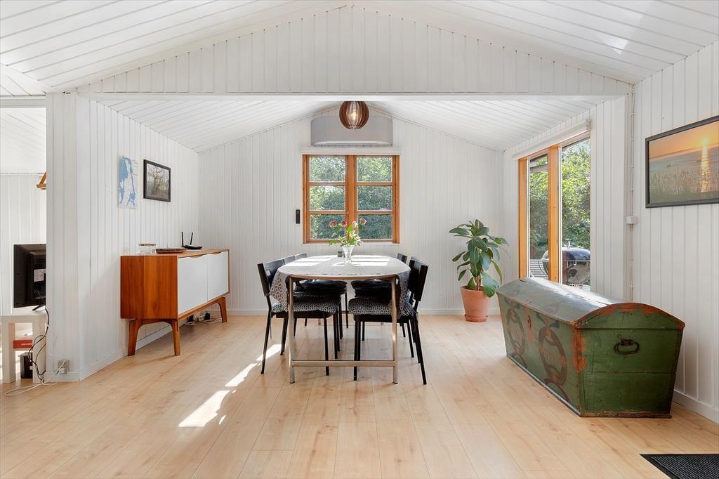 Dette enkle sommerhus vil glæde jer med sin lyse stue og smagfulde dekorationer. Her finder I frem for alt rummelighed og komfort hyggelig brændeovn og separat spisepladsområde, skabt af det raffinerede arrangementer og valg af æstetiske møbler.