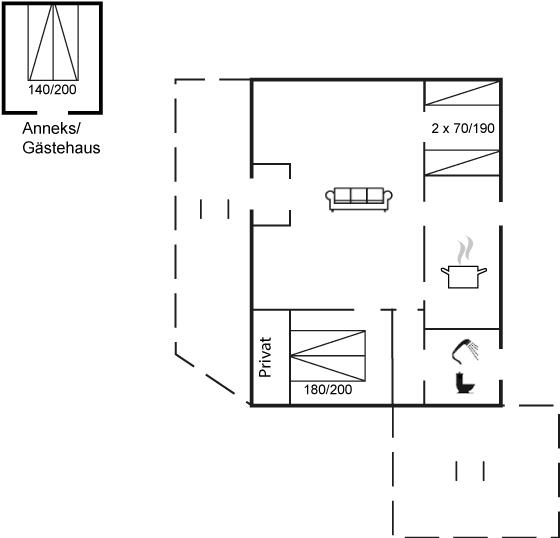 Bemærk, at to af husets sovepladser befinder sig i annekset.