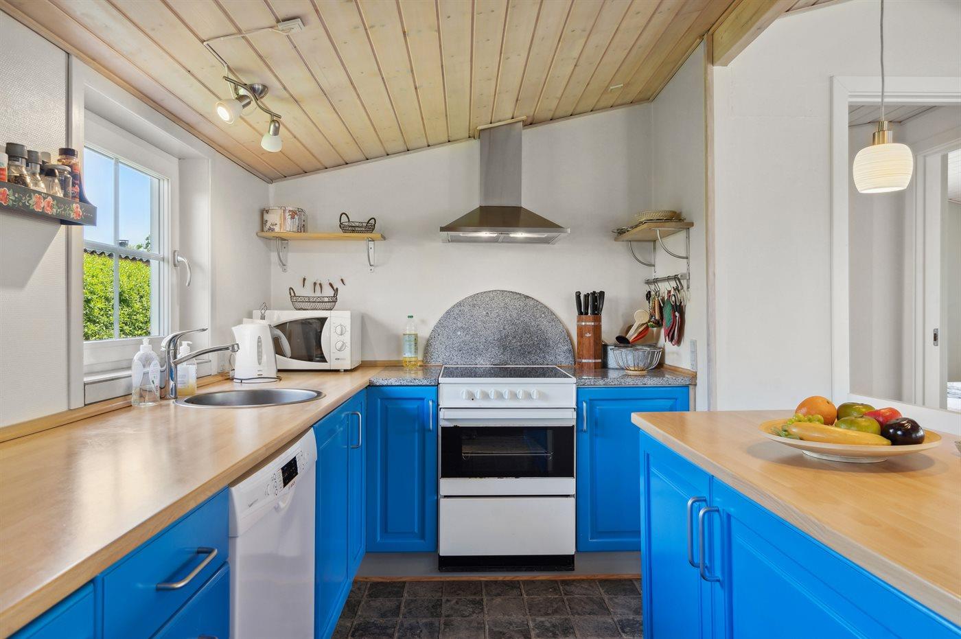 Køkkenet er udstyret med 1 køleskab. Der er 4 keramiske kogeplader, varmluftovn, mikrobølgeovn samt opvaskemaskine.