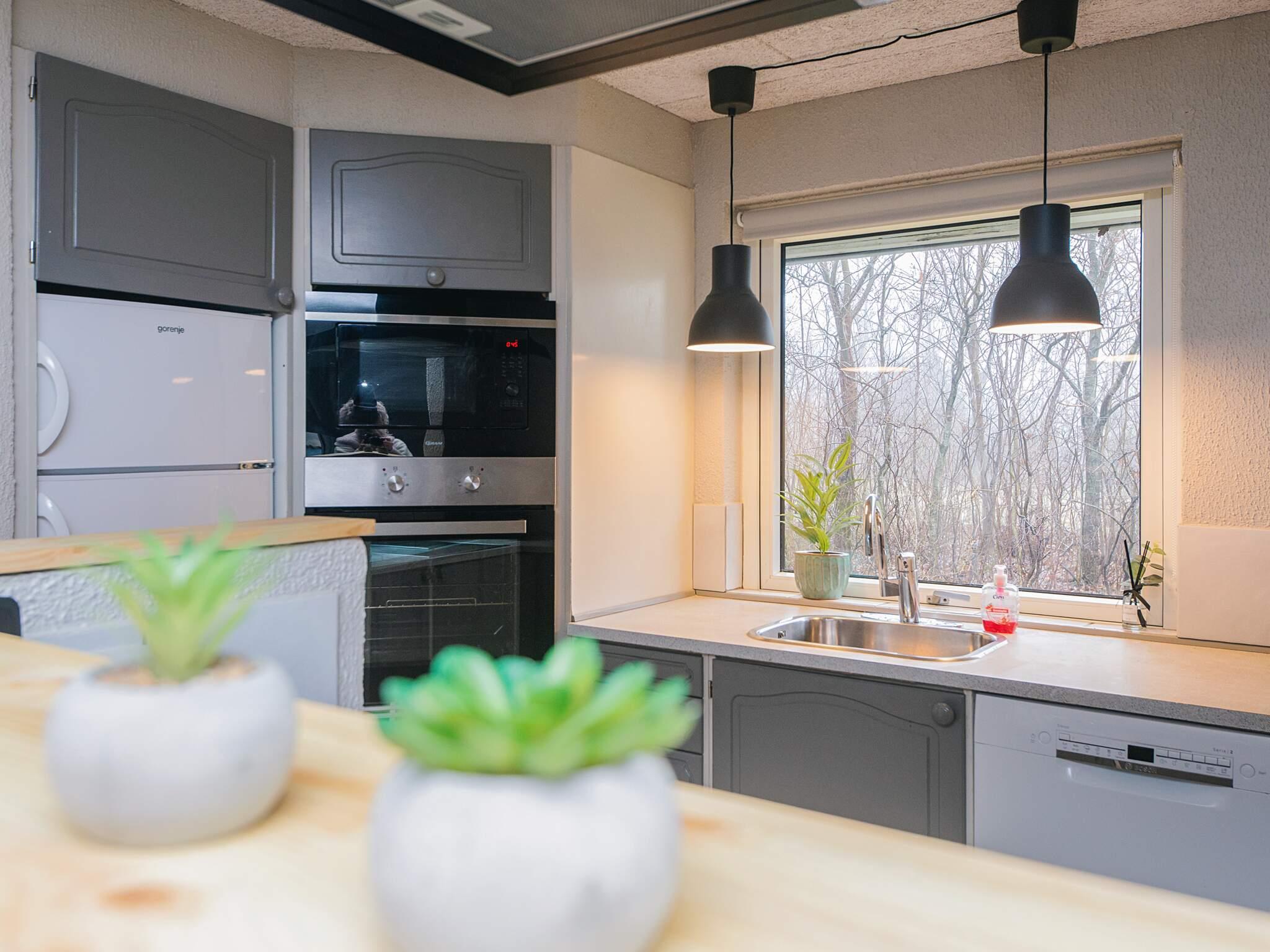 Køkken: El-komfur, køle-frys, fryser 1 - 59 l, mikroovn, kaffemaskine, opvaskemask.