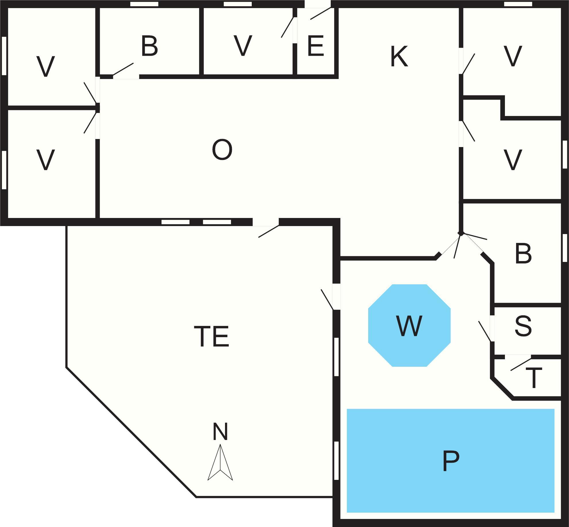 Fra spisepladsen og køkkenet kan I overvåge børnenes leg i poolen. Der er parabol, dvd, brændeovn og energibesparende varmepumper til både det store opholdsrum men også til poolen.