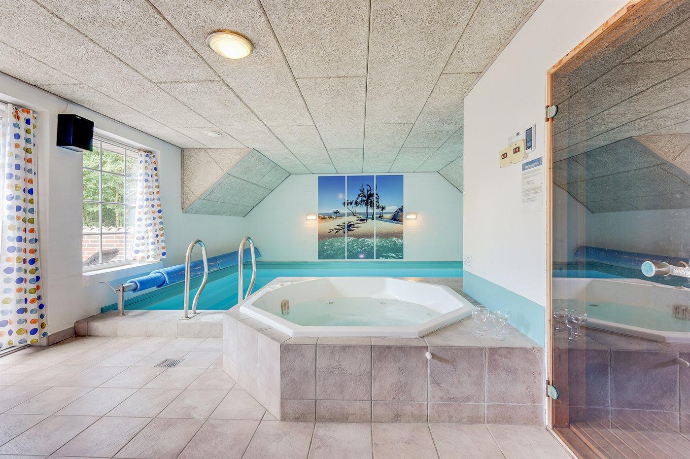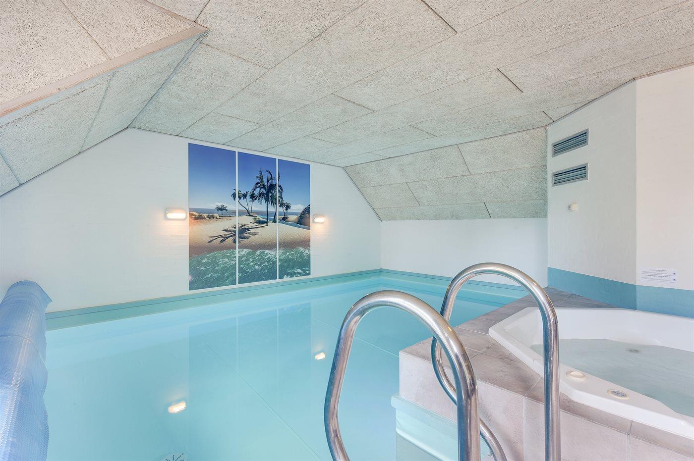 I den indendørs swimmingpool er der mulighed for leg og hyggeligt samvær. Swimmingpoolen måler op til 4 m i bredden, 5,9 m i længden og den er op til 1,25 m dyb. Vandet er mellem 24 og 28° C varmt. Der er gulvvarme i swimmingpoolområdet.