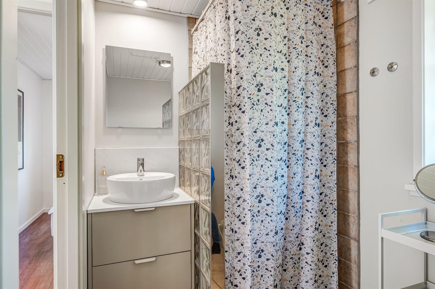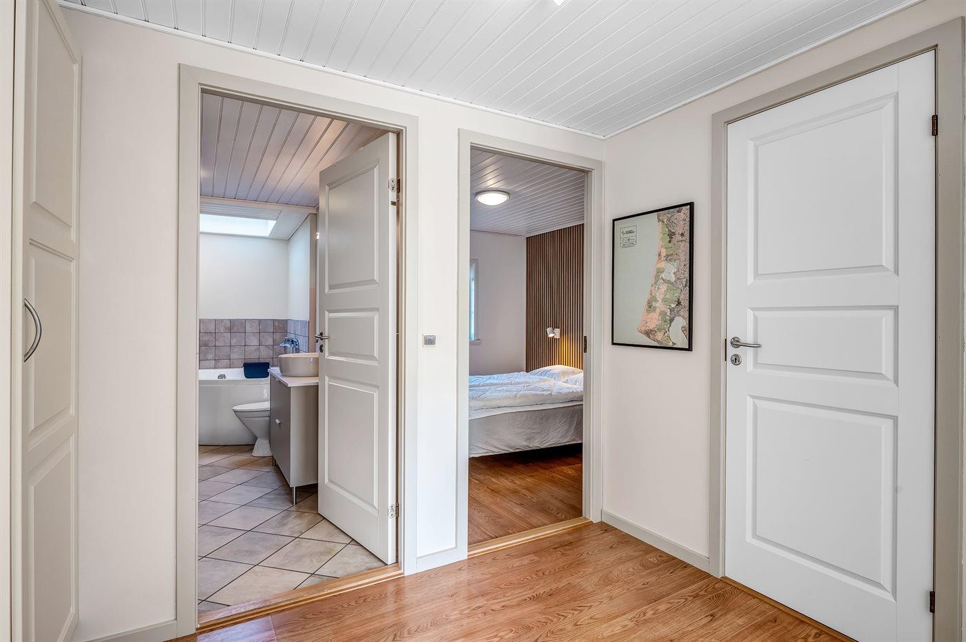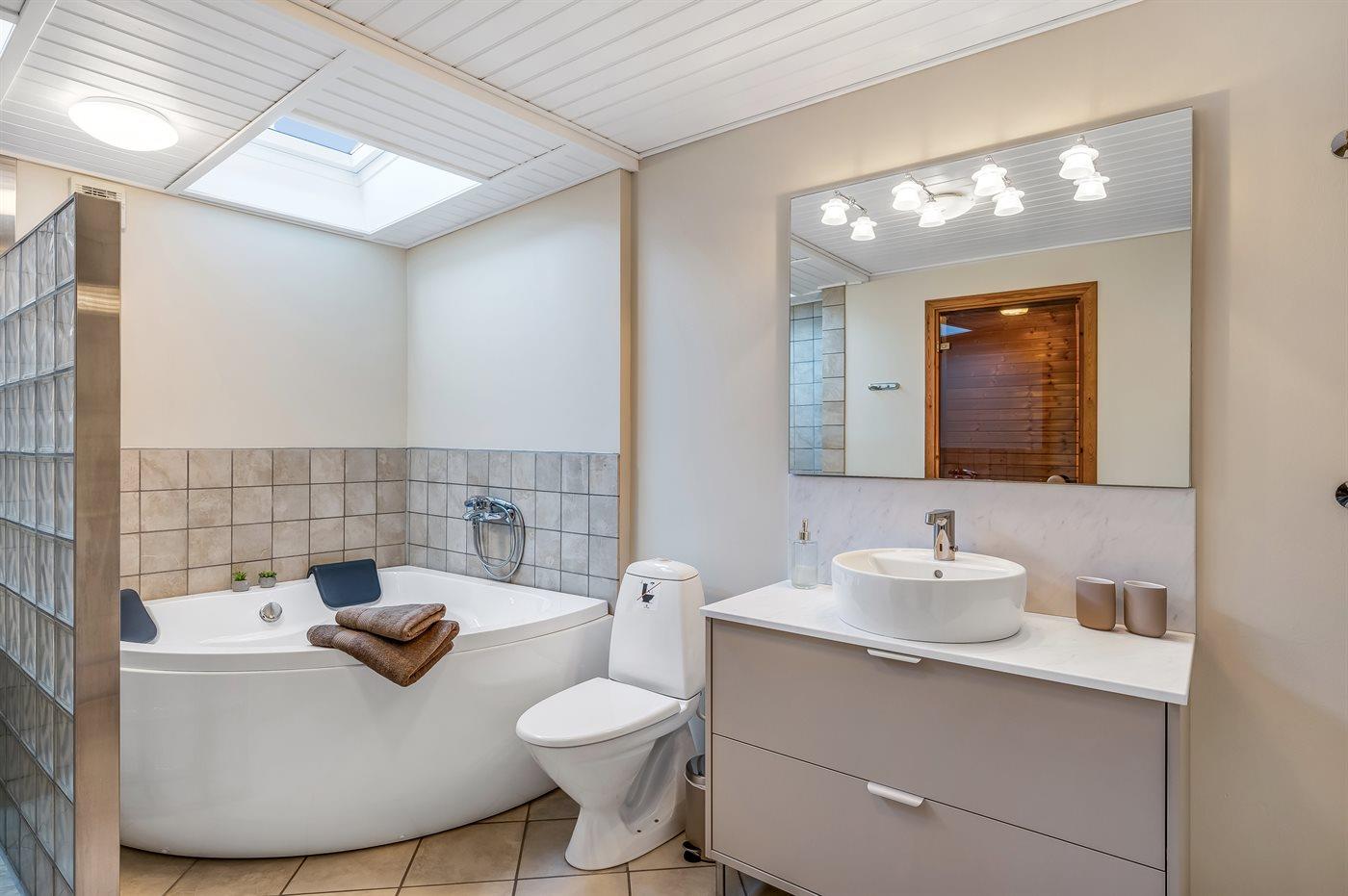 Der er 2 badeværelser med bruseniche og 2 toiletter. Der er gulvvarme på 2 badeværelser.. Badekar. I saunaen er der mulighed for afslapning.