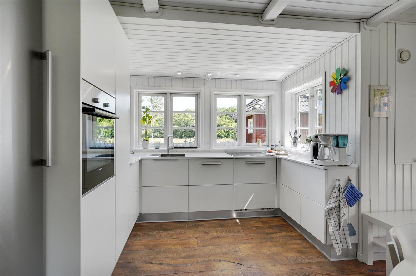 Køkkenet er udstyret med 1 køleskab. Der er 4 induktionskogeplader, varmluftovn, mikrobølgeovn samt opvaskemaskine.
