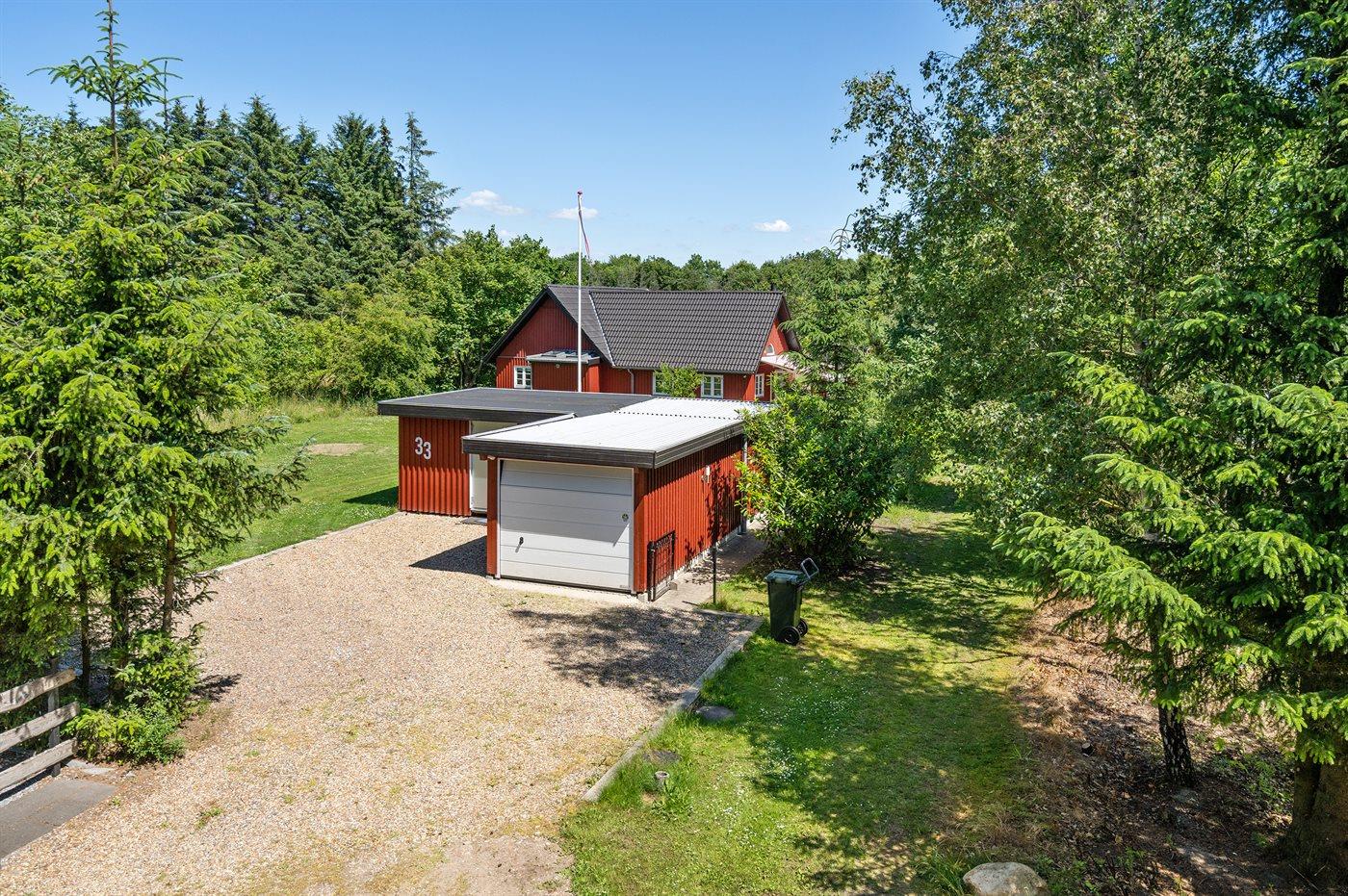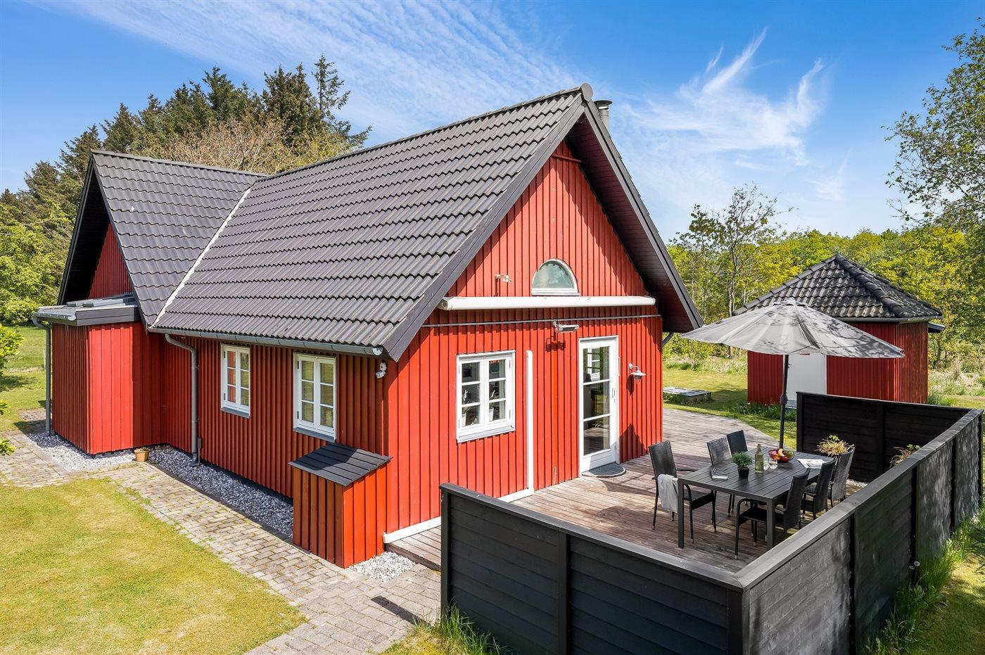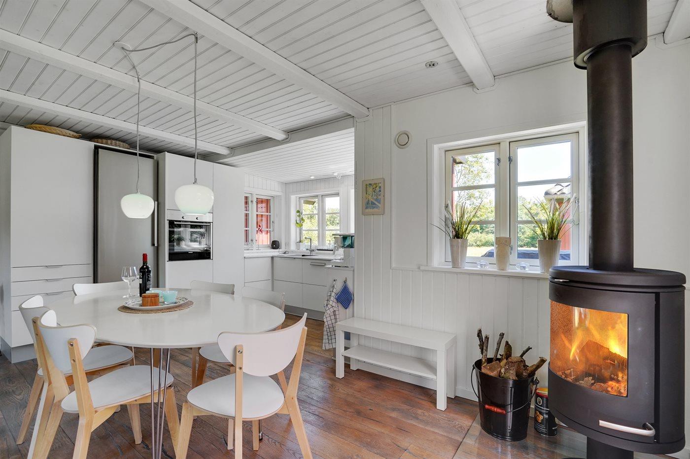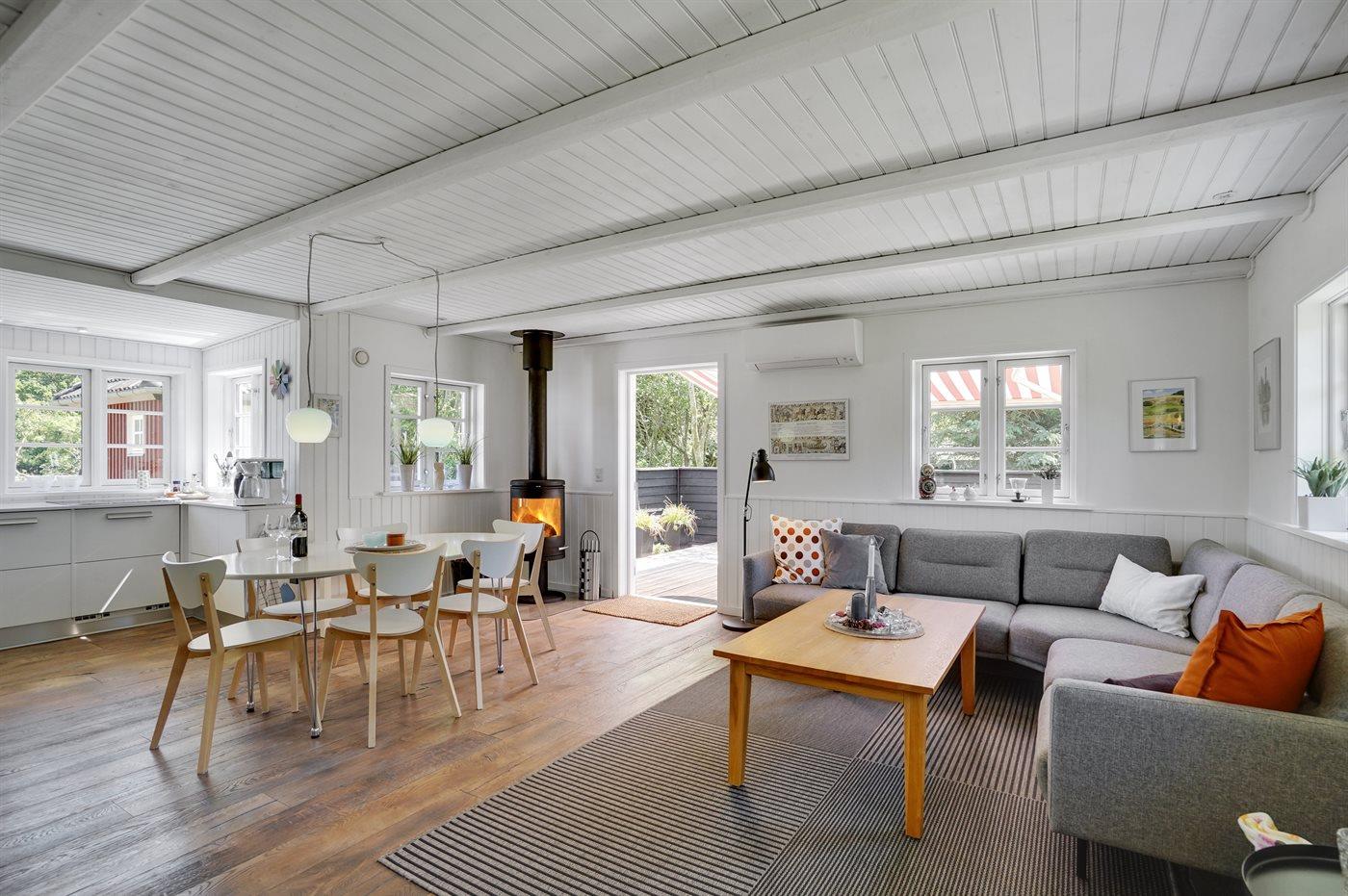 Dette skønne, svensk inspirerede sommerhus giver plads til at komme ned i gear og nyde naturen. Huset ligger på en ugenert grund sidst på vejen med have og udsigt ud til naturområde. Fra huset er der direkte adgang til områdets 11 km stier. Til huset hører også et aktivitetsrum med bl.a. vendbart pool- og air hockey bord samt fitness udstyr. Husets hjerte er den dejlige opholdsstue, der giver plads til ro og fordybelse i den store sofa, hvor hele familien kan nyde flammerne i brændeovnen eller se en god film i fjernsynet. Der er også bøger og spil som kan benyttes under opholdet.