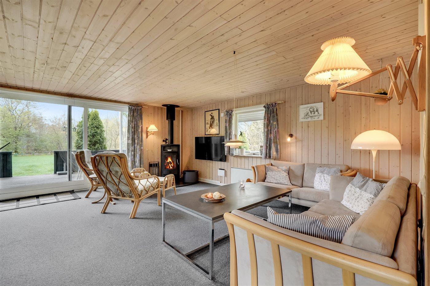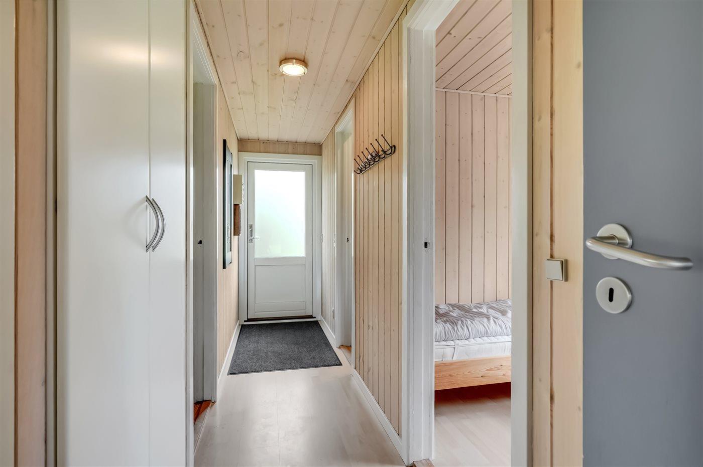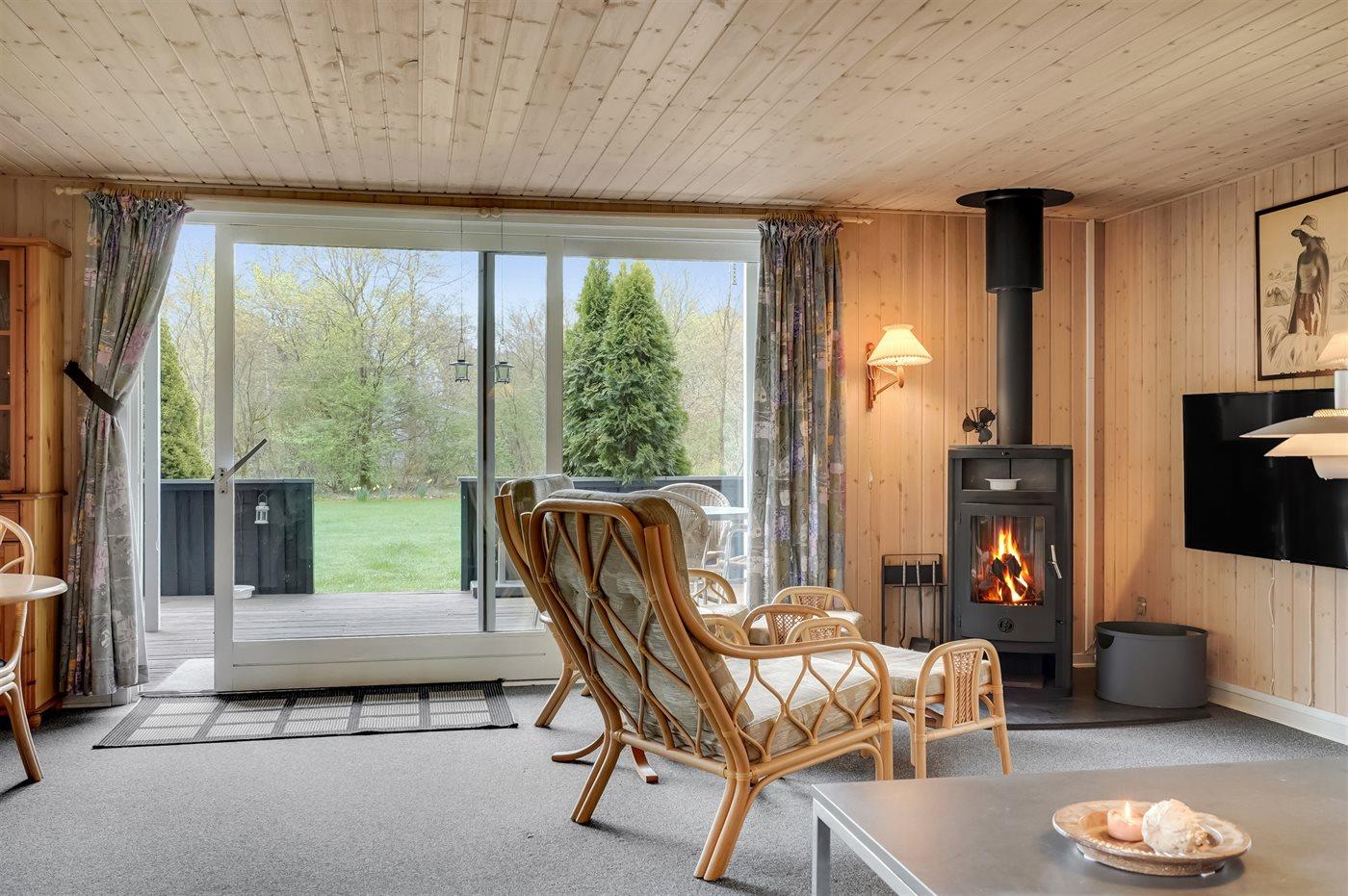 Sommerhusets køkken ligger i forbindelse med stuen, hvor der er et stort vinduesparti med udsigt til terrassen og haven. Ved vinduespartiet er der udgang til terrassen og haven. Foruden badeværelse med bruseniche er der 3 soverum i huset. I det ene værelse kan sengen deles til 2 enkeltsenge.