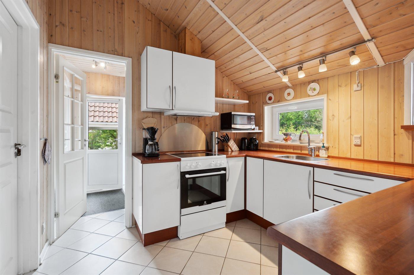 Køkkenet er udstyret med 1 køleskab. Der er 4 keramiske kogeplader, varmluftovn, mikrobølgeovn samt opvaskemaskine.