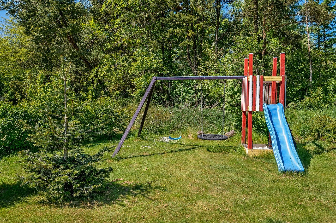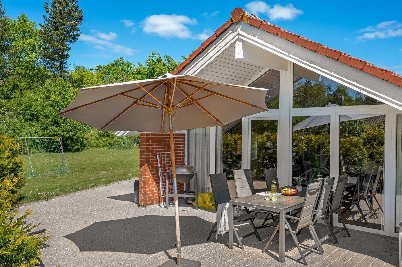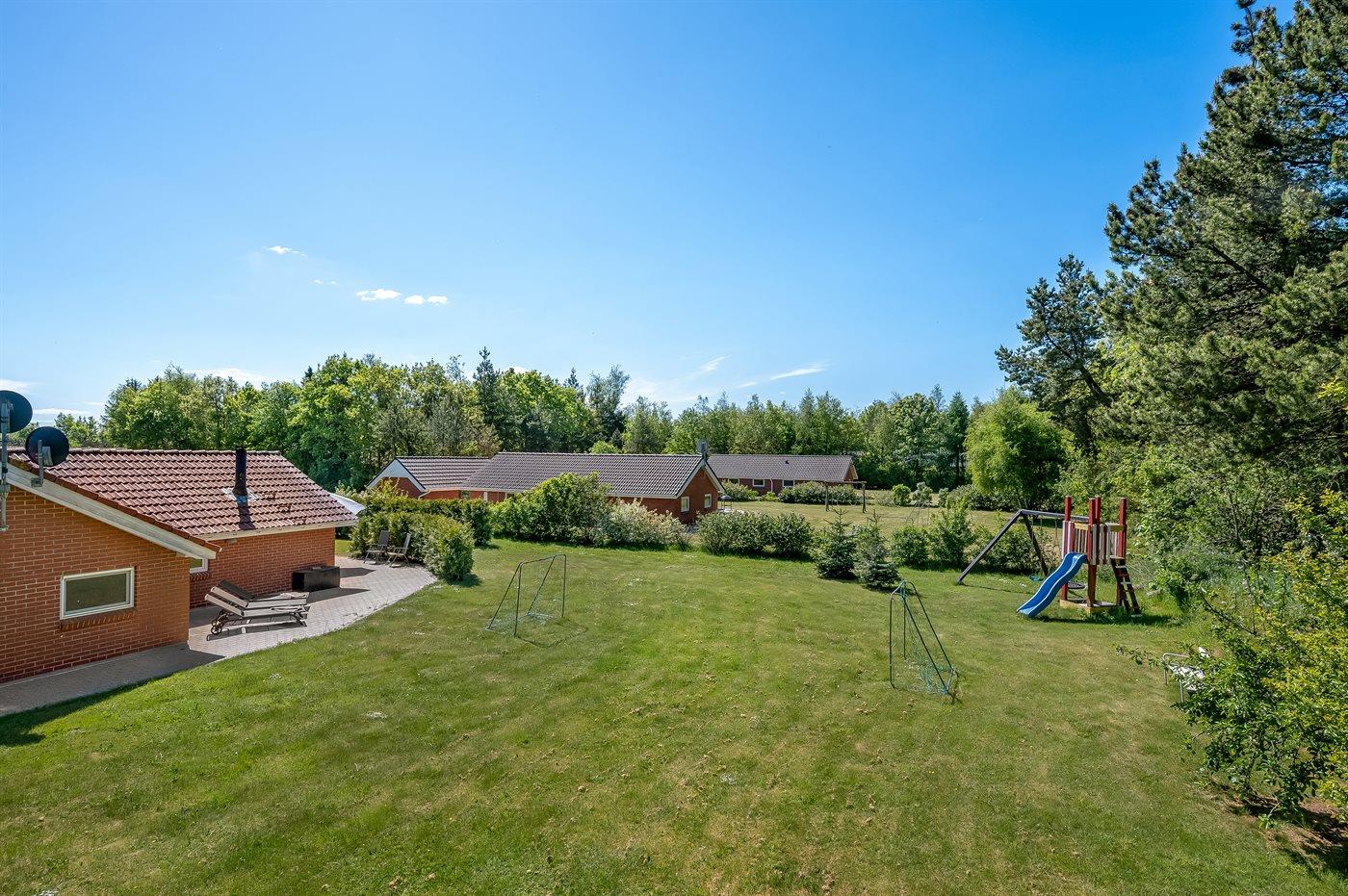 Ferieboligen er beliggende på en 1600 m² stor havegrund. Der er 10000 m til havet. Nærmeste forretning er beliggende i en afstand af 3500 m. Til ferieboligen hører 100 m² terrasseareal. Desuden er der 8 m² overdækket terrasse. Der er redskabsrum. Gynge. Sandkasse. Legetårn. Fodboldmål. Der er carport til rådighed. Der er installeret stik til opladning af elbil. Type 2 stik. Med 11 kW ladeeffekt. Parkering ved ferieboligen.