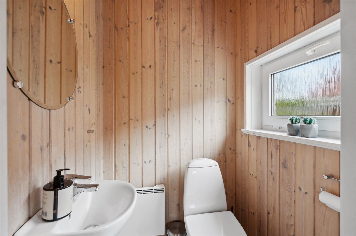 Der er 1 badeværelse med bruser og 2 toiletter, heraf 1 gæstetoilet. Der er gulvvarme på 1 badeværelse. I saunaen er der mulighed for afslapning.
