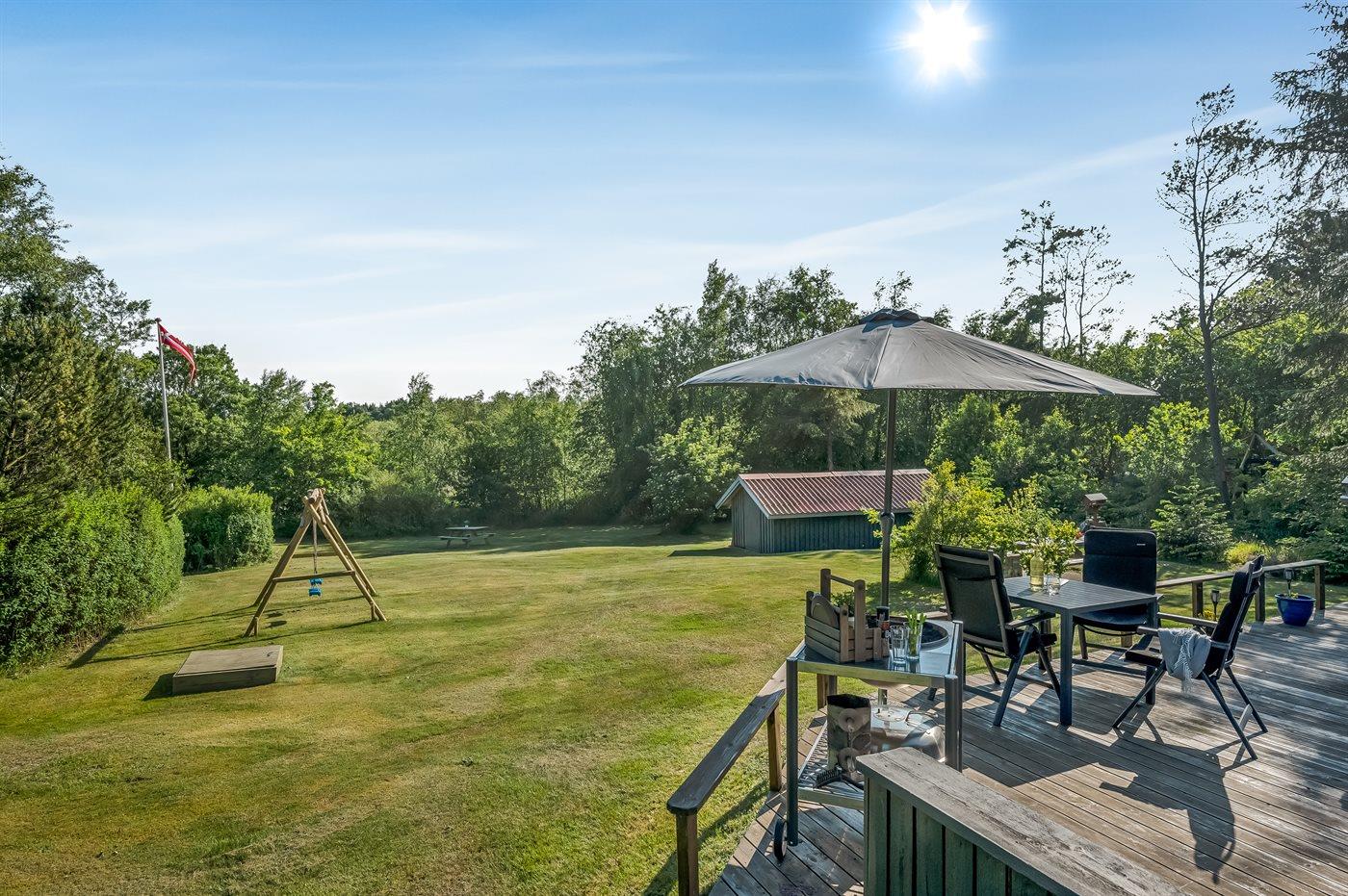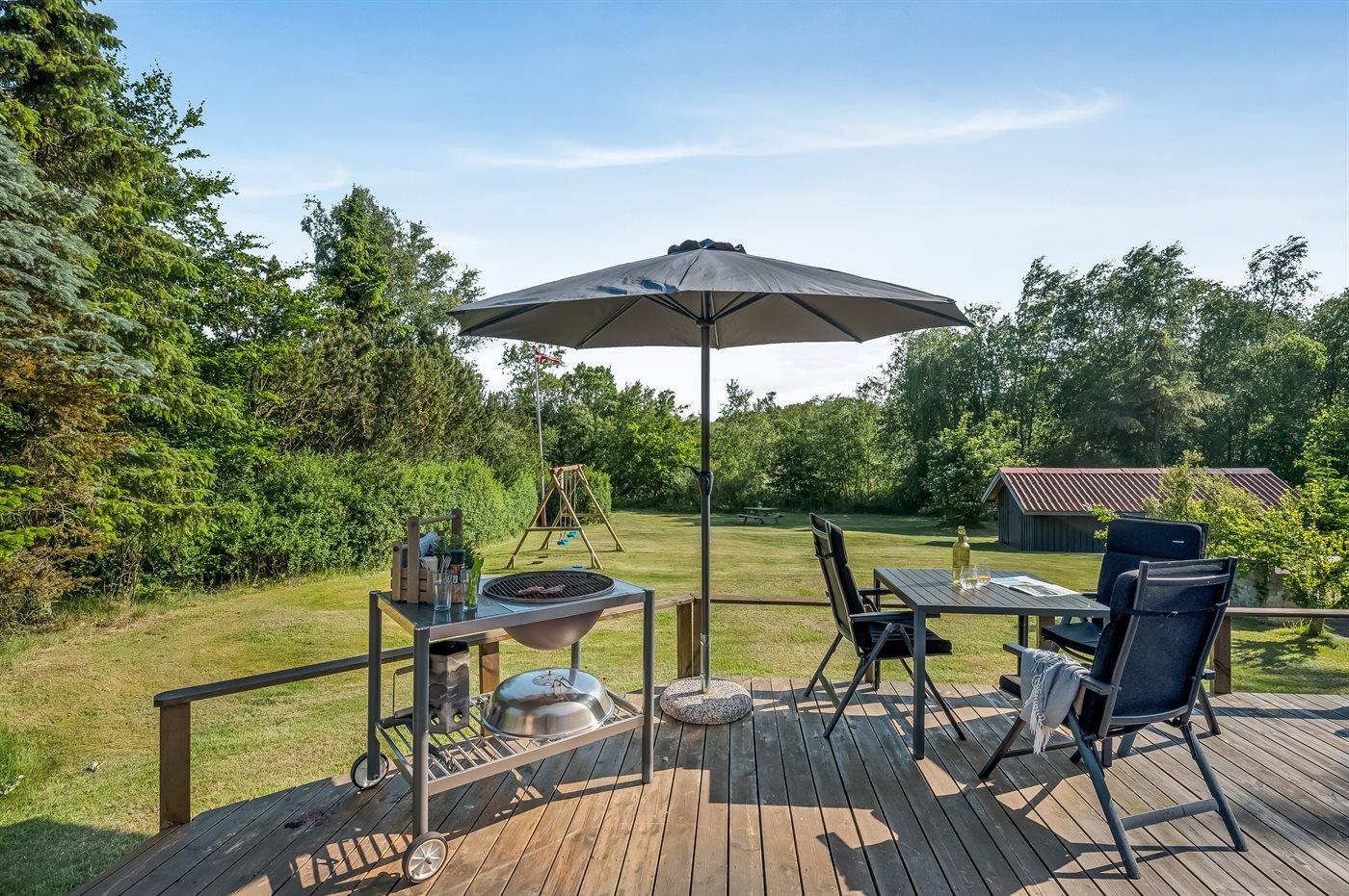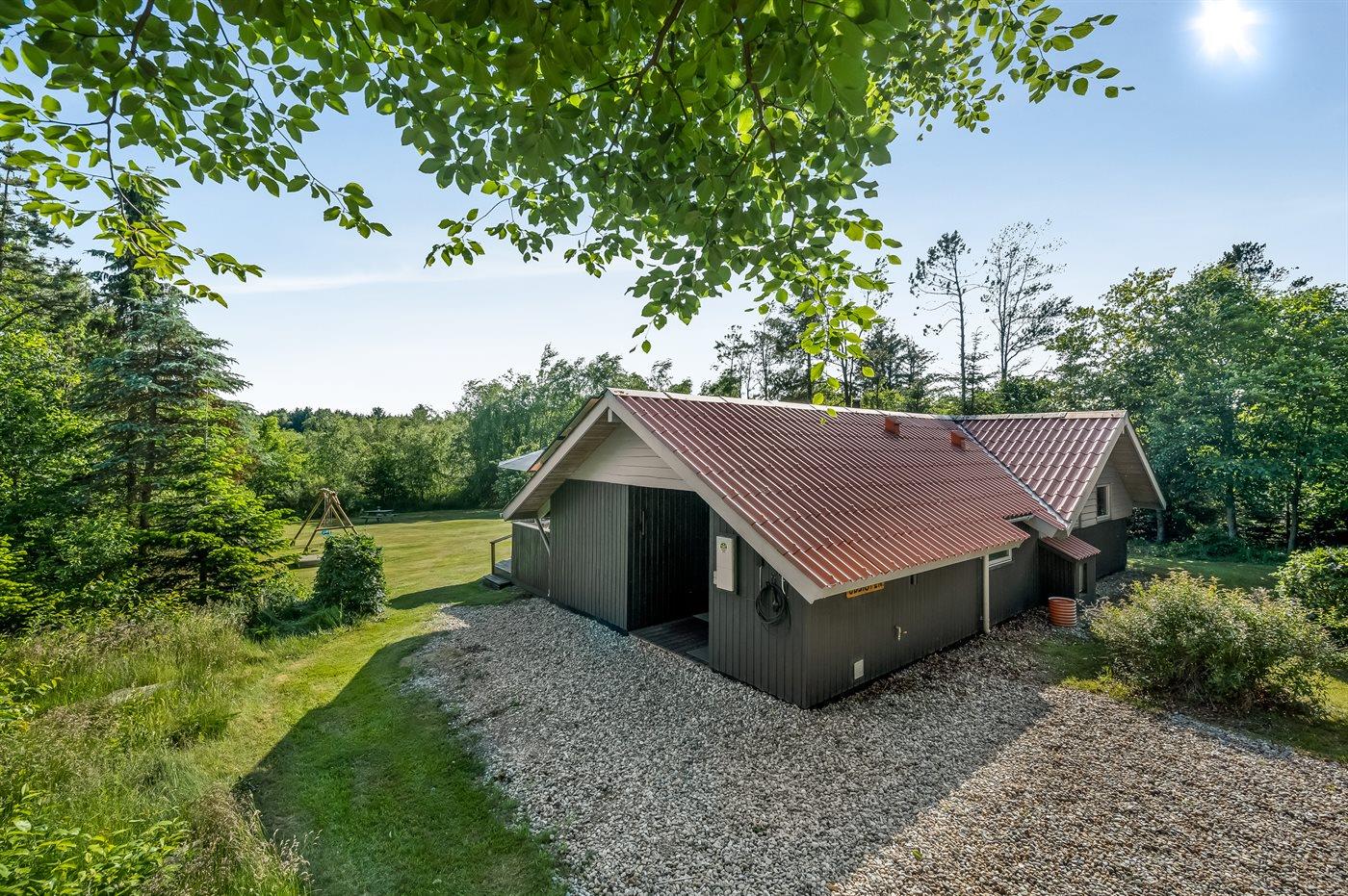 Ferieboligen er beliggende på en 1535 m² stor naturgrund. Der er 12000 m til havet. Nærmeste forretning er beliggende i en afstand af 600 m. Til ferieboligen hører 45 m² terrasseareal. Desuden er der 12 m² overdækket terrasse. Gynge. Sandkasse. Der er installeret stik til opladning af elbil. Med 11 kW ladeeffekt. Parkering ved ferieboligen.