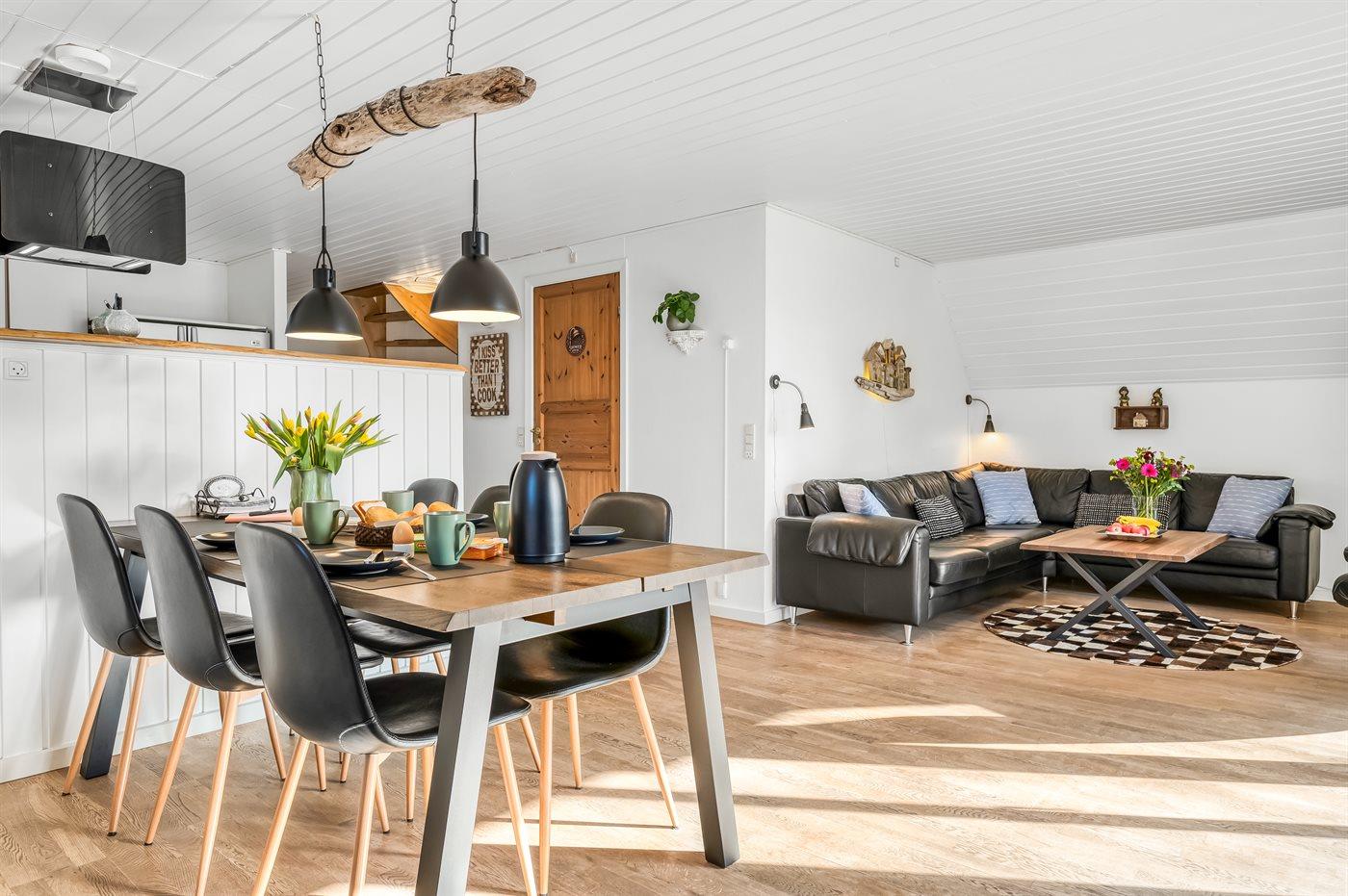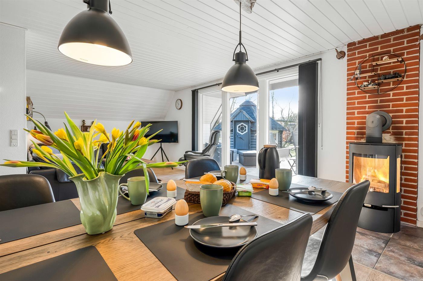 Husets hjerte er det lyse og indbydende køkken/alrum, som ligger i åben forbindelse med stuen. Her kan I samles om madlavning, brætspil og gode samtaler, mens brændeovnen knitrer, og feriestemningen breder sig. De rolige omgivelser sørger en afslappende atmosfære for privatliv – perfekt til både familier og vennegrupper.
