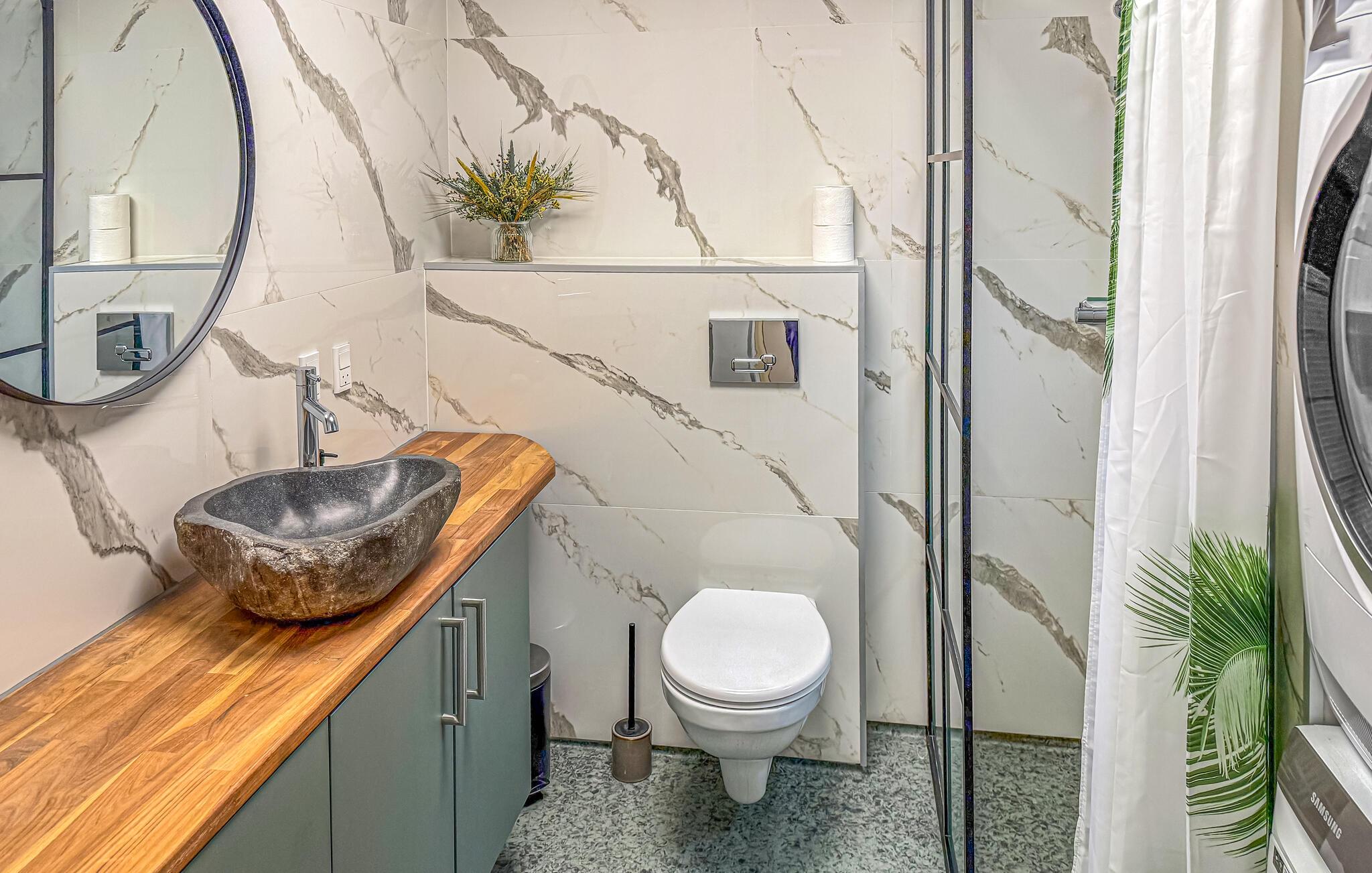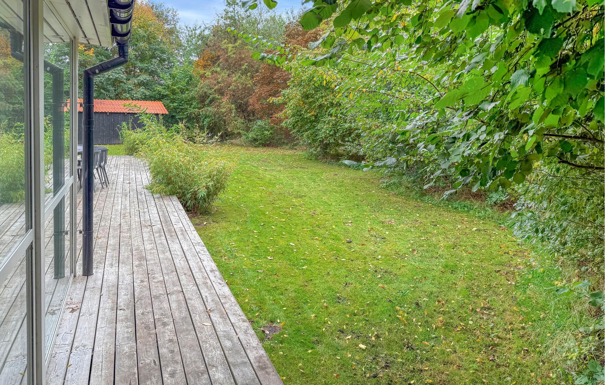 Den store grund giver plads til leg, afslapning og frisk luft. Gå ud på den rummelige træterrasse, hvor komfortable havemøbler og en grill venter på jer. Tag et bad i vildmarksbadet, og nyd stilheden og udsigten over de grønne omgivelser.