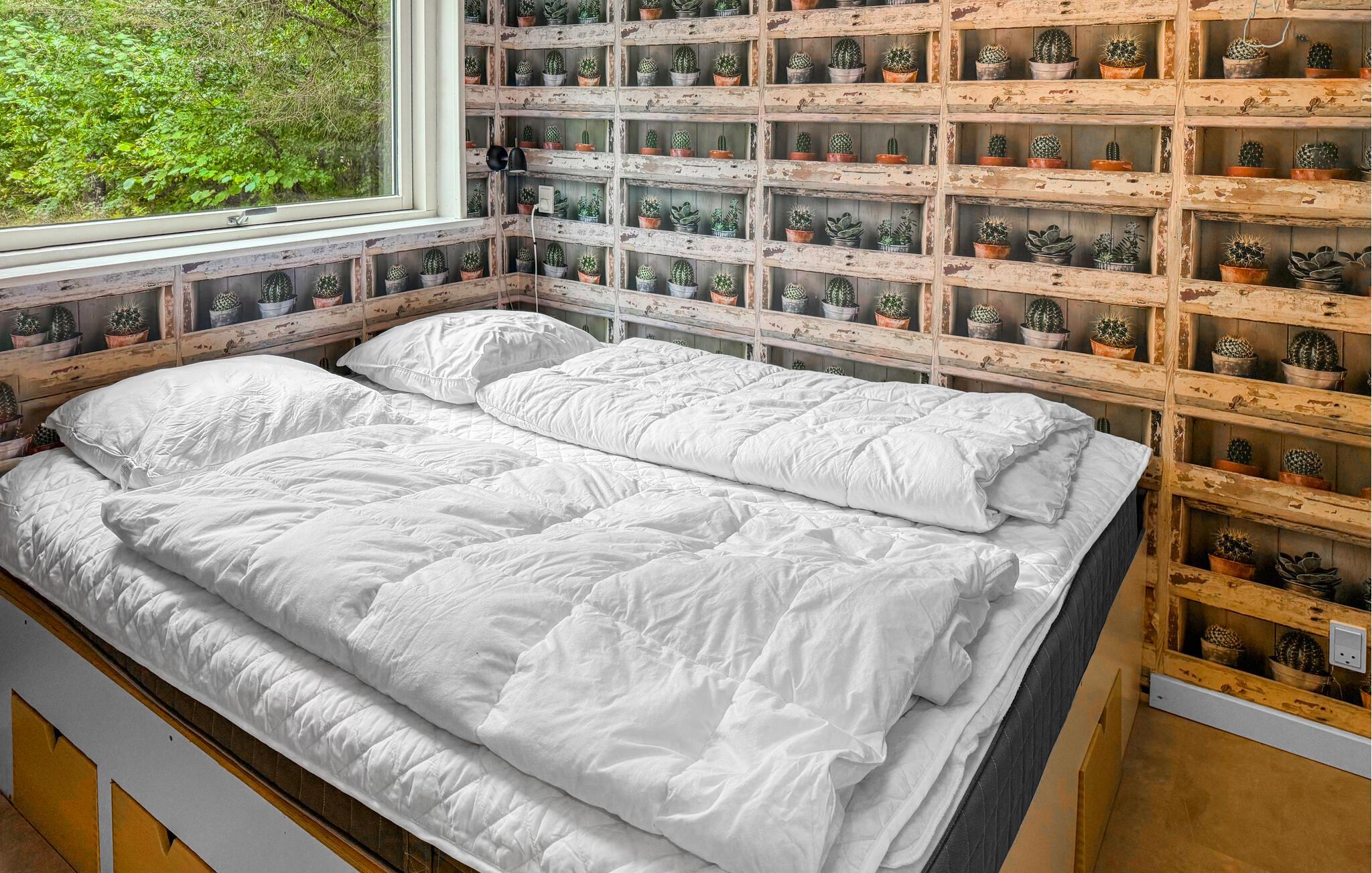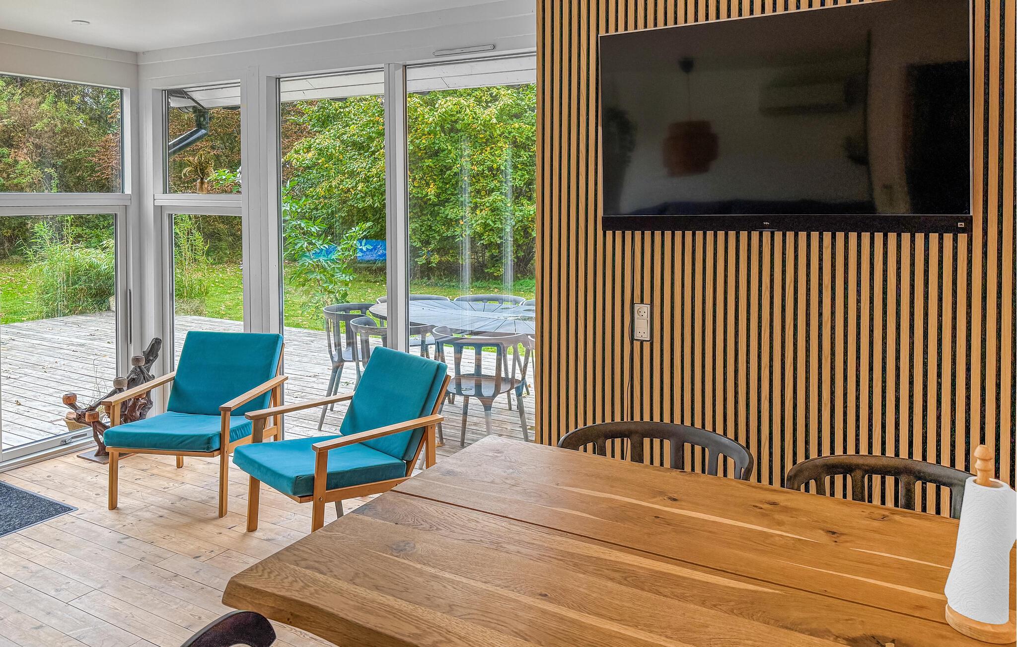 Nyd rolige dage i jeres smagfuldt indrettede feriehus, som ligger på en fredelig, grøn grund og giver god plads til fælles stunder. Træd indenfor, og lad jer byde velkommen af det moderne design. De store vinduespartier skaber lyse rum med udsigt til naturen. Hyg jer sammen i den store hjørnesofa, og nyd jeres måltider ved det lange træbord. Den stilrene indretning med varme træelementer og blødt lys skaber en behagelig atmosfære. I det åbne køkken med god bordplads og moderne udstyr kan I nemt tilberede jeres måltider.