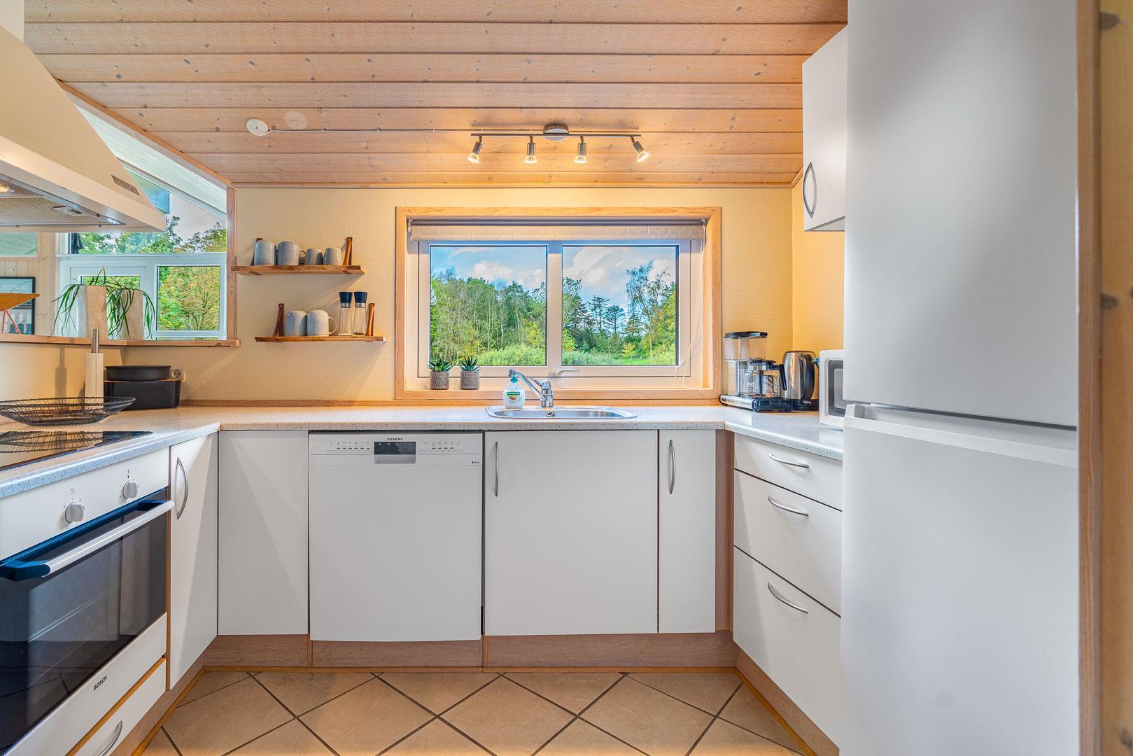 Køkkenet er moderne og fuldt udstyret – med opvaskemaskine, komfur, ovn, køleskab og kaffemaskine. Selv her er der gulvvarme, så madlavningen bliver en fornøjelse.