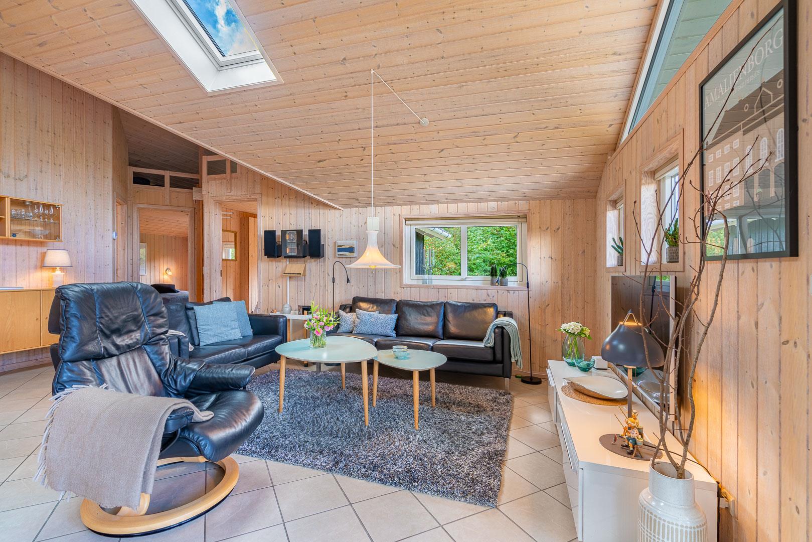 Det åbne køkken-alrum er husets hjerte. Her kan I samles i den bløde sofakrog til film og spil, mens de store vinduer giver masser af lys og udsigt til haven.