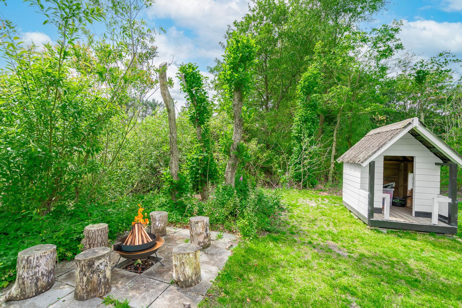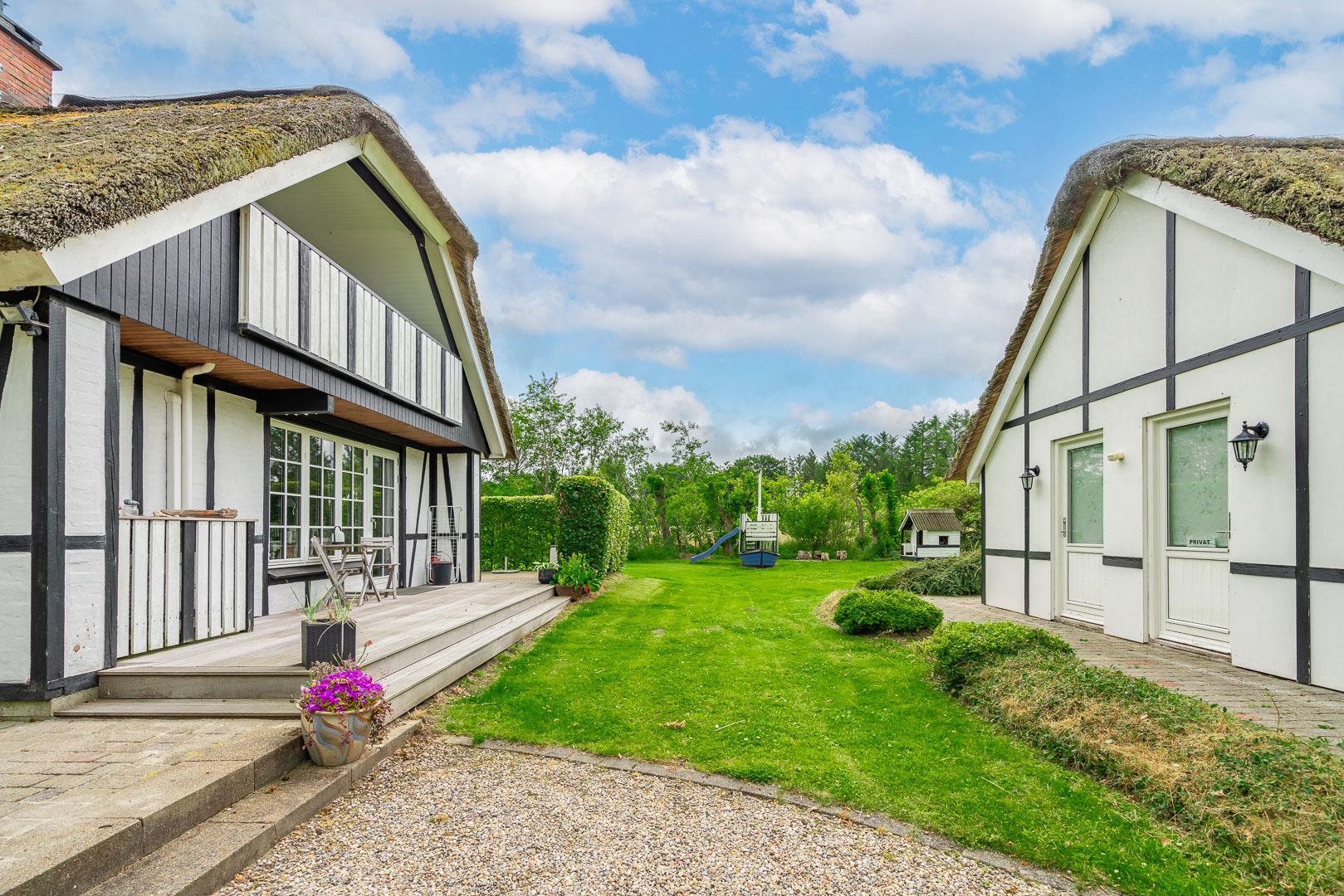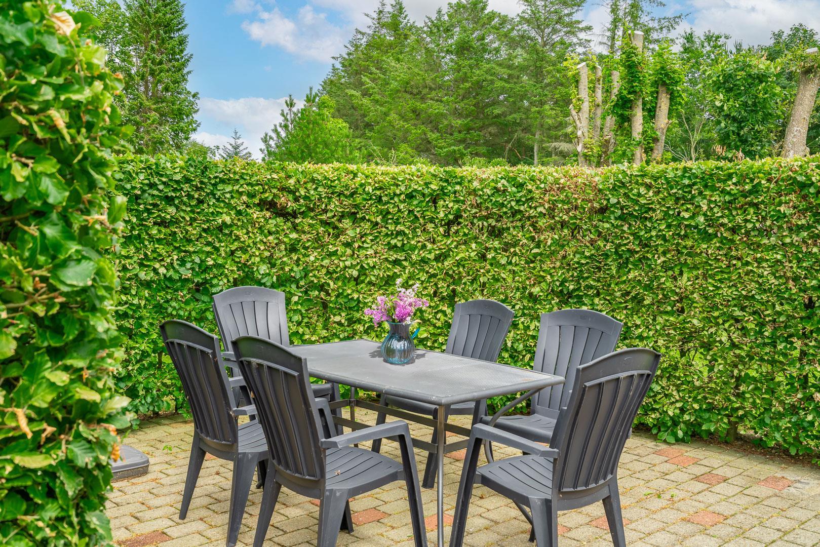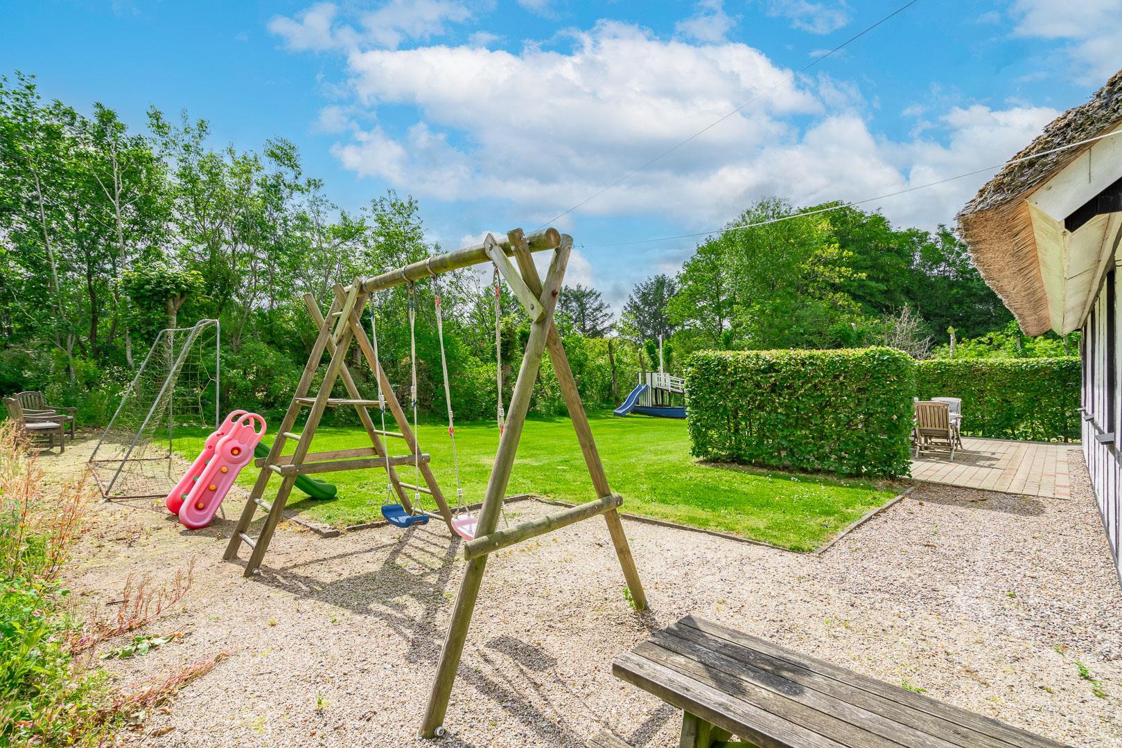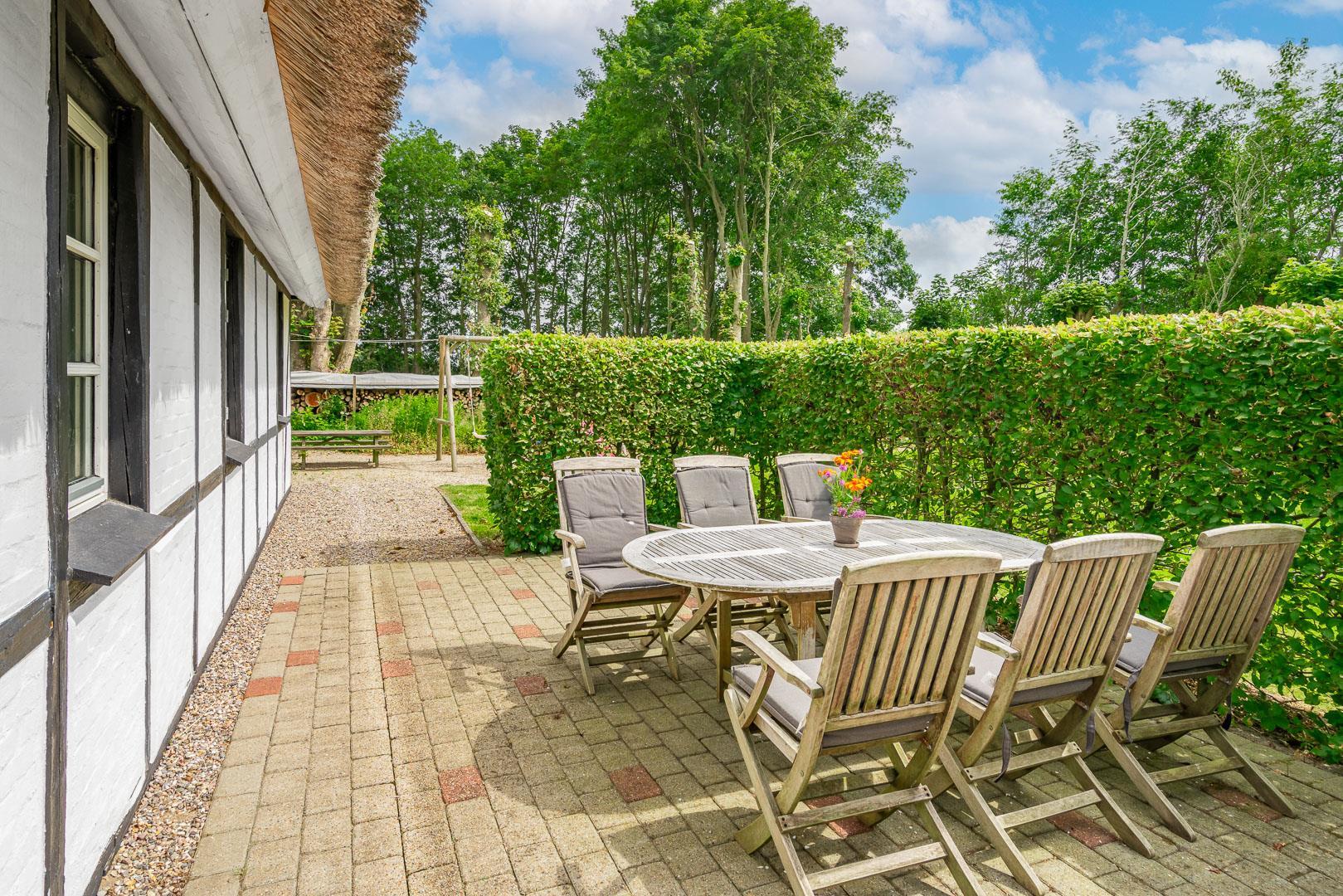 Udendørs byder Møllevangen 22 på en stor terrasse med havemøbler – ideel til morgenkaffen i solen eller hyggelige aftener med familien. Børnene kan more sig med gyngen og sandkassen, mens hunden slapper af efter en god gåtur ved havet.
