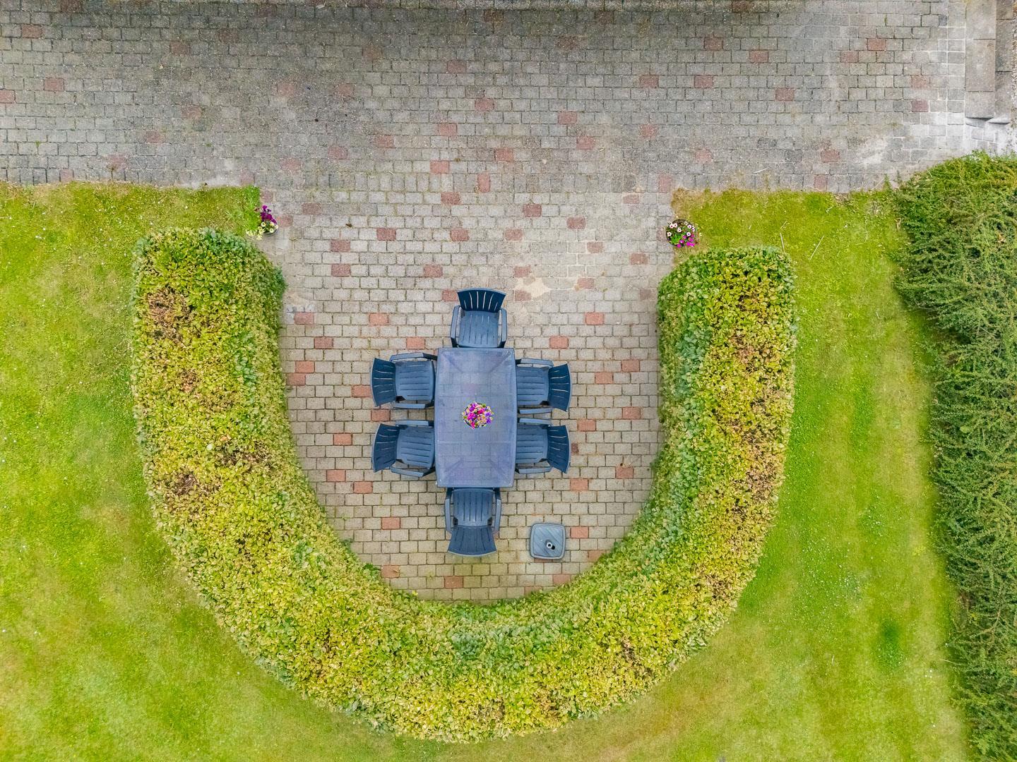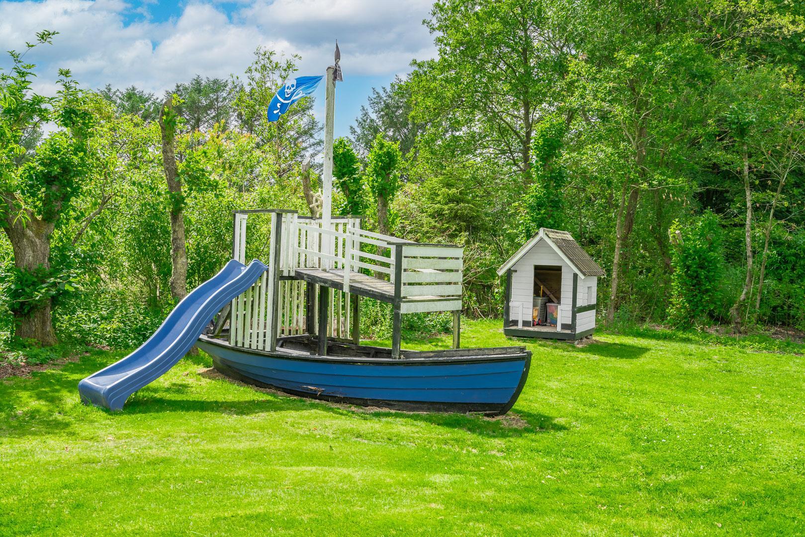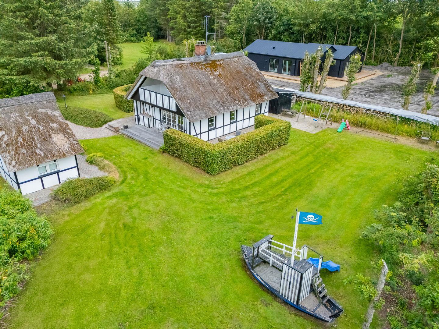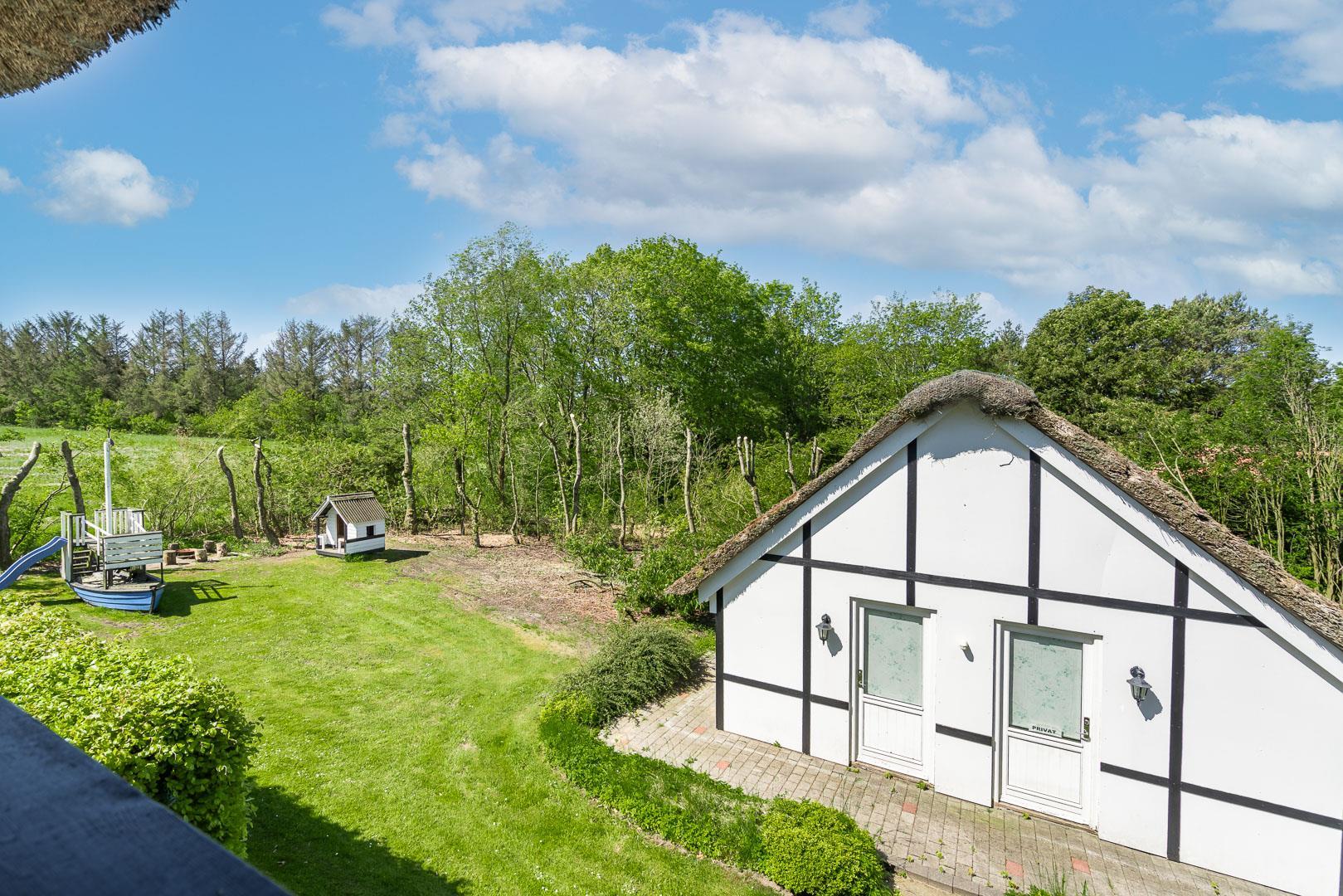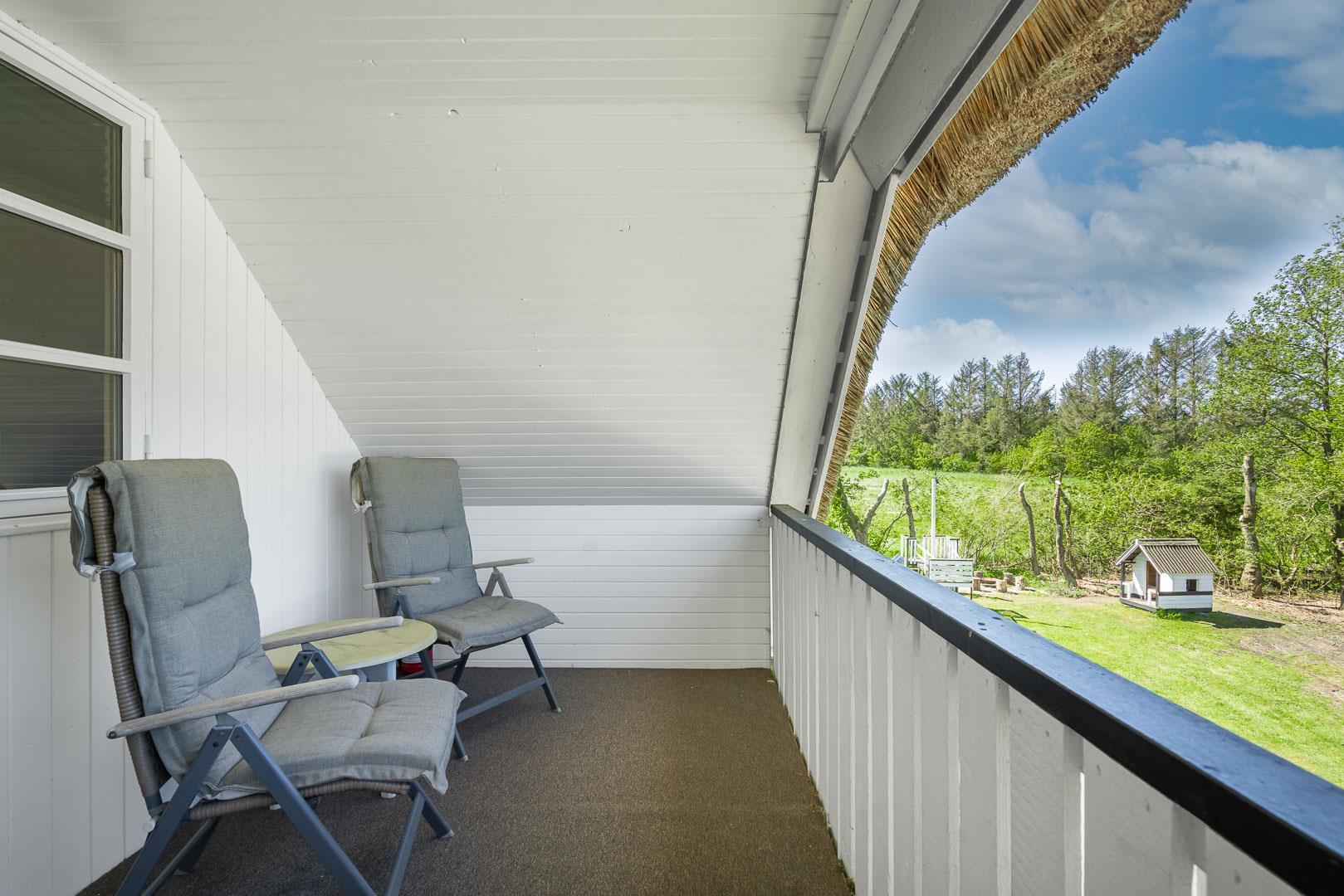 Udendørs byder Møllevangen 22 på en stor terrasse med havemøbler – ideel til morgenkaffen i solen eller hyggelige aftener med familien. Børnene kan more sig med gyngen og sandkassen, mens hunden slapper af efter en god gåtur ved havet.