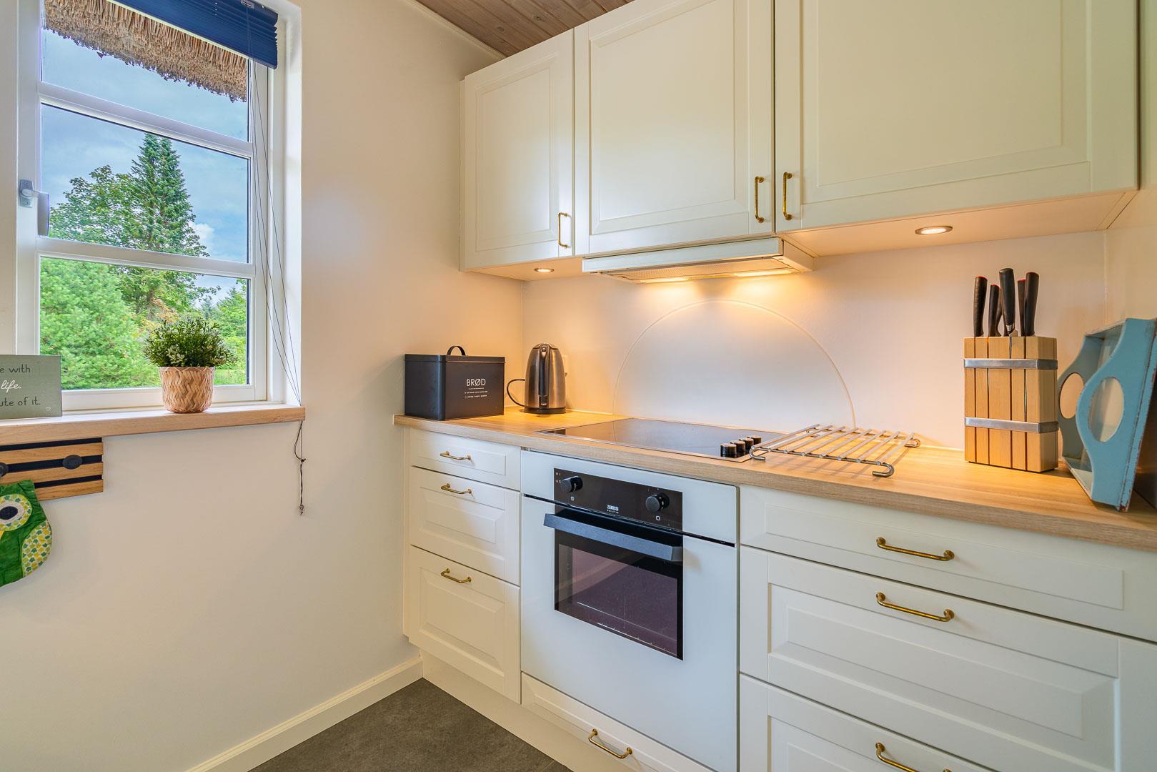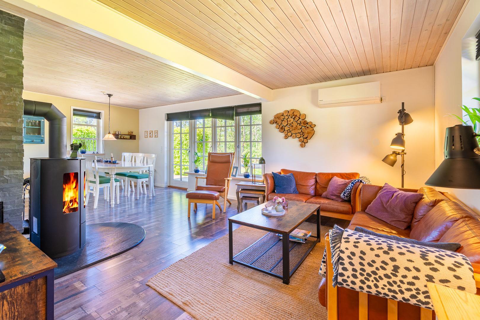 Sommerhuset er løbende renoveret og kombinerer klassisk dansk hygge med moderne komfort. De store vinduer i stuen og spiseområdet lukker masser af lys ind, mens brændeovnen spreder varme og stemning. En energivenlig varmepumpe sørger for et behageligt indeklima – både bæredygtigt og økonomisk.