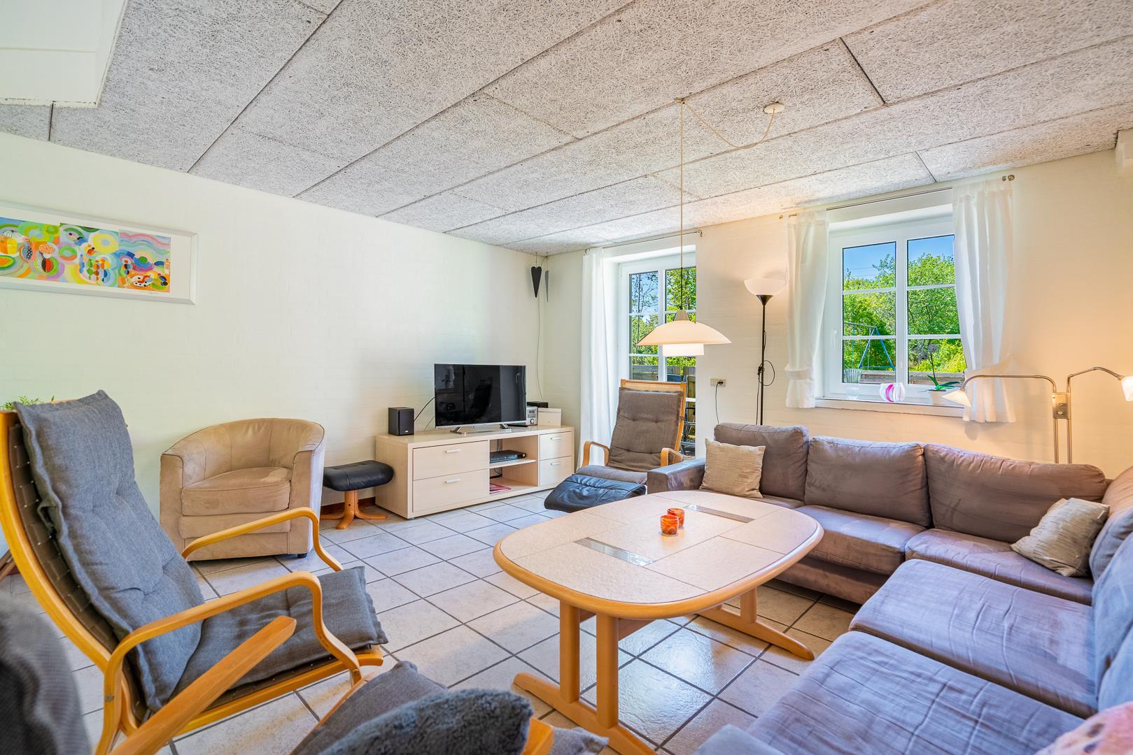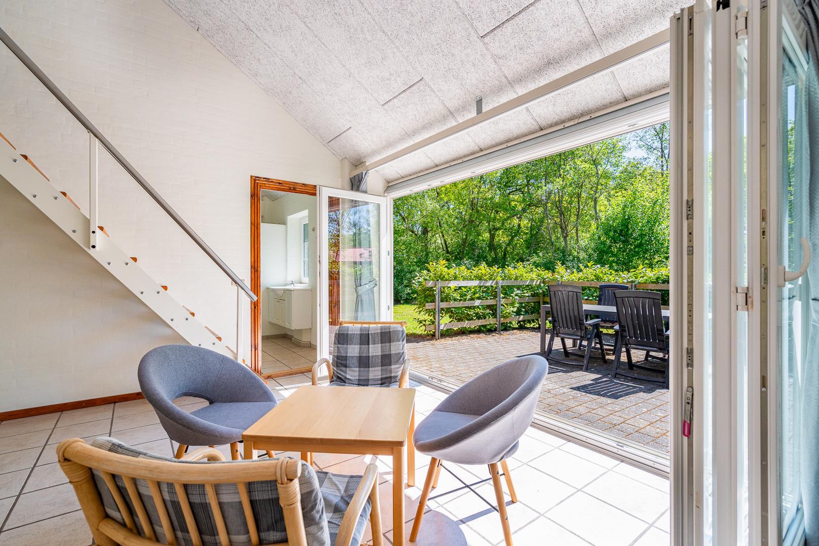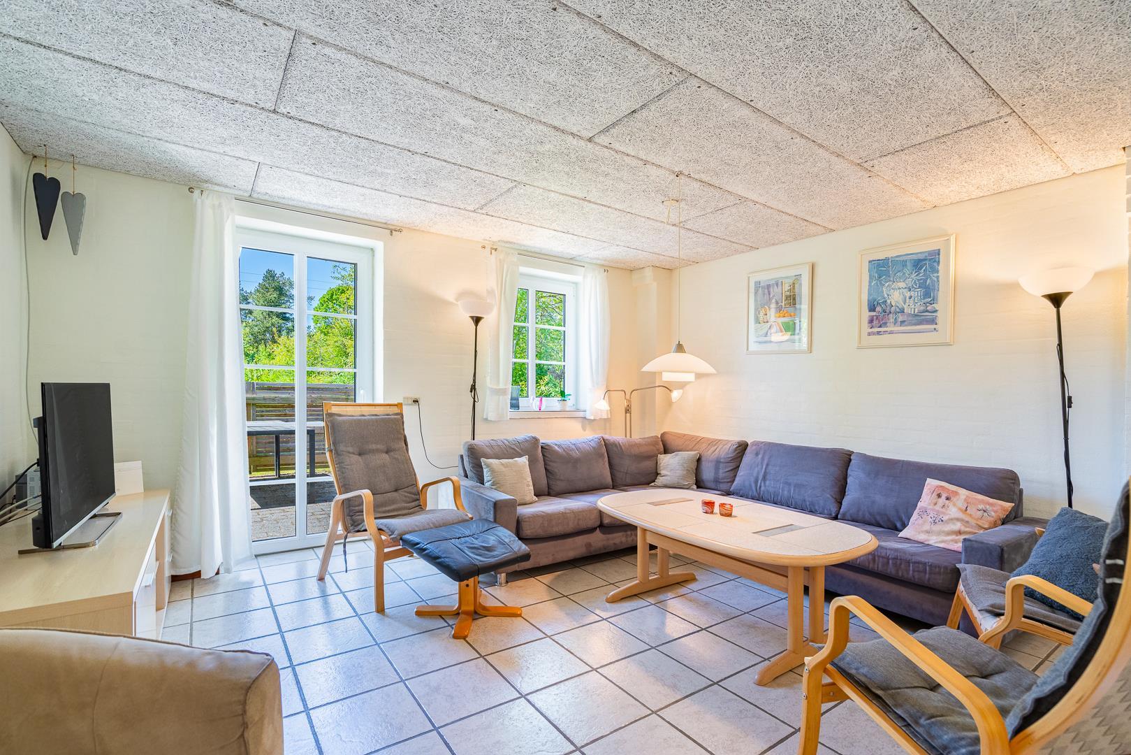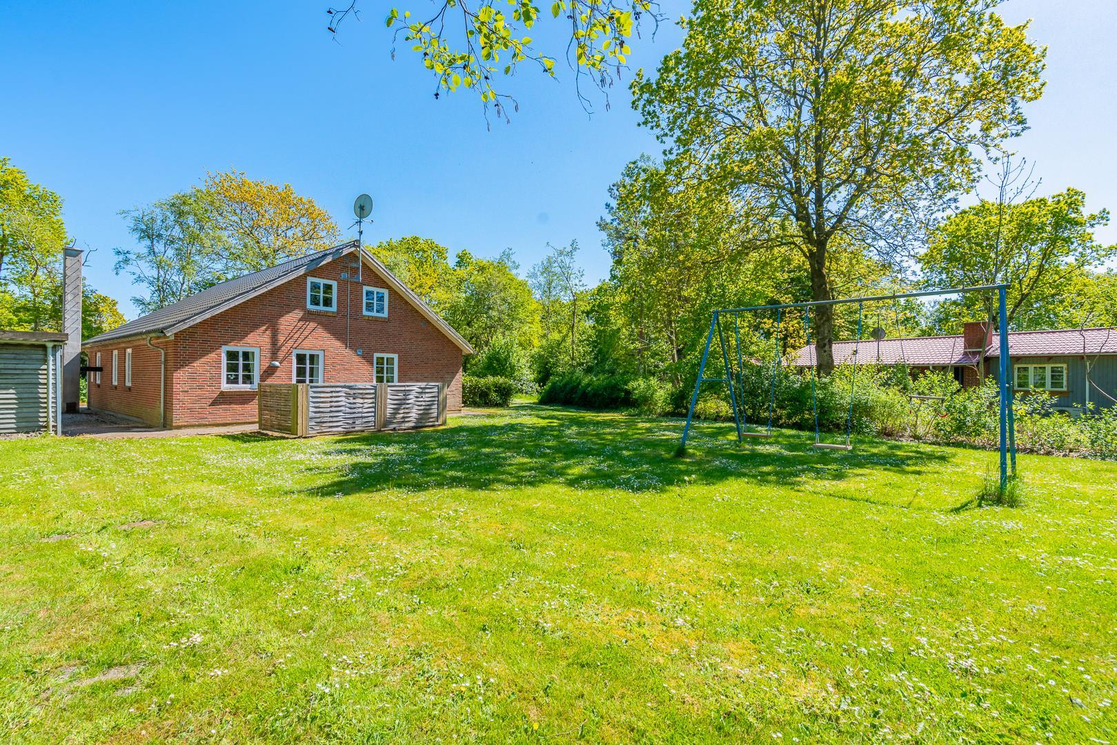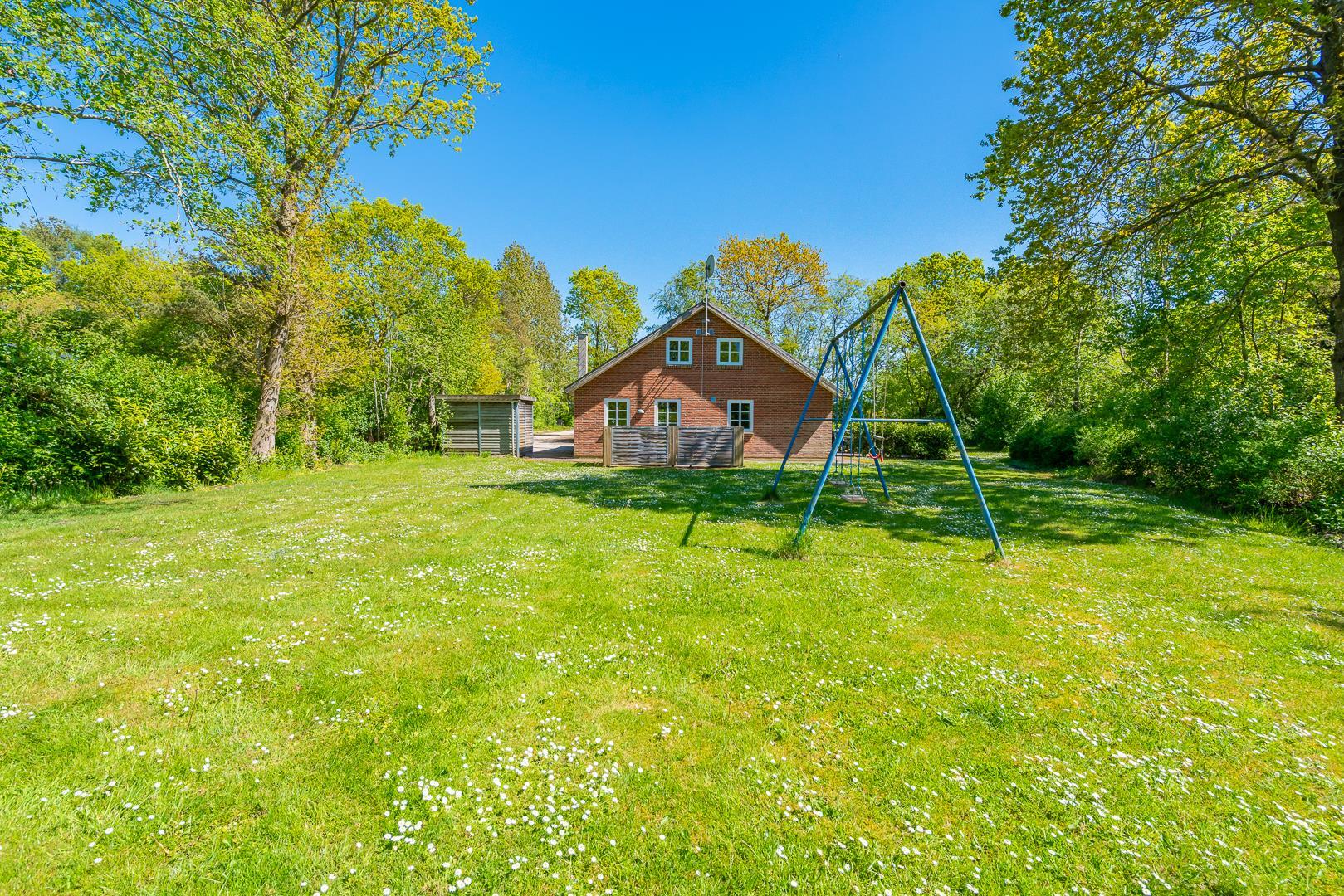 Huset ligger naturskønt på en stor lukket grund, hvor haven er omkranset af træer. Her er en dejlig terrasse med havemøbler, grill og parasol. I haven finder du også et gyngestativ til børnene.