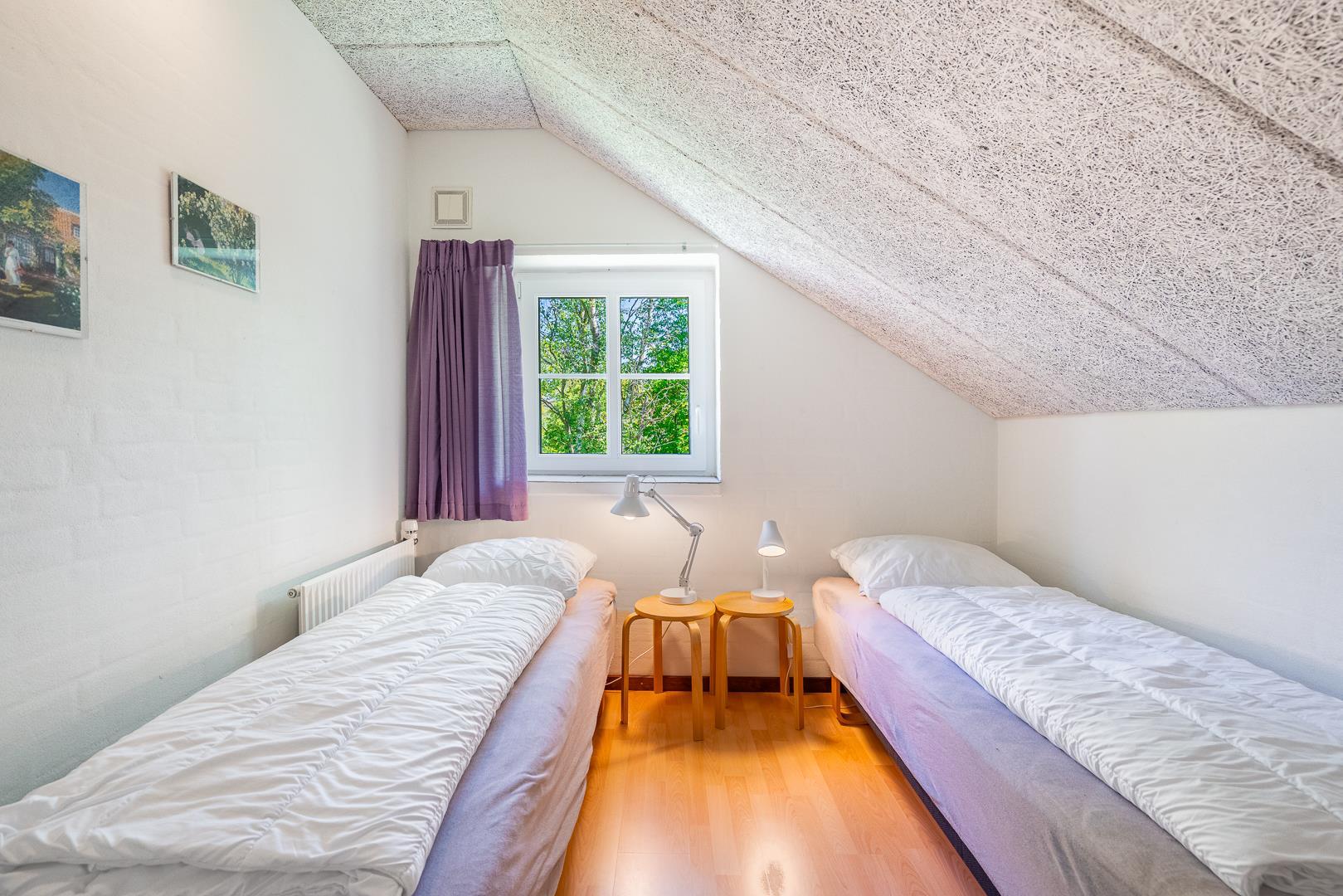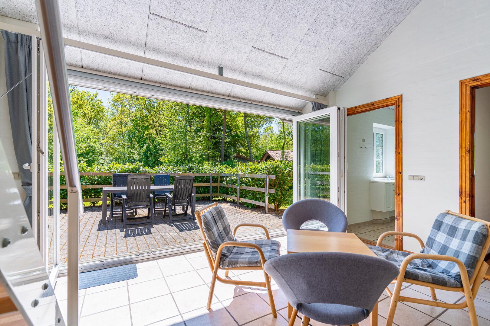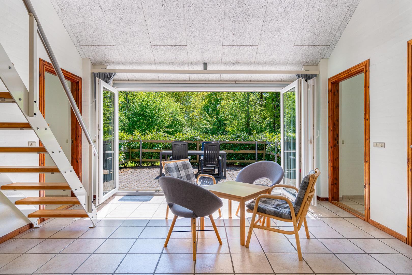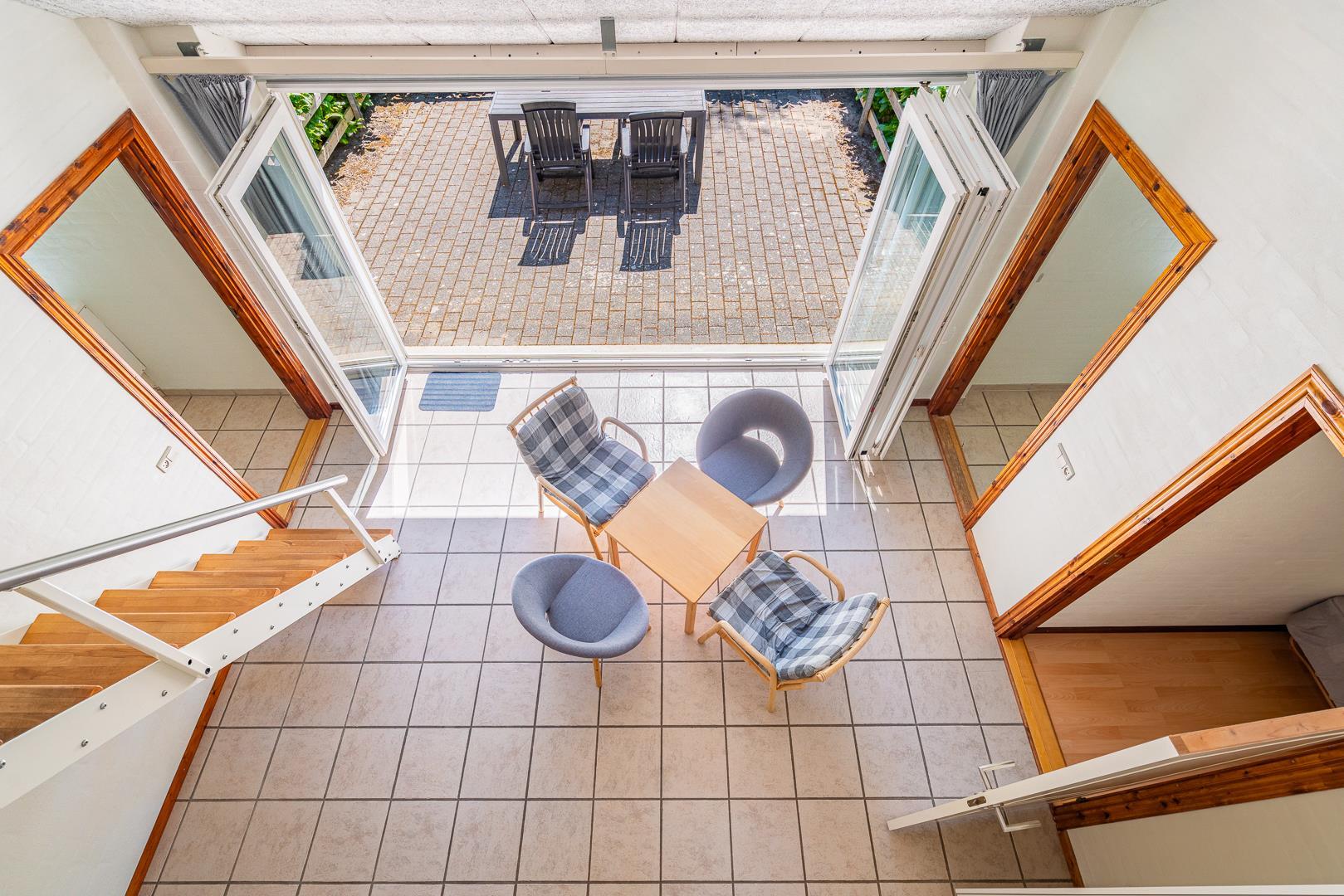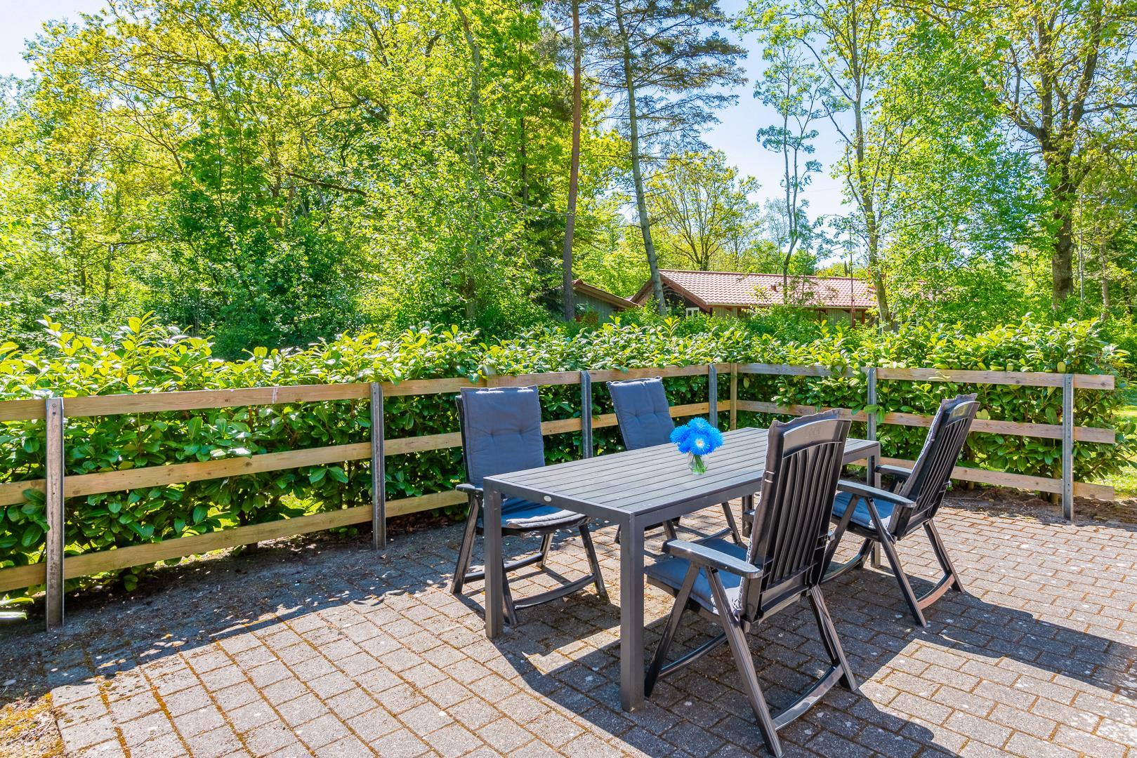 Huset ligger naturskønt på en stor lukket grund, hvor haven er omkranset af træer. Her er en dejlig terrasse med havemøbler, grill og parasol. I haven finder du også et gyngestativ til børnene.