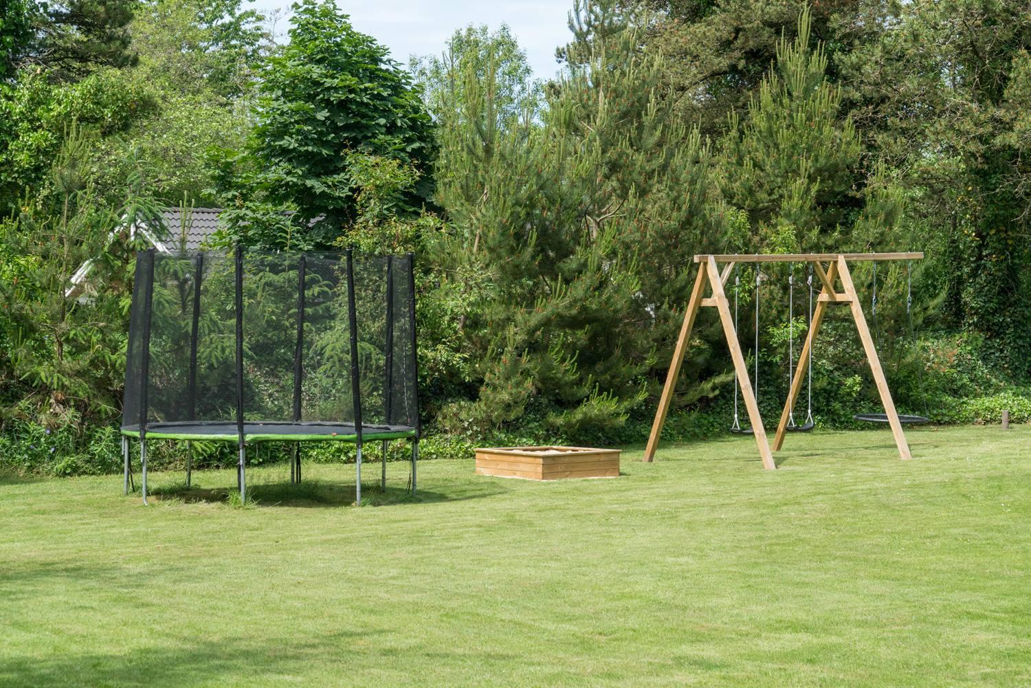 Børnene vil elske haven med gynge, sandkasse og trampolin, mens de voksne kan slappe af i solen eller med en god bog. Et redskabsskur giver praktisk opbevaringsplads til cykler, barnevogn eller strandudstyr.