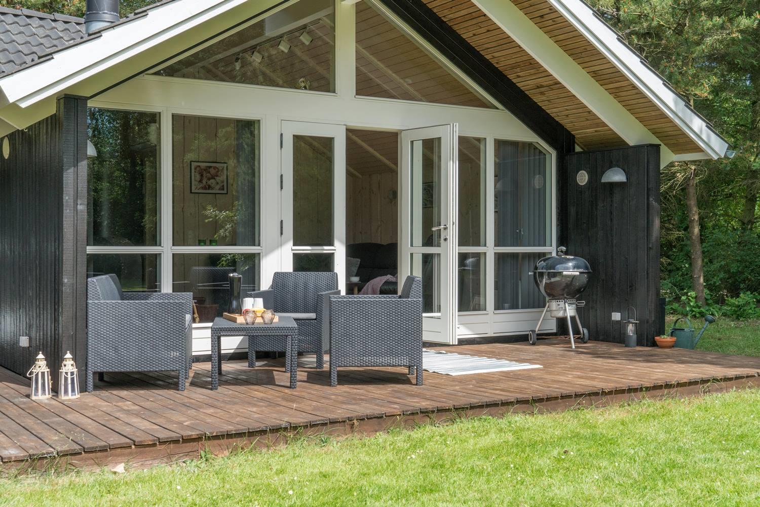 Udendørsområdet er som skabt til familier og naturelskere. På den store naturgrund er der masser af plads til leg og afslapning. Den overdækkede terrasse giver mulighed for at nyde maden i det fri – uanset vind og vejr – hvad enten det er morgenkaffe med fuglefløjt eller en hyggelig aften med god mad.