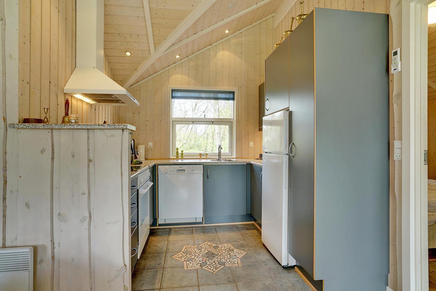 Det åbne køkken er veludstyret med opvaskemaskine, moderne køkkenredskaber og gulvvarme – så her er både funktionalitet og komfort. Ved spisebordet kan hele familien samles til hyggelige måltider eller brætspil efter en dag i naturen.