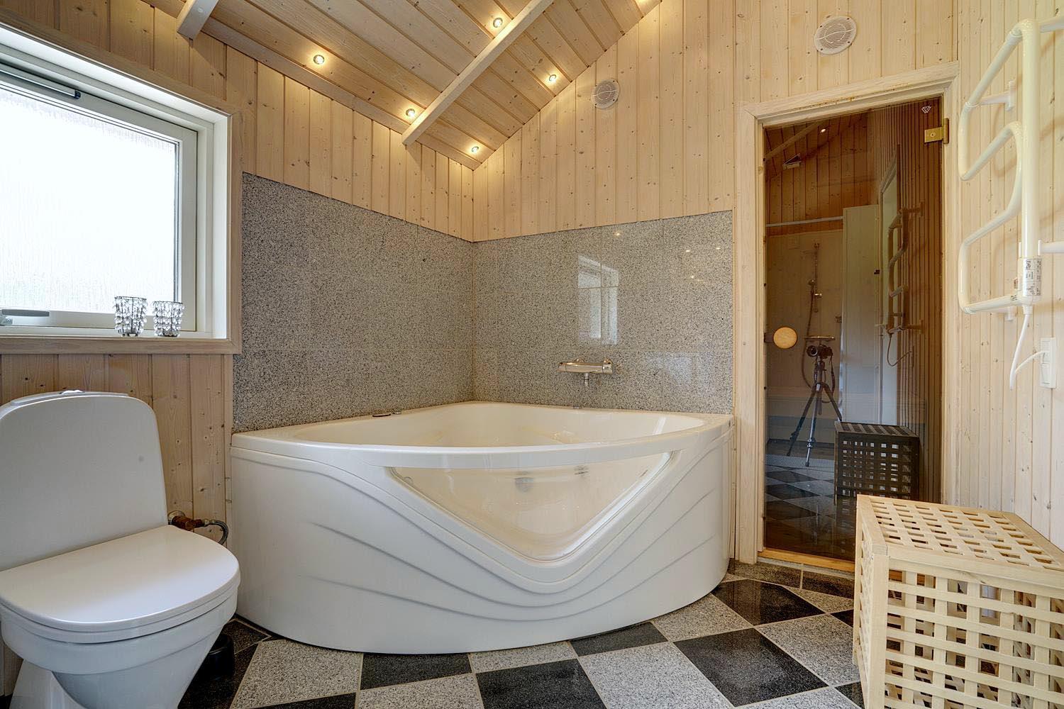 Sommerhuset har tre soveværelser – ét med dobbeltseng, ét med to enkeltsenge og ét med køjeseng, som især børnene vil elske. Badeværelset fungerer som en lille wellness-oase med gulvvarme, spa og sauna – det perfekte sted at slappe af efter en dag ved havet eller en gåtur i skoven.