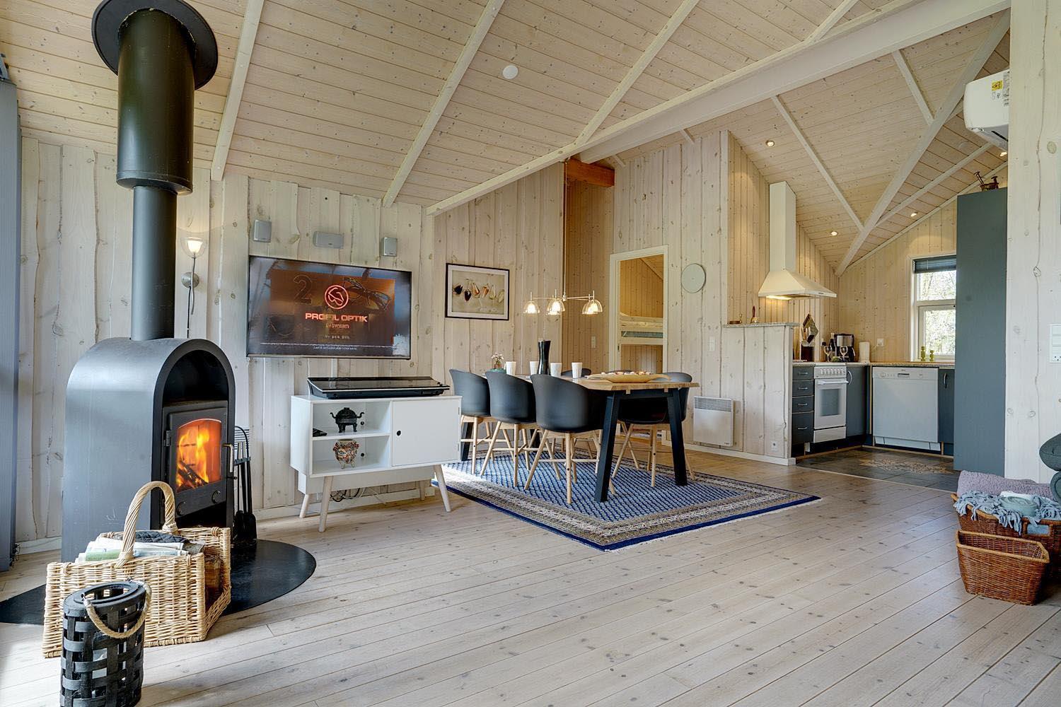 Den lyse stue er sommerhusets naturlige samlingspunkt, hvor køkken, spiseplads og sofaområde smelter sammen til ét – perfekt til samvær og afslapning. Brændeovnen spreder varme og stemning på kølige dage, mens varmepumpen sørger for et behageligt indeklima året rundt.