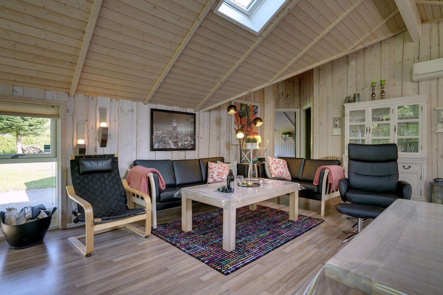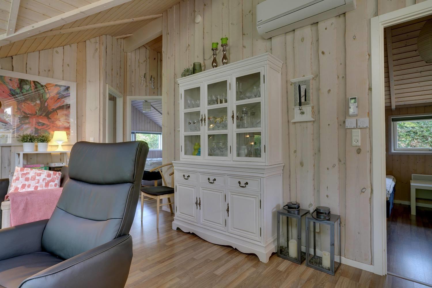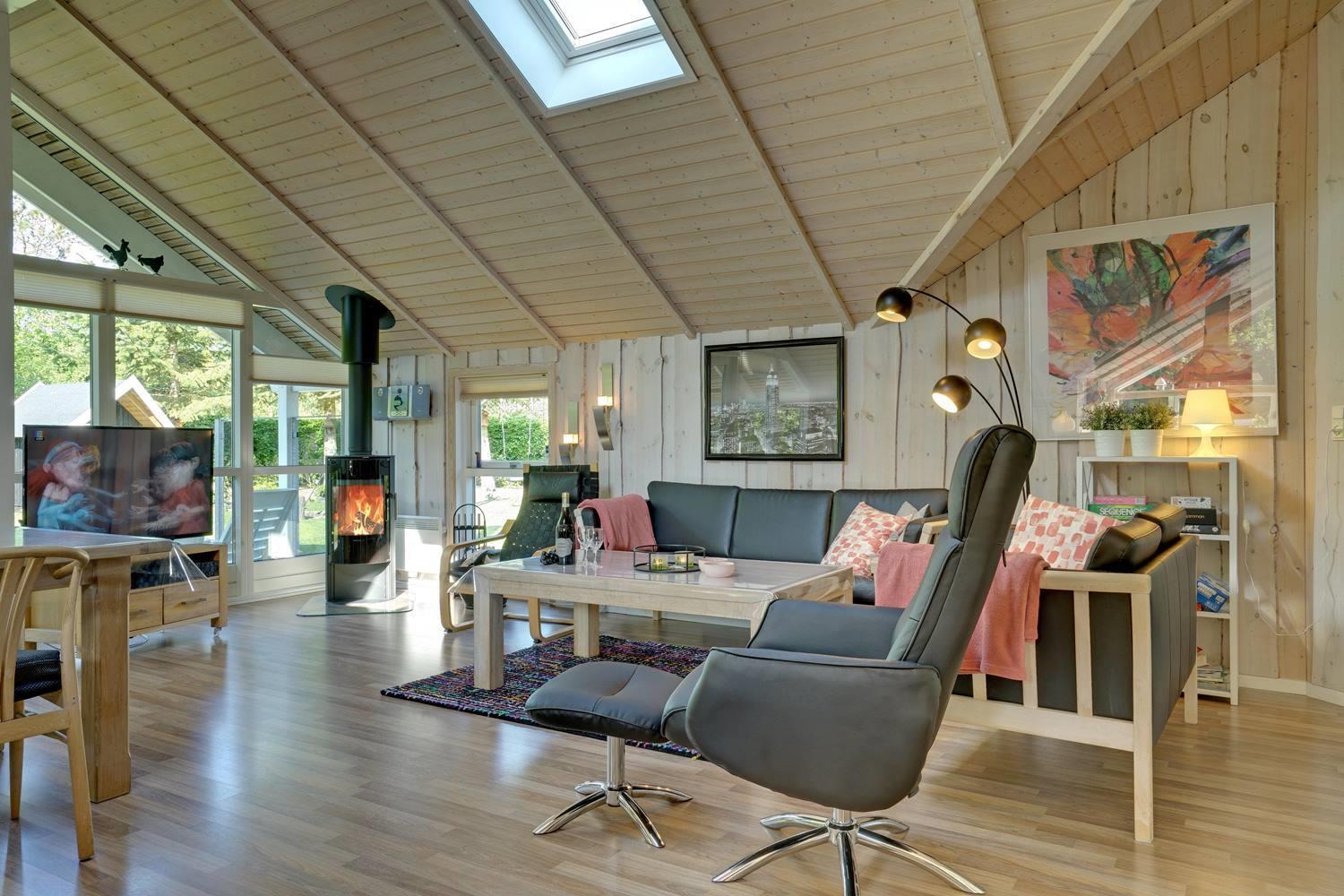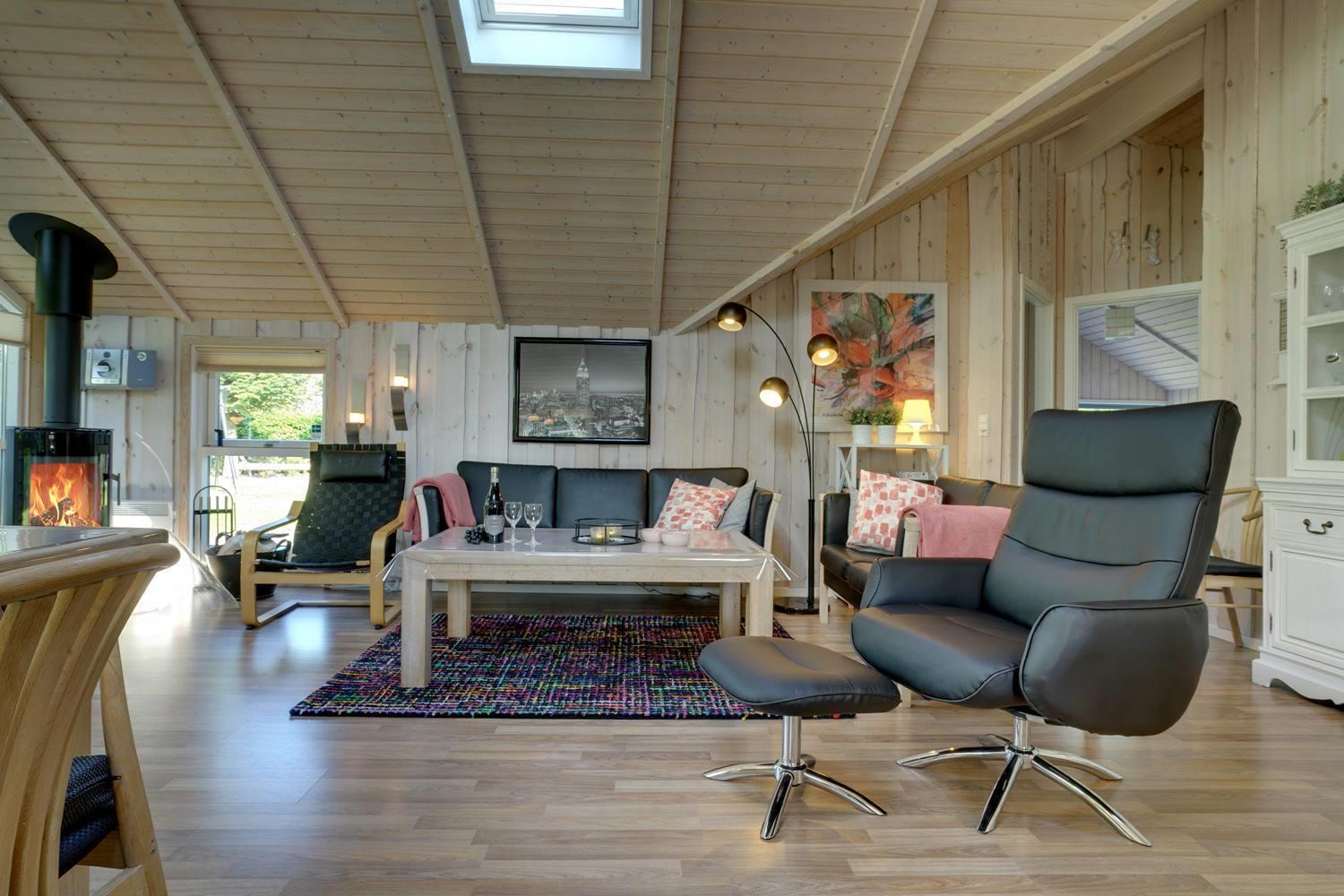 Husets naturlige samlingspunkt er den lyse opholdsstue, hvor brændeovnen spreder varme og ægte feriestemning. En energivenlig varmepumpe sikrer et behageligt indeklima året rundt.