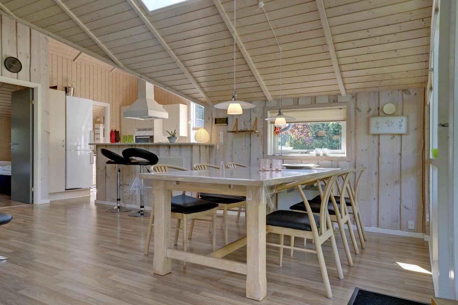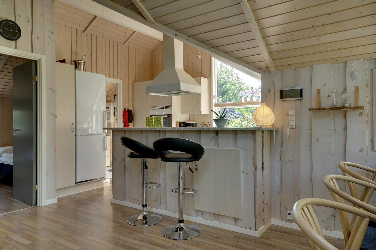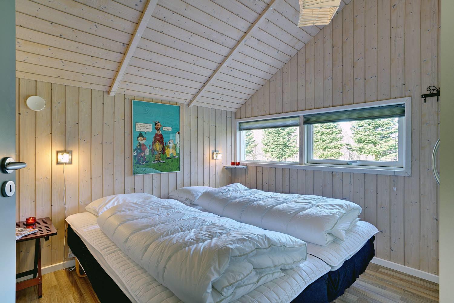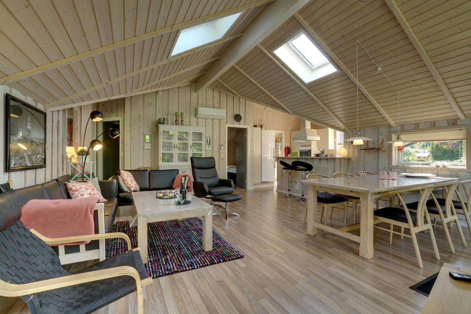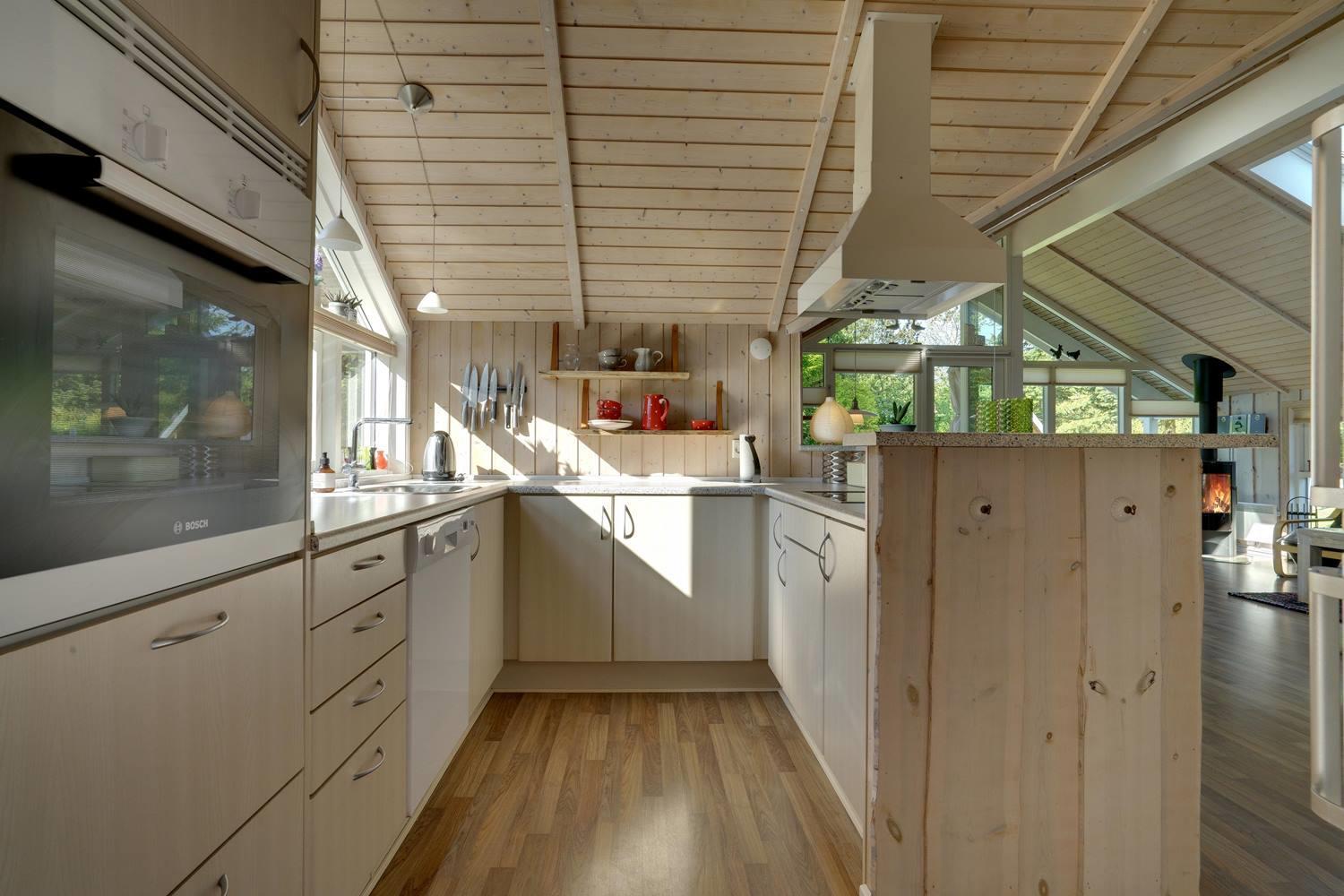Husets naturlige samlingspunkt er den lyse opholdsstue, hvor brændeovnen spreder varme og ægte feriestemning. En energivenlig varmepumpe sikrer et behageligt indeklima året rundt.